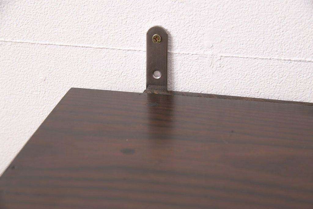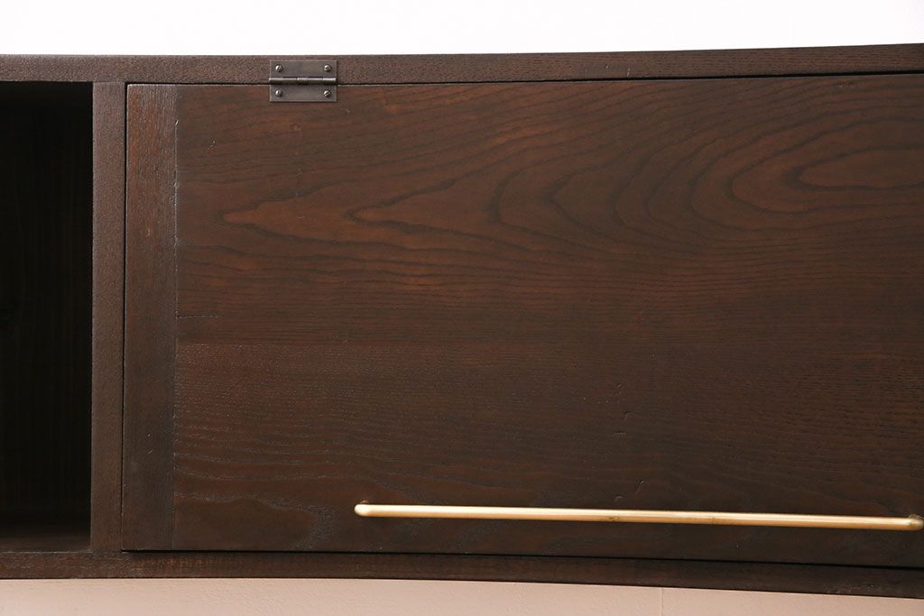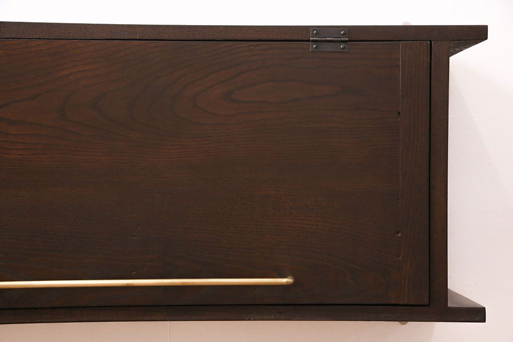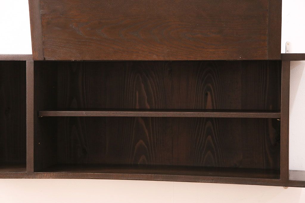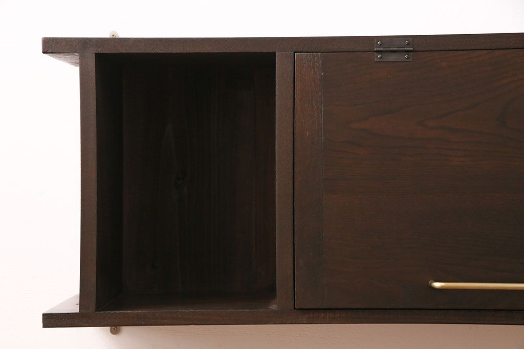 フルオーダー家具実績 > ウォールシェルフを新規製作!右側のみパタパタ扉、取っ手を取り付け。取り外し可能な棚板を設置。濃い茶色で着色し仕上げ。(吊り戸棚)