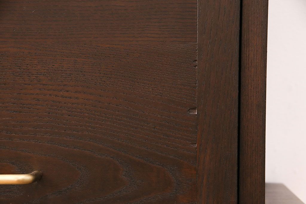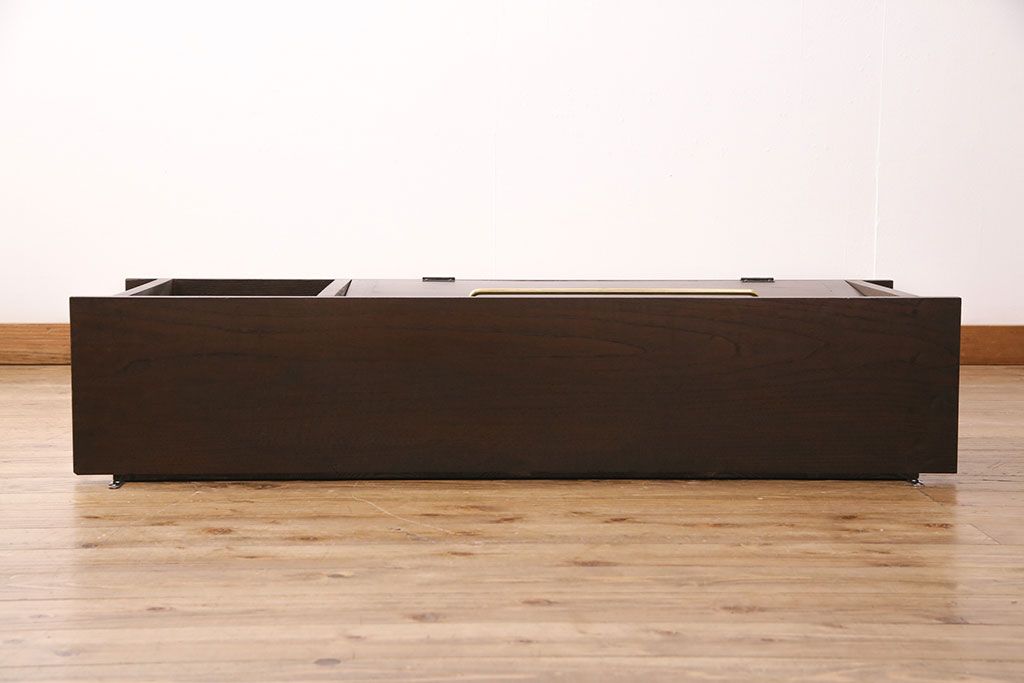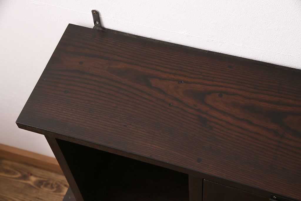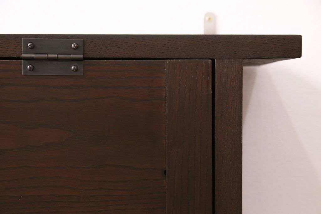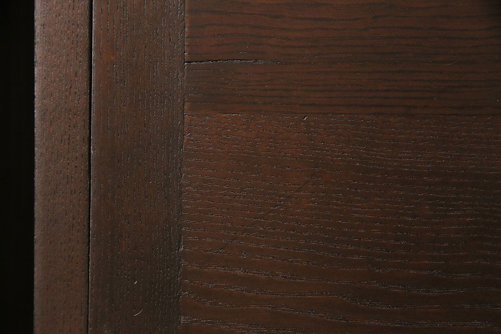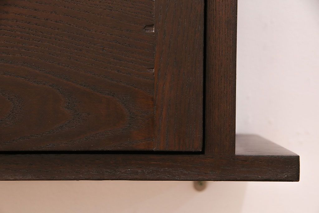 フルオーダー家具実績 > ウォールシェルフを新規製作!右側のみパタパタ扉、取っ手を取り付け。取り外し可能な棚板を設置。濃い茶色で着色し仕上げ。(吊り戸棚)