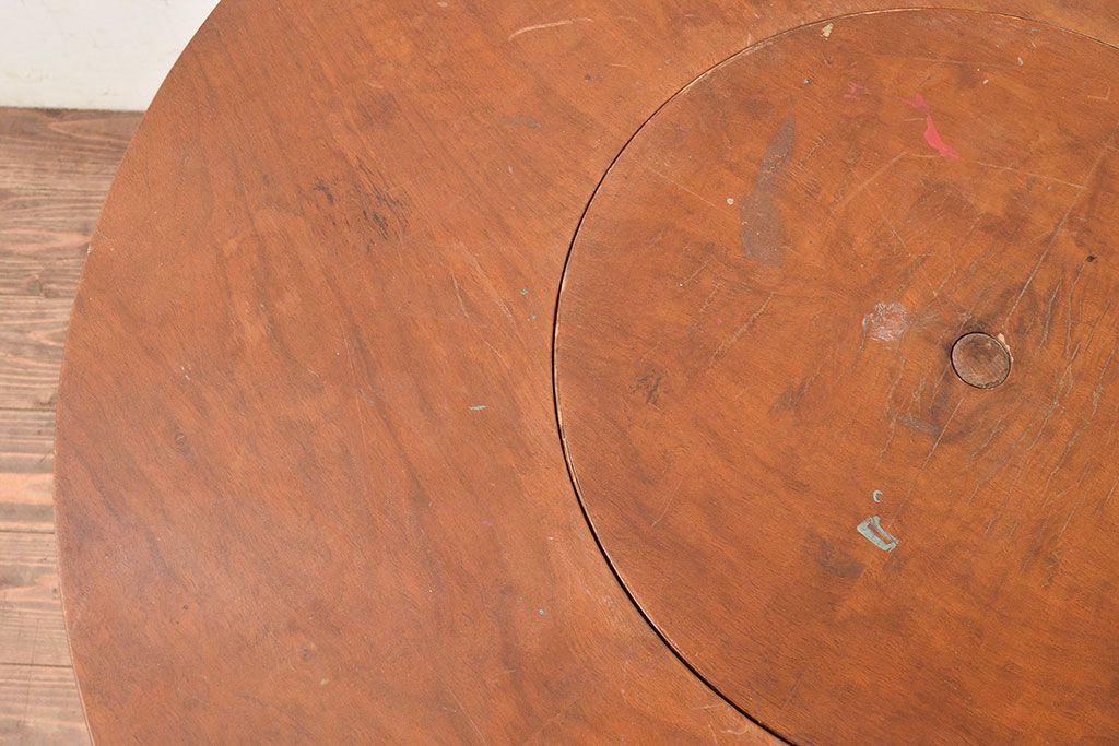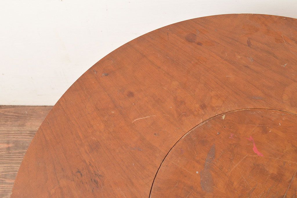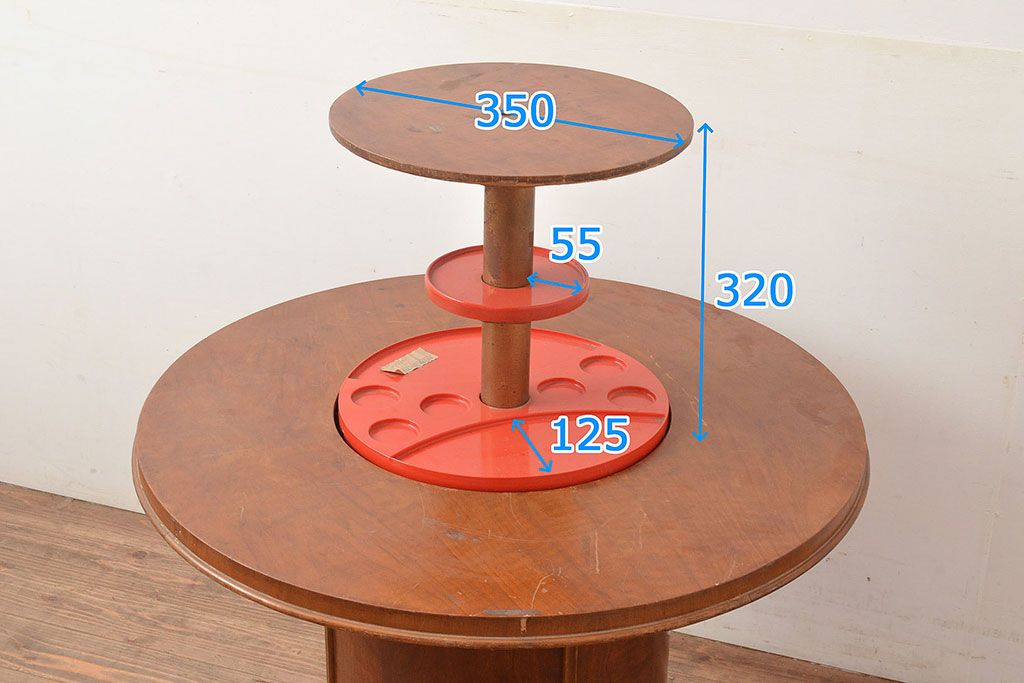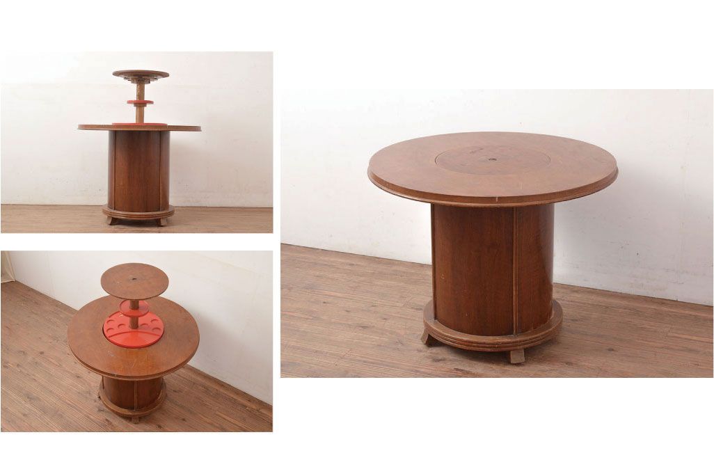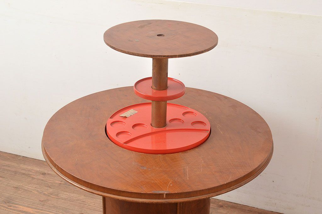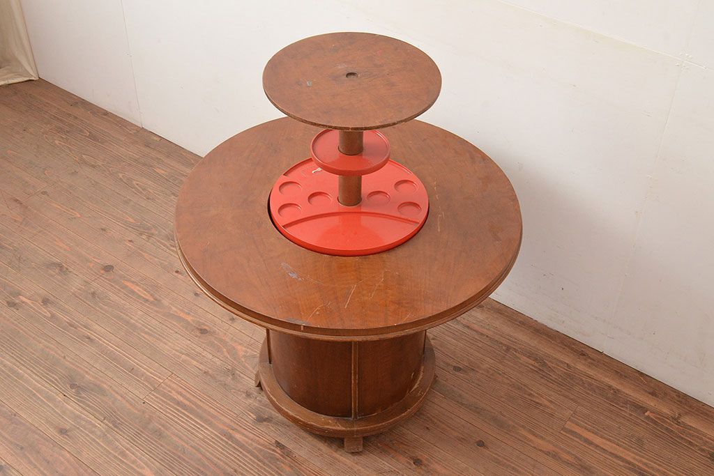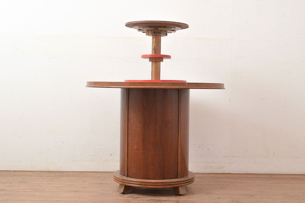 ラフジュ工房> テーブル> 丸テーブル > 和製ヴィンテージ 珍品 店舗什器におすすめ!可動式の棚が付いた変わったつくりのセンターテーブル(ラウンドテーブル、ビンテージ)(R-048400)