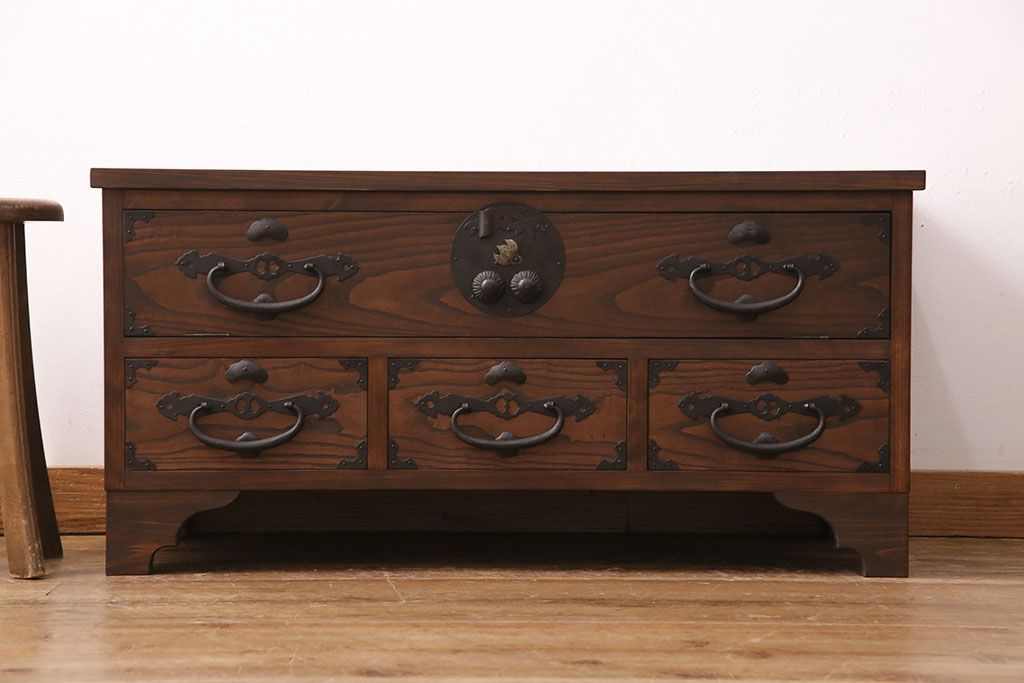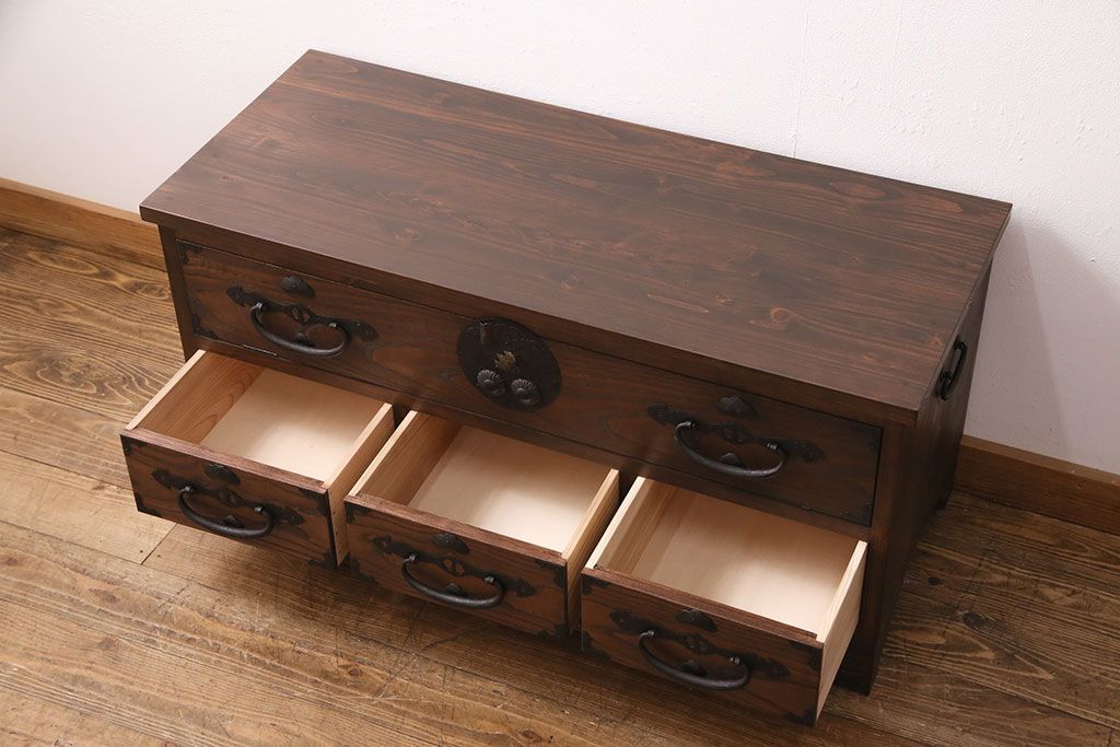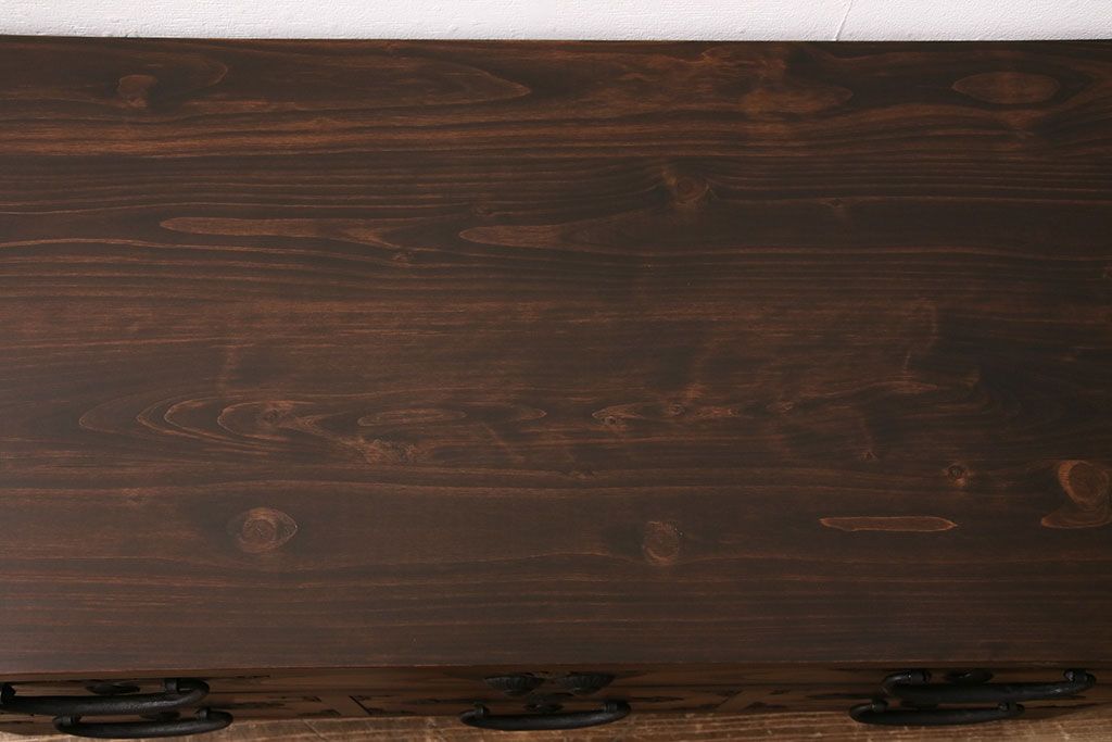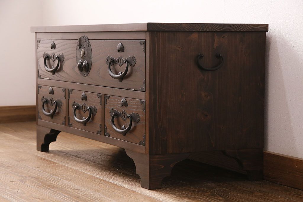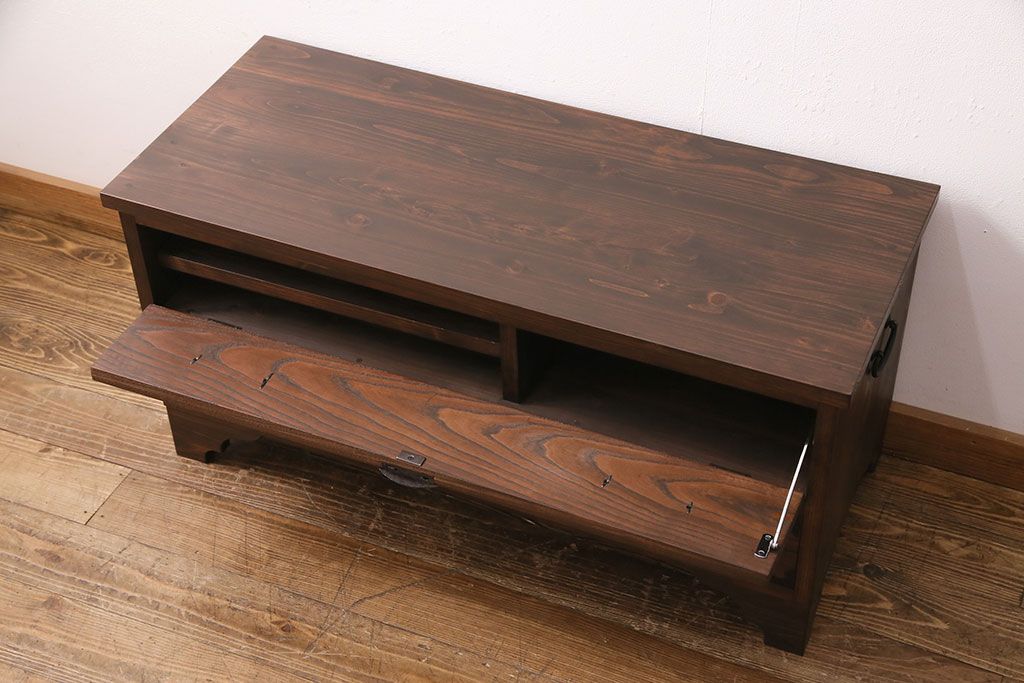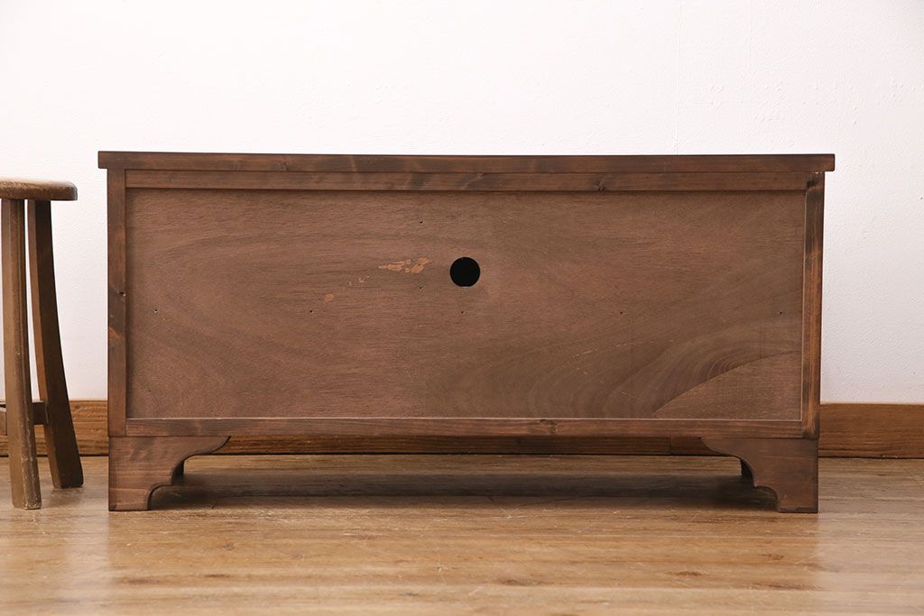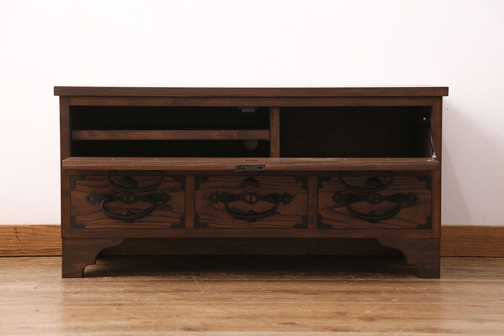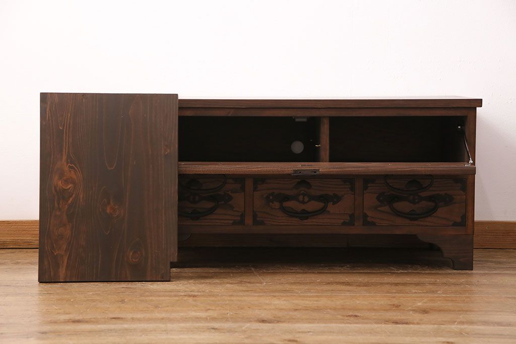 チェスト・引き出し> ローチェスト > テレビ台を新規製作!本体はヒノキ材、引き出し前板は栗材を使用。フラップダウン式扉の収納と引き出しを製作。アンティークの金具を取り付け。脚はブラケットフィートを取り付け。(ローボード、ローチェスト、二本松箪笥)