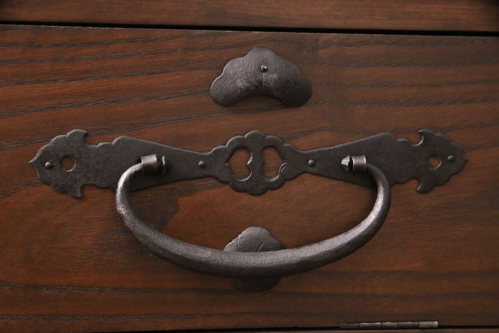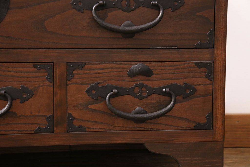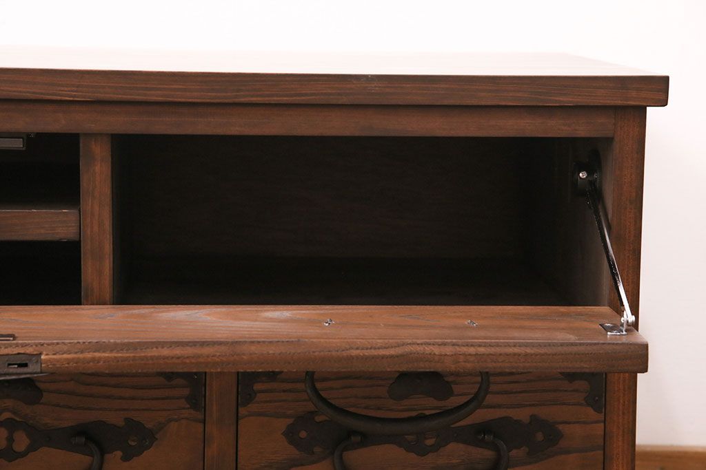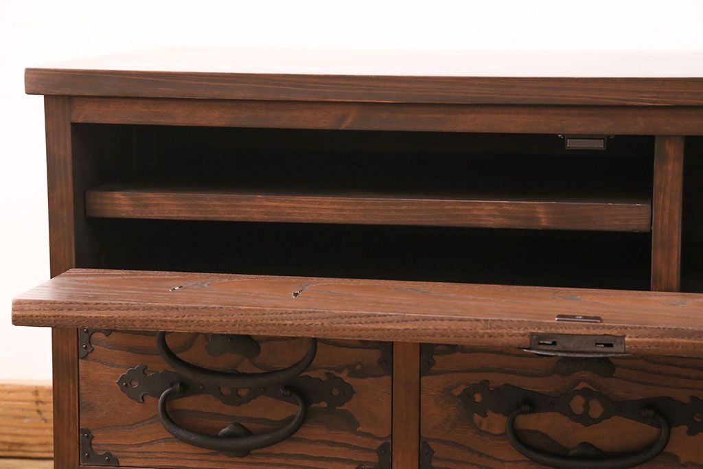 フルオーダー家具実績 > テレビ台を新規製作!本体はヒノキ材、引き出し前板は栗材を使用。フラップダウン式扉の収納と引き出しを製作。アンティークの金具を取り付け。脚はブラケットフィートを取り付け。(ローボード、ローチェスト、二本松箪笥)