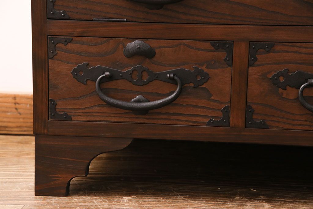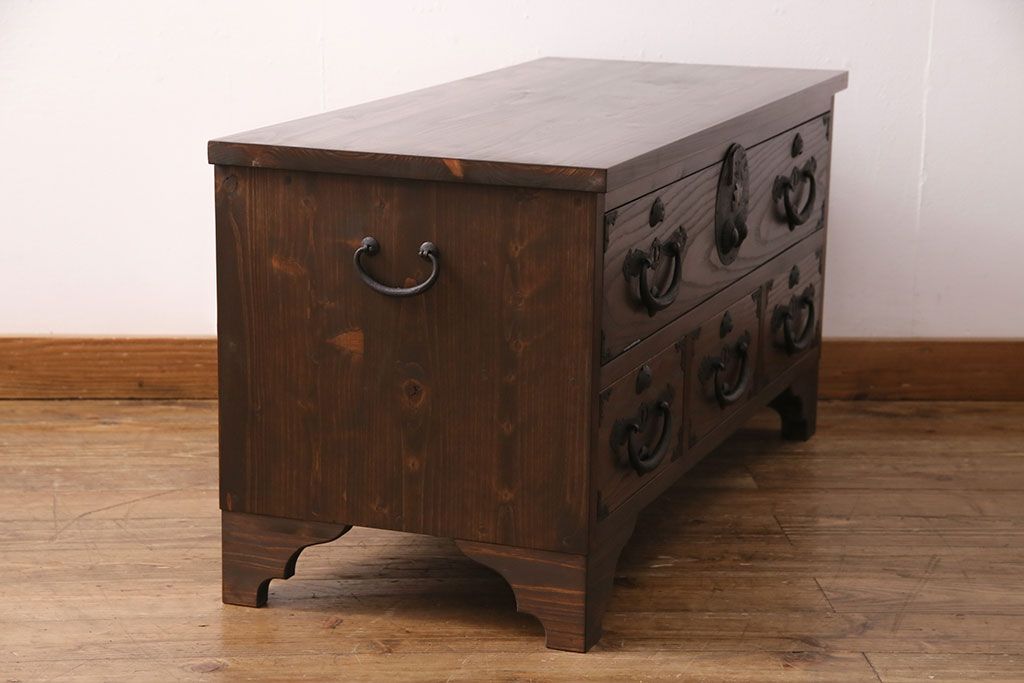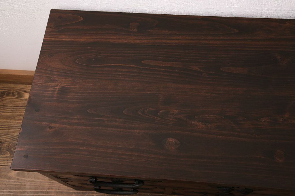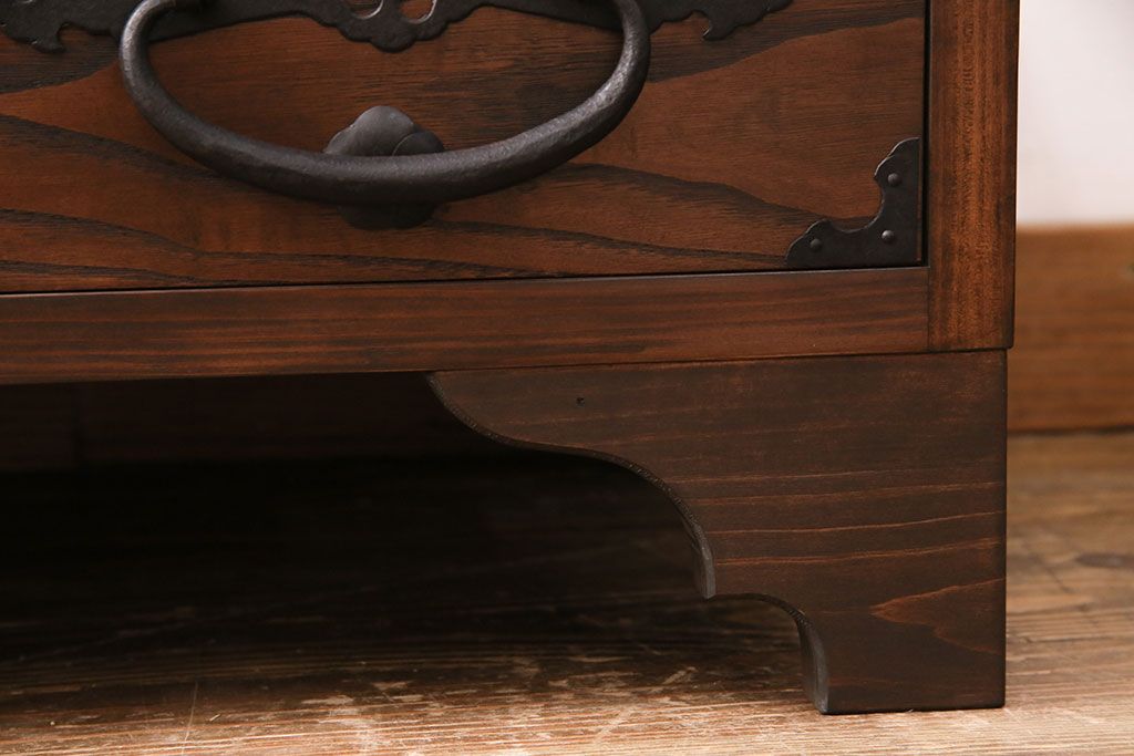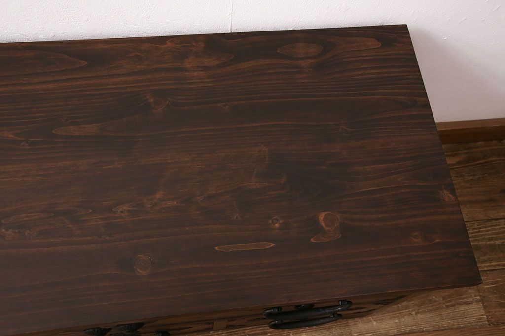 キャビネット・戸棚> テレビ台・ローボード > テレビ台を新規製作!本体はヒノキ材、引き出し前板は栗材を使用。フラップダウン式扉の収納と引き出しを製作。アンティークの金具を取り付け。脚はブラケットフィートを取り付け。(ローボード、ローチェスト、二本松箪笥)