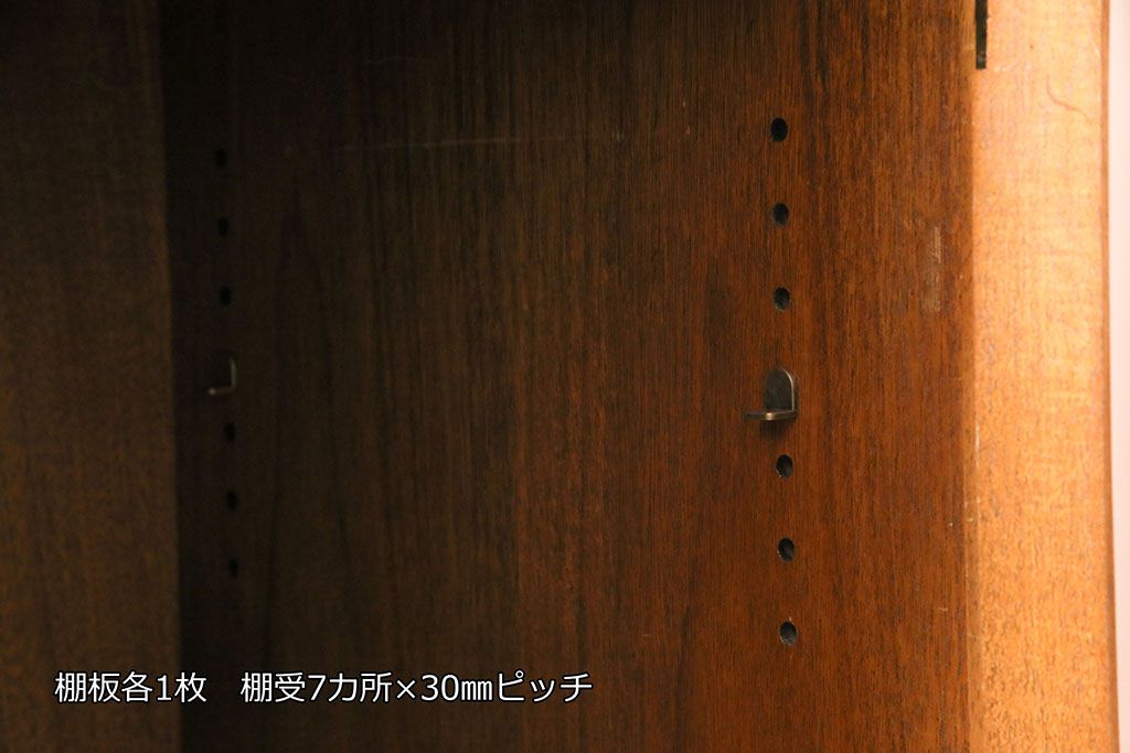 棚板は取り外しできます。棚板は各1枚あります。棚受けは7ヶ所、30mmピッチで調整できます。棚幅サイズのものが1枚の作りです。