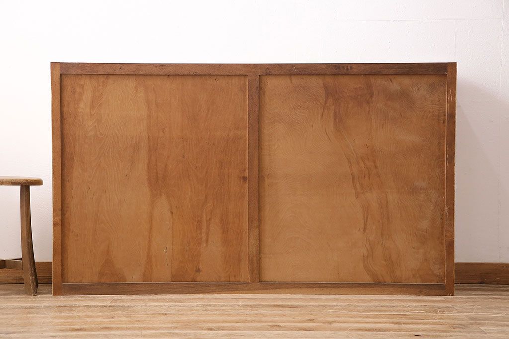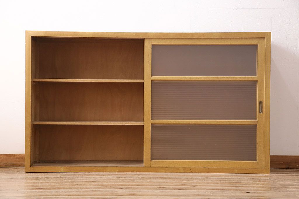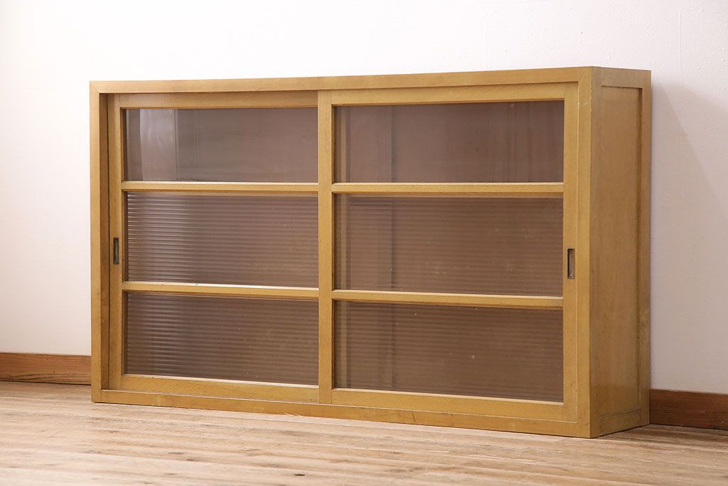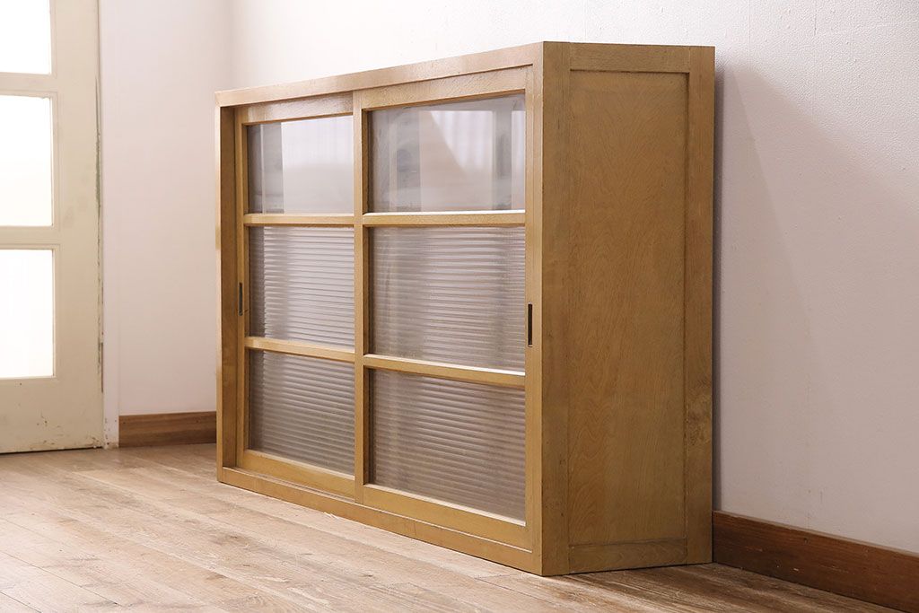 レトロ家具 タモ材合板 人気のモールガラス入り!昭和レトロな佇まいが魅力的な戸棚(サイドボード、ガラス戸棚、収納棚、食器棚)(R-048611)です。