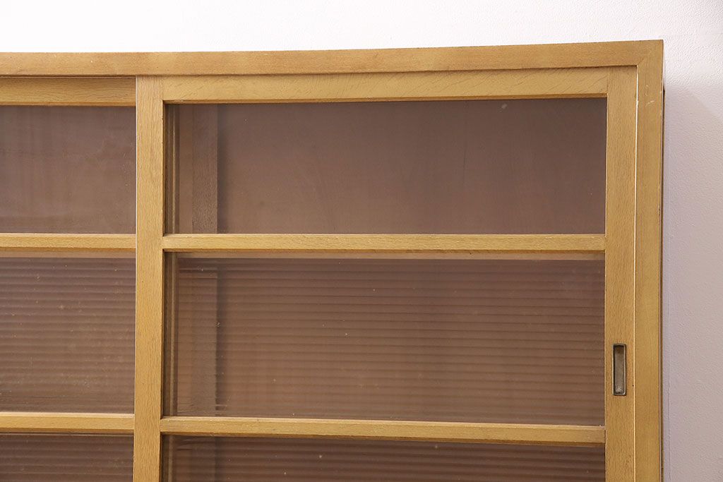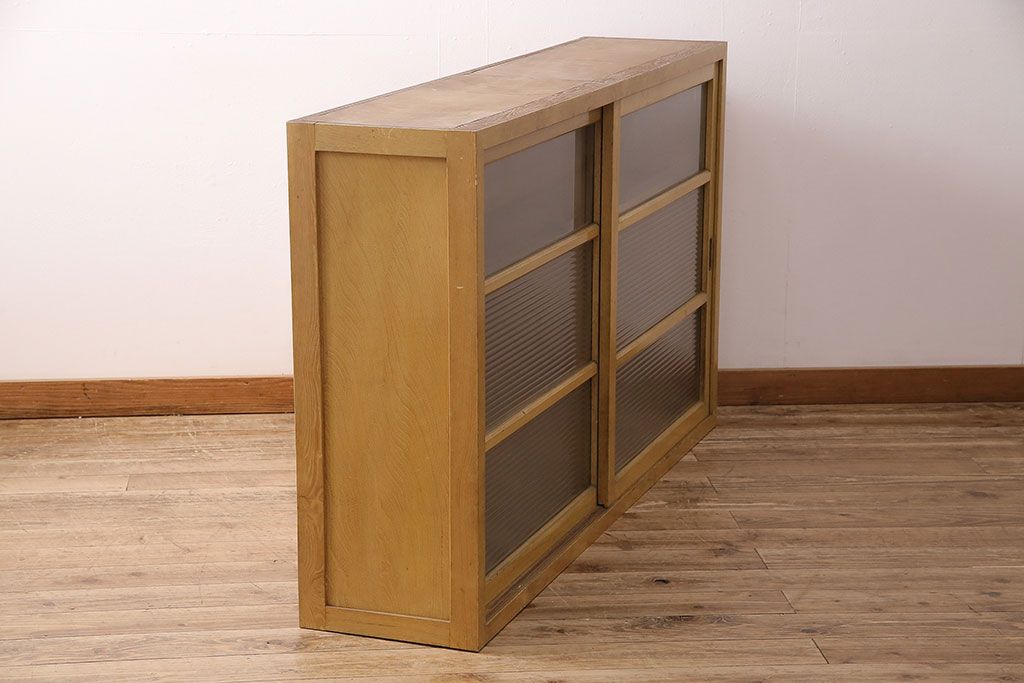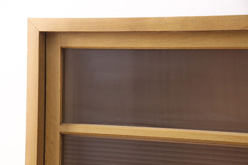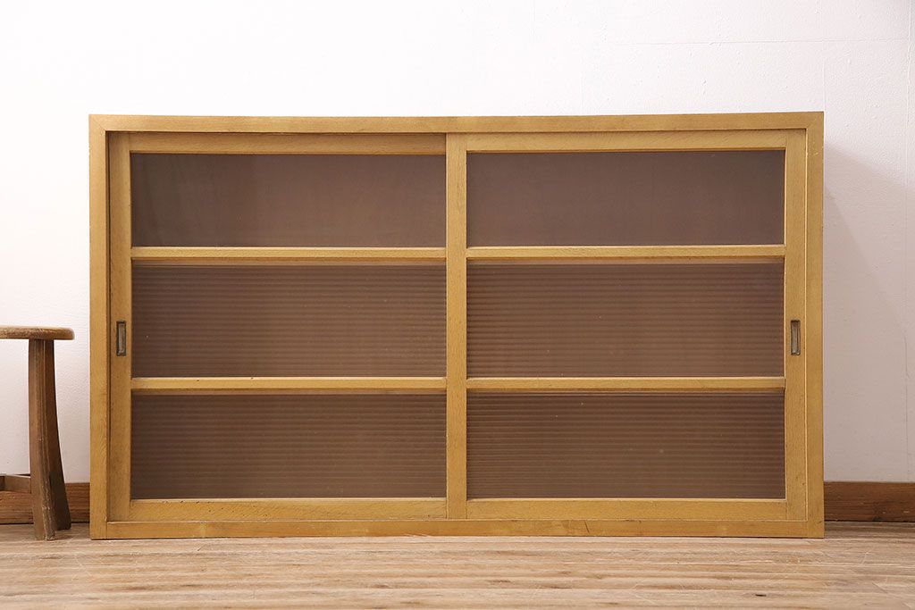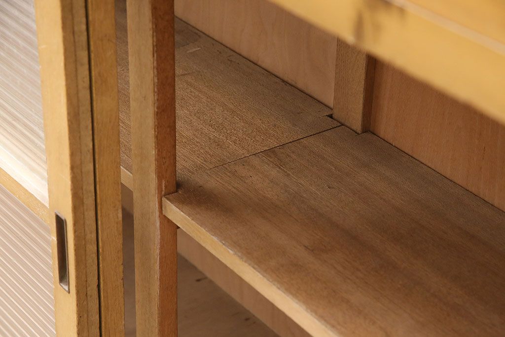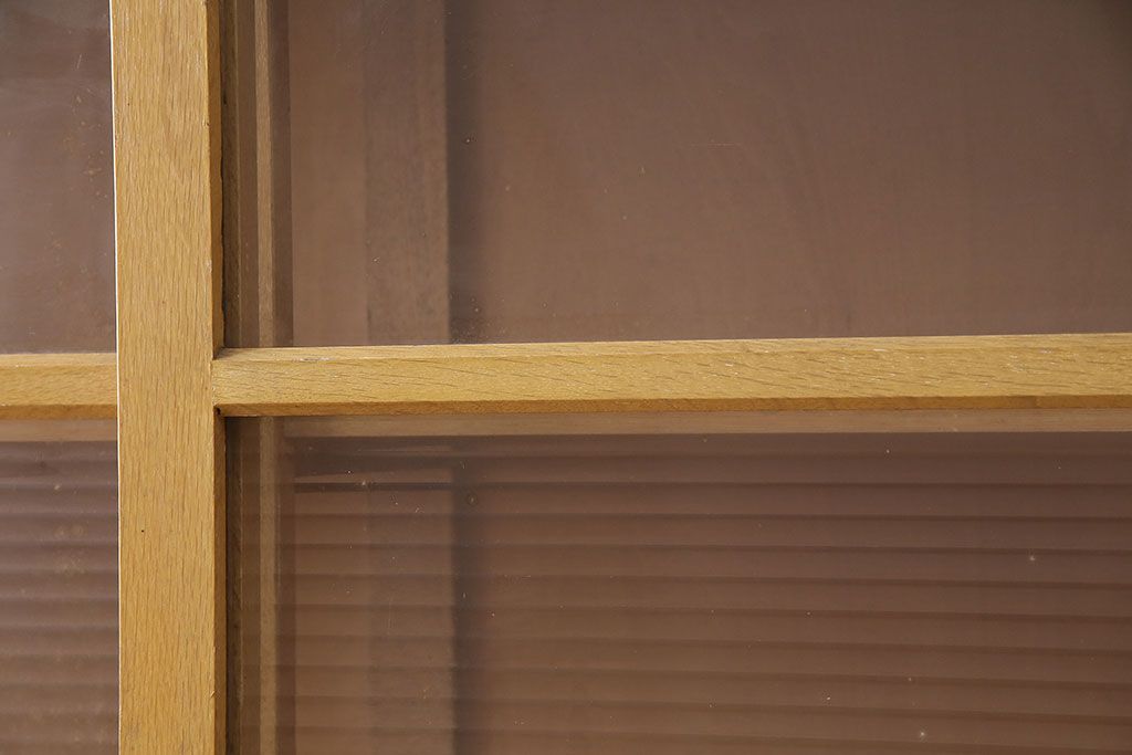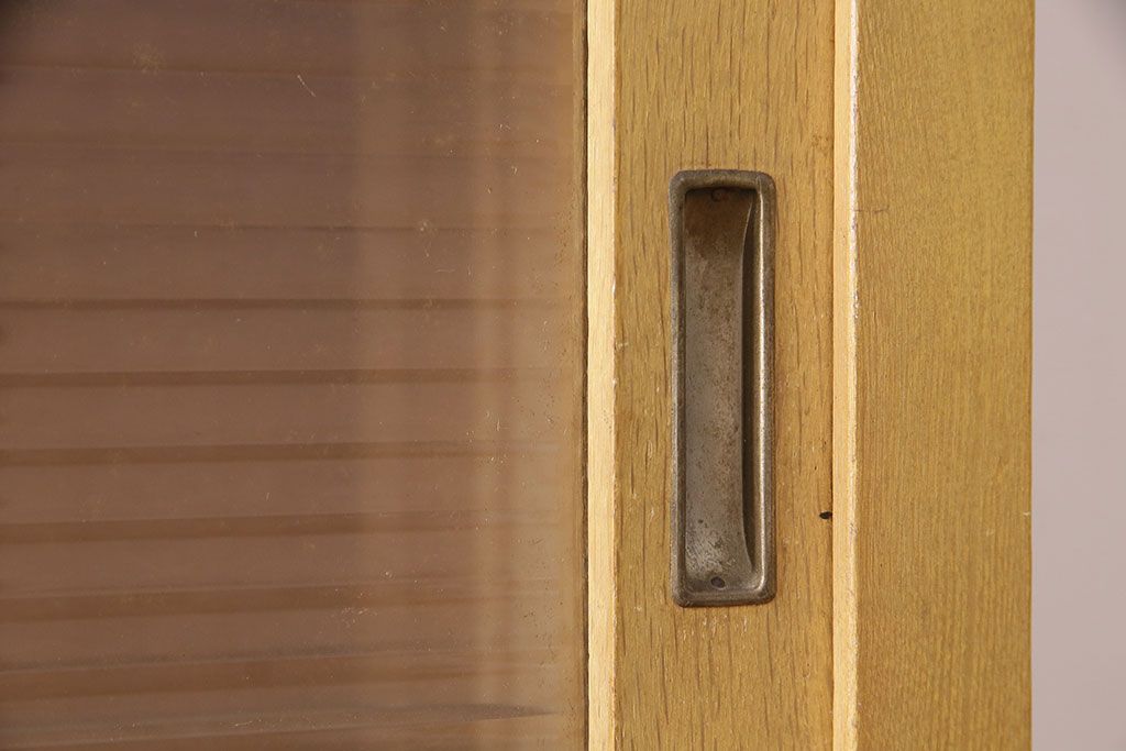 レトロ家具 タモ材合板 人気のモールガラス入り!昭和レトロな佇まいが魅力的な戸棚(サイドボード、ガラス戸棚、収納棚、食器棚)(R-048611)