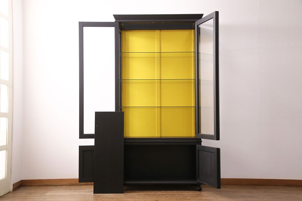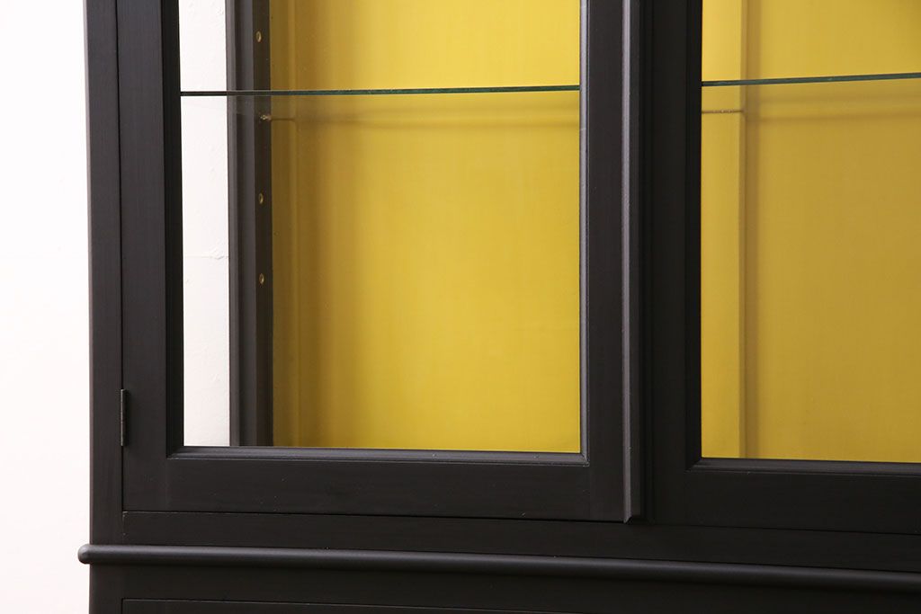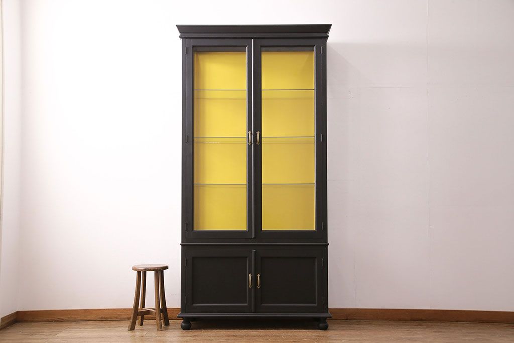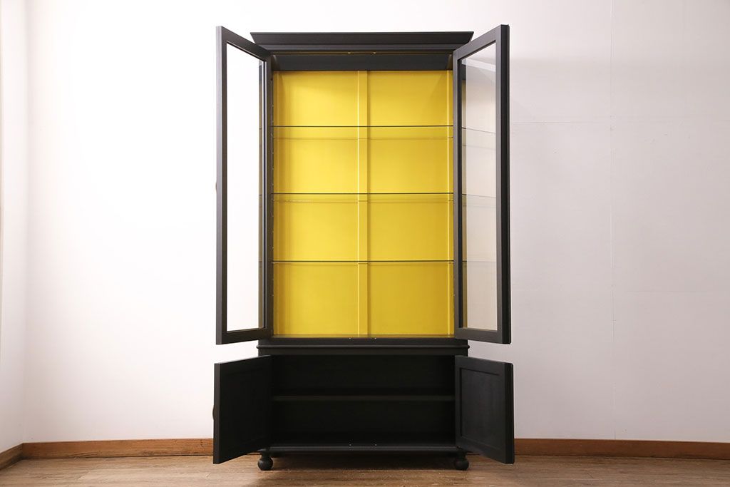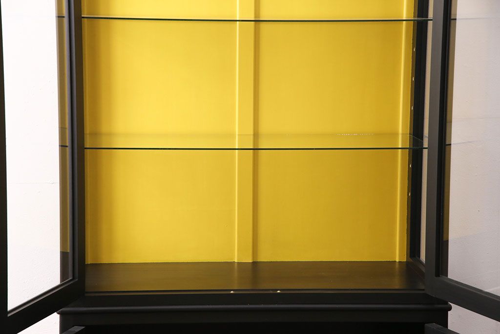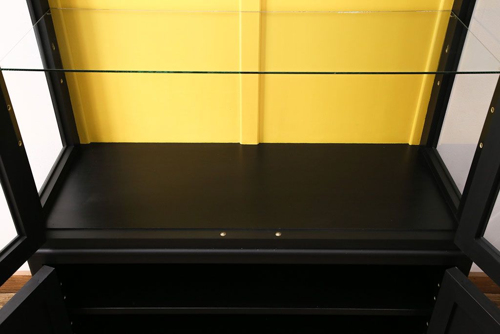 ガラス収納棚を新規製作!上段建具、両サイド、棚板をガラスで製作。本体はマットブラック、収納棚内背板はイエローでペイント仕上げ。(収納棚、キャビネット、飾り棚、カップボード)