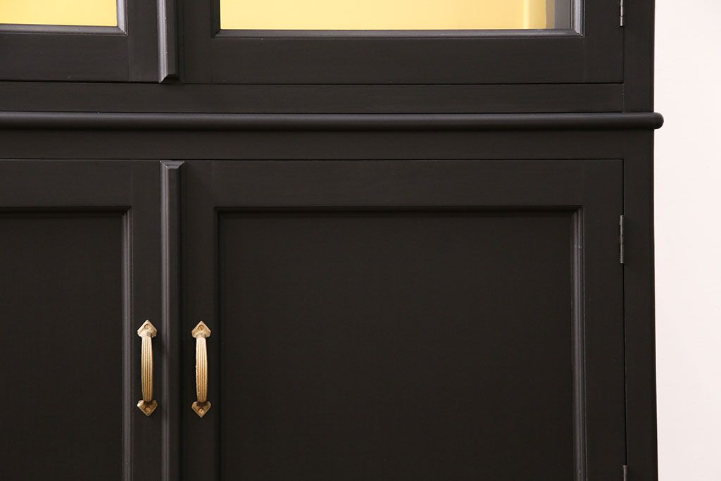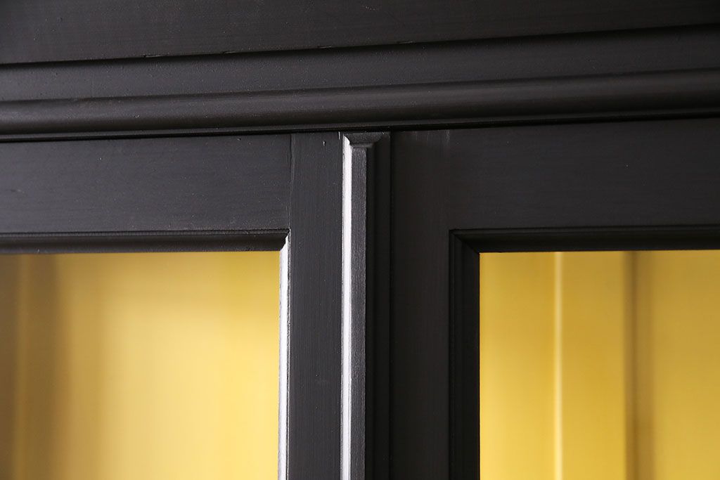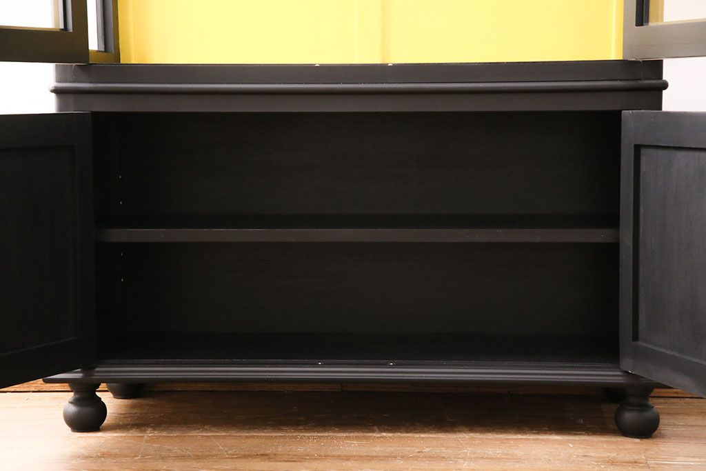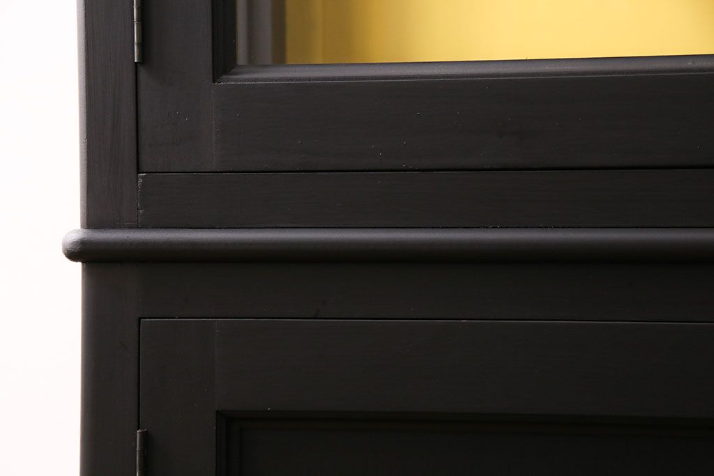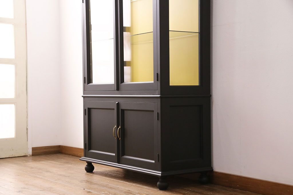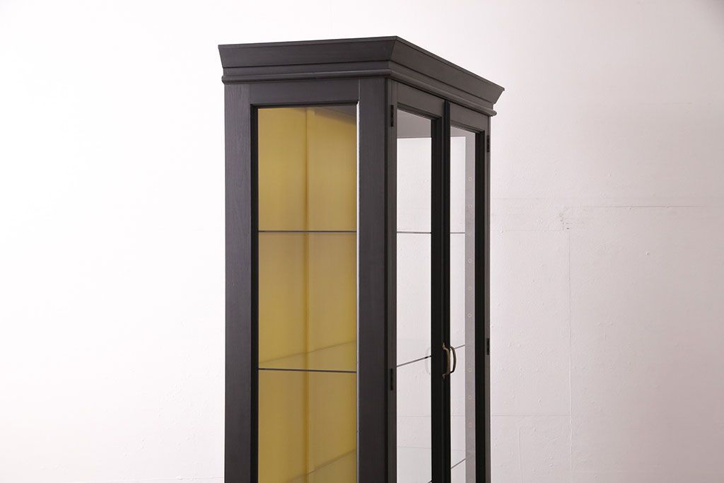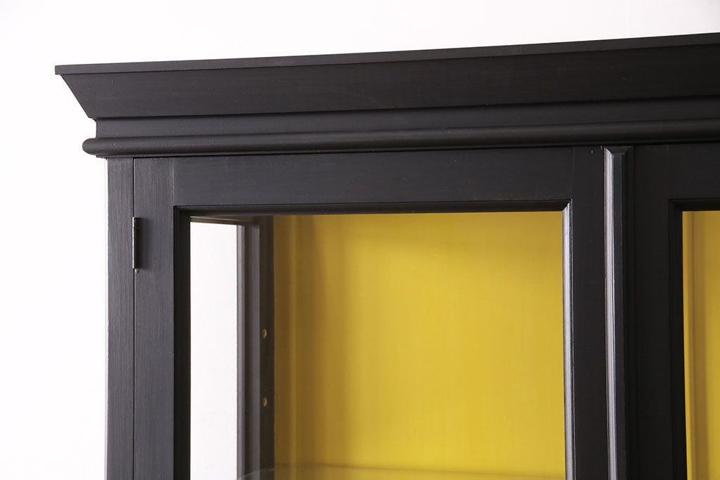 ガラス収納棚を新規製作!上段建具、両サイド、棚板をガラスで製作。本体はマットブラック、収納棚内背板はイエローでペイント仕上げ。(収納棚、キャビネット、飾り棚、カップボード)