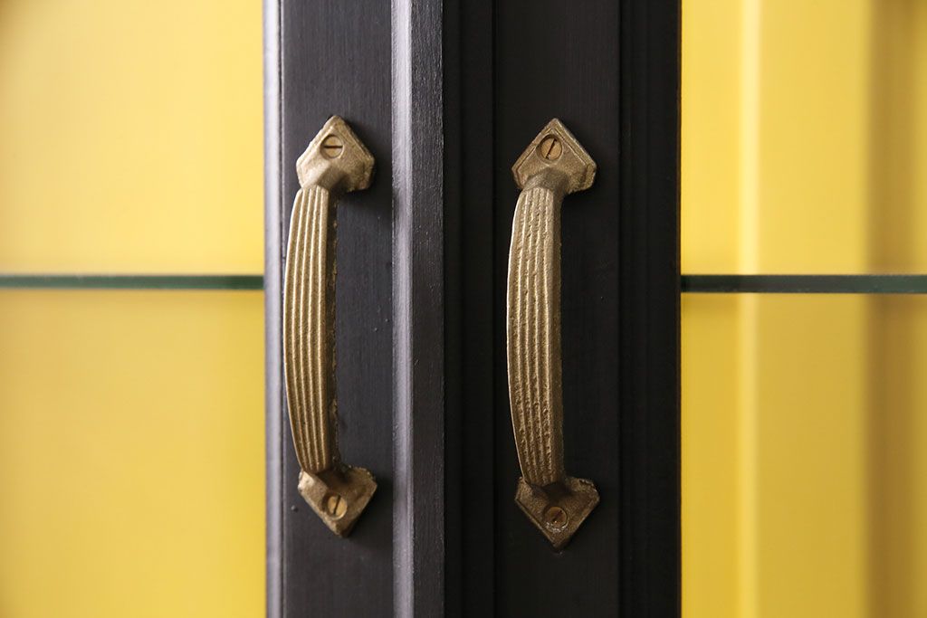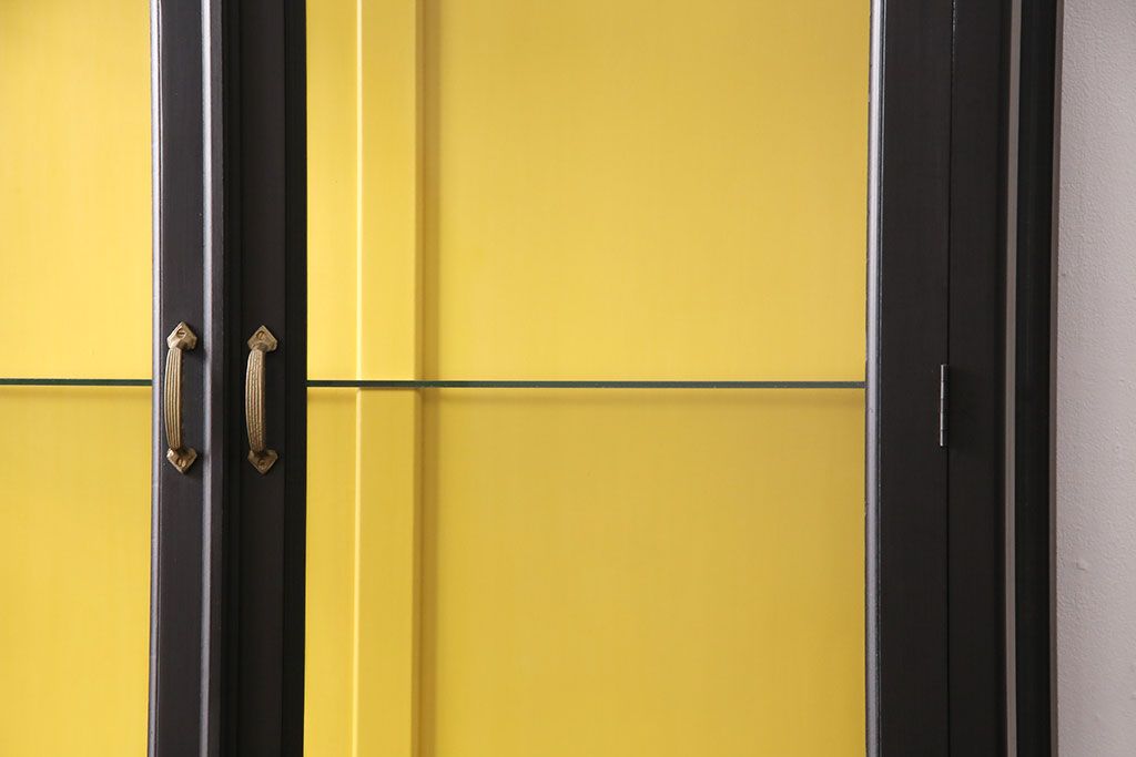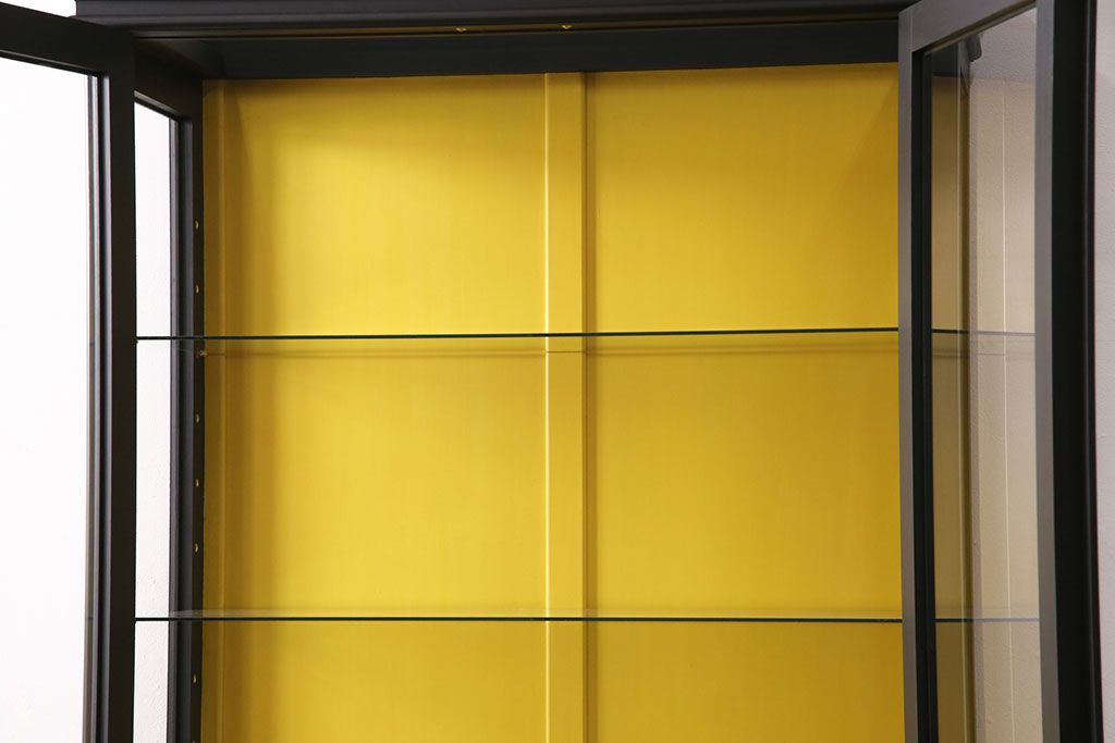 ガラスケース・ショーケース > ガラス収納棚を新規製作!上段建具、両サイド、棚板をガラスで製作。本体はマットブラック、収納棚内背板はイエローでペイント仕上げ。(収納棚、キャビネット、飾り棚、カップボード)