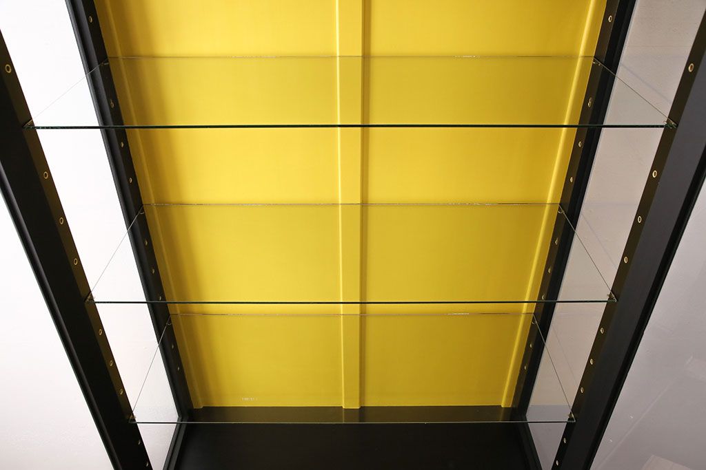 ガラスケース・ショーケース> コレクションケース > ガラス収納棚を新規製作!上段建具、両サイド、棚板をガラスで製作。本体はマットブラック、収納棚内背板はイエローでペイント仕上げ。(収納棚、キャビネット、飾り棚、カップボード)