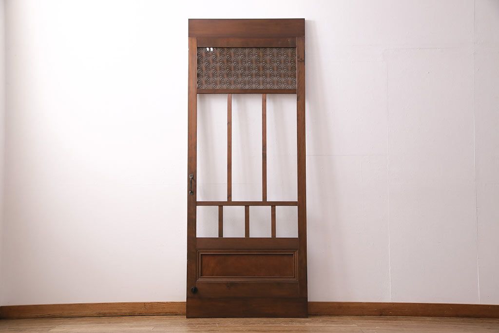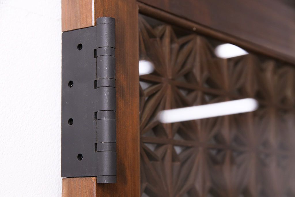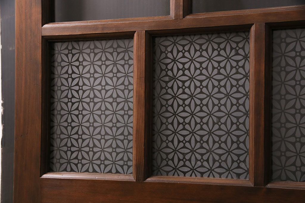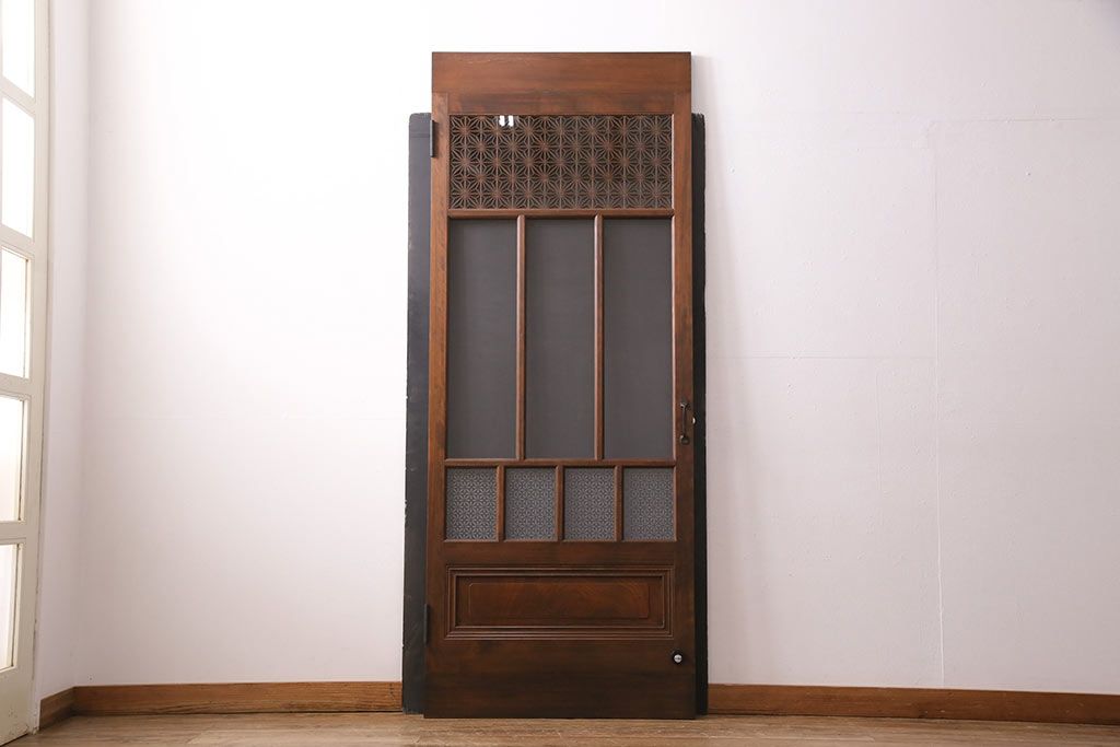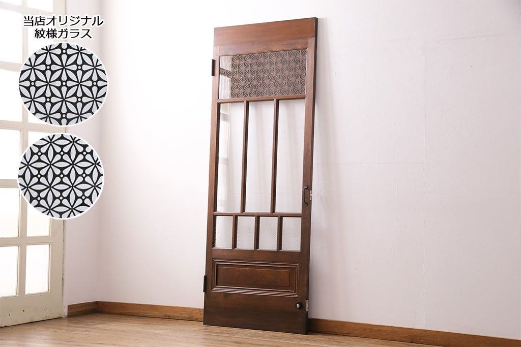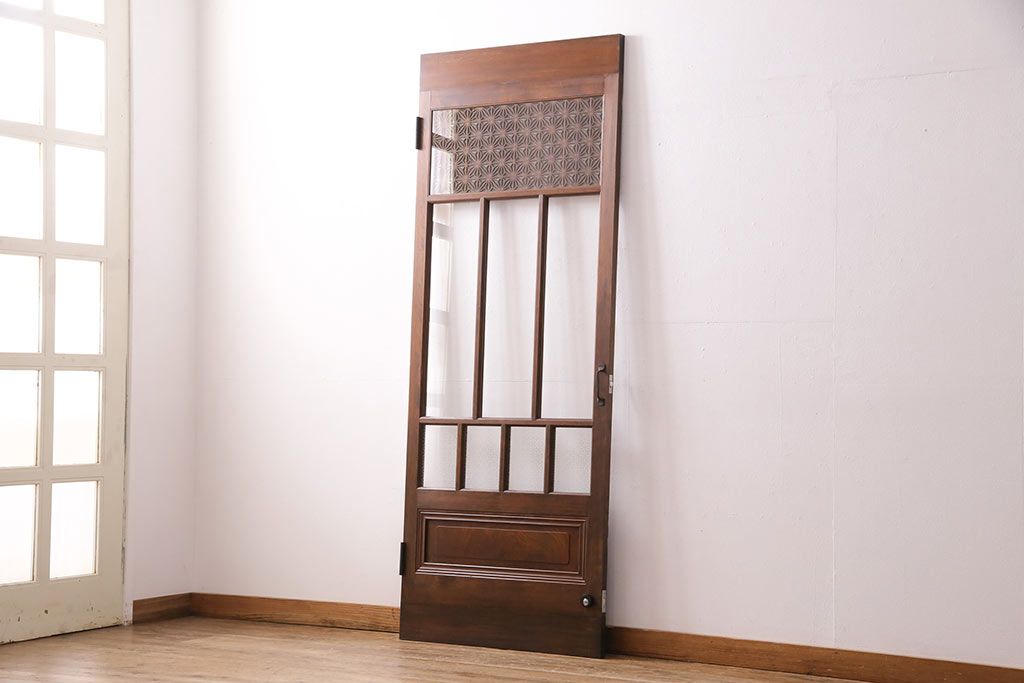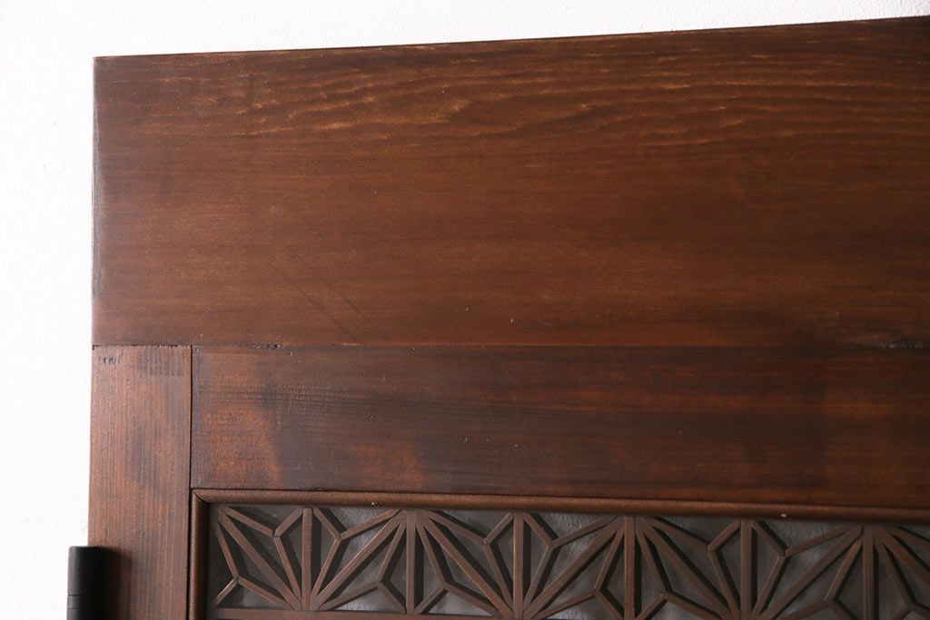 組子細工入り木製ドアをリペア&カスタム!設置場所に合わせてリサイズ。鍵、取っ手、蝶番、ローラー締りを取り付け。クリアガラス、花菱模様ガラス、変わり花菱模様ガラスを組み入れ。当店商品を参考に着色し仕上げ。(玄関ドア、建具)