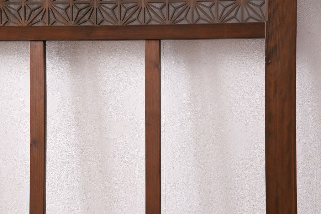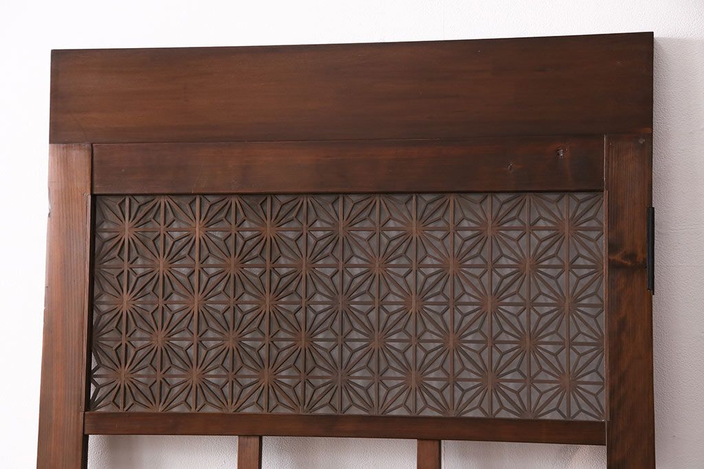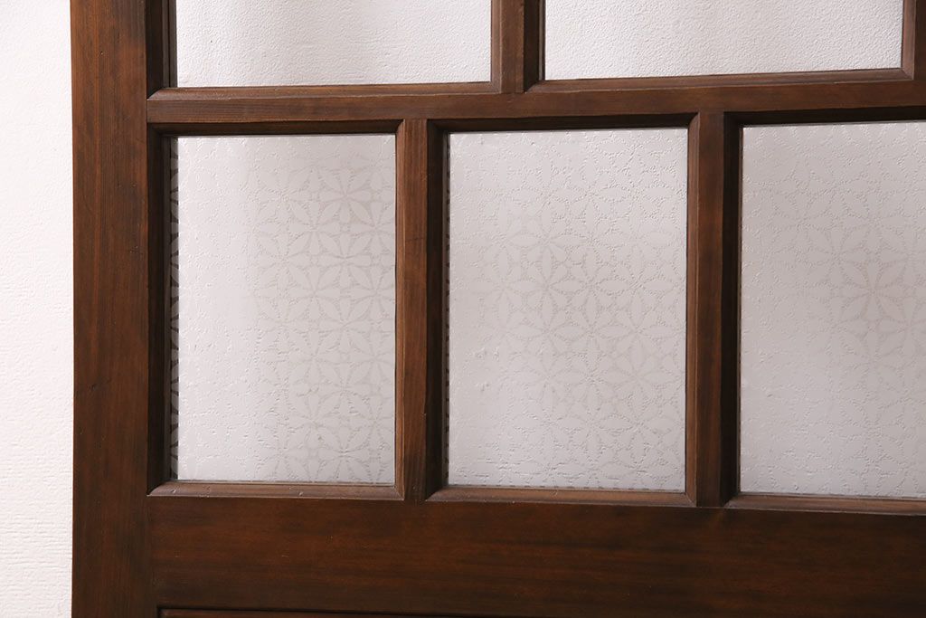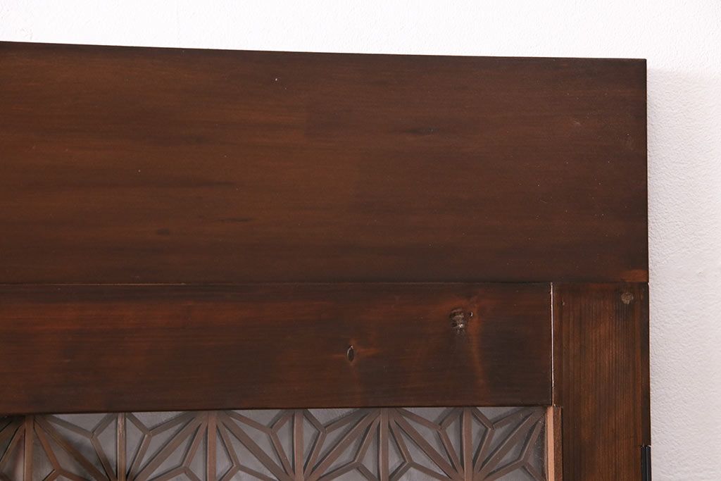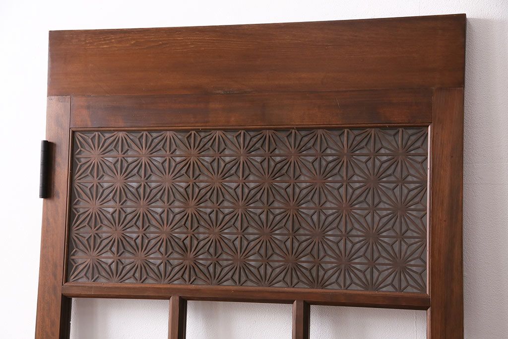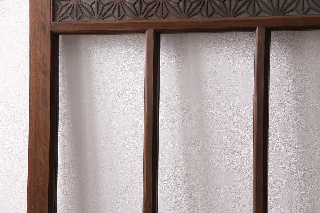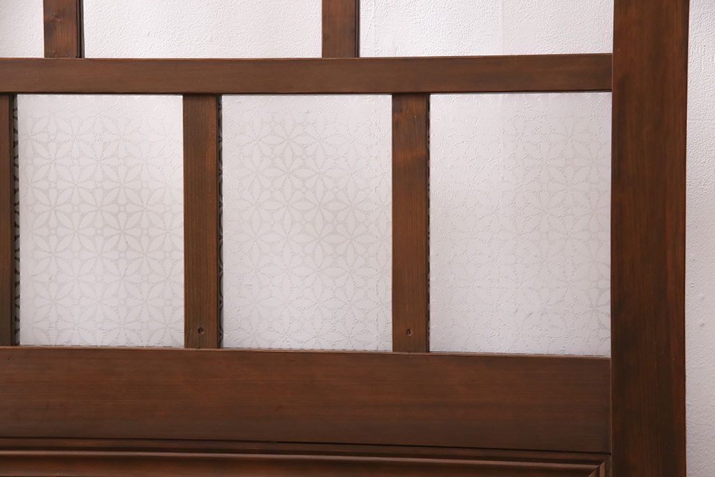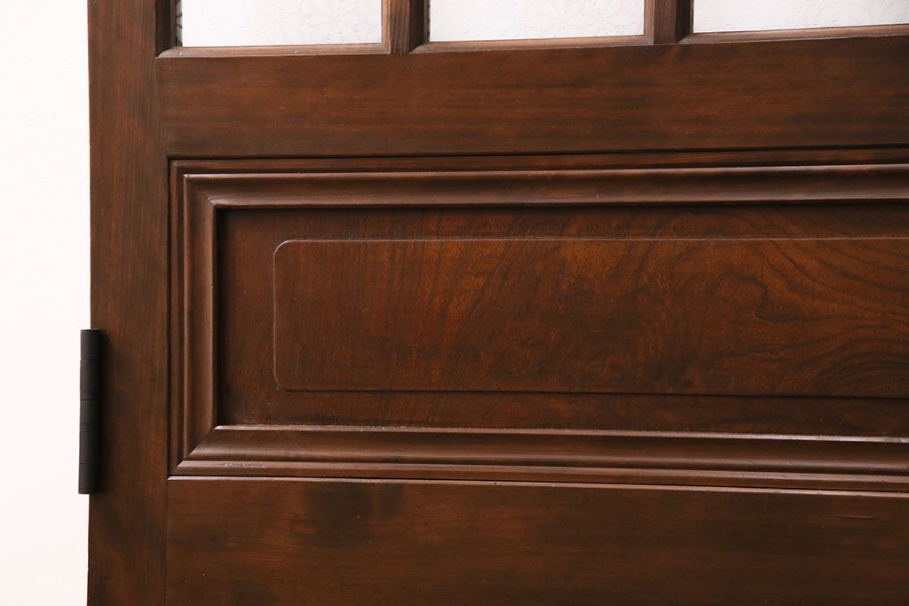 組子細工入り木製ドアをリペア&カスタム!設置場所に合わせてリサイズ。鍵、取っ手、蝶番、ローラー締りを取り付け。クリアガラス、花菱模様ガラス、変わり花菱模様ガラスを組み入れ。当店商品を参考に着色し仕上げ。(玄関ドア、建具)
