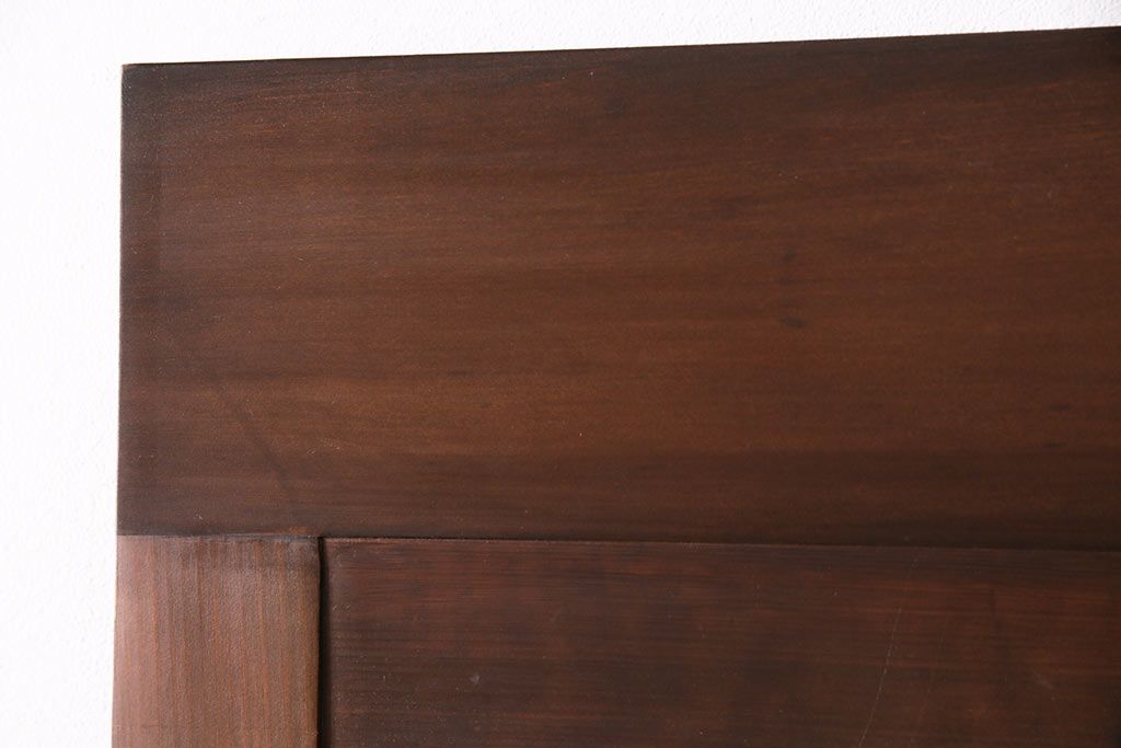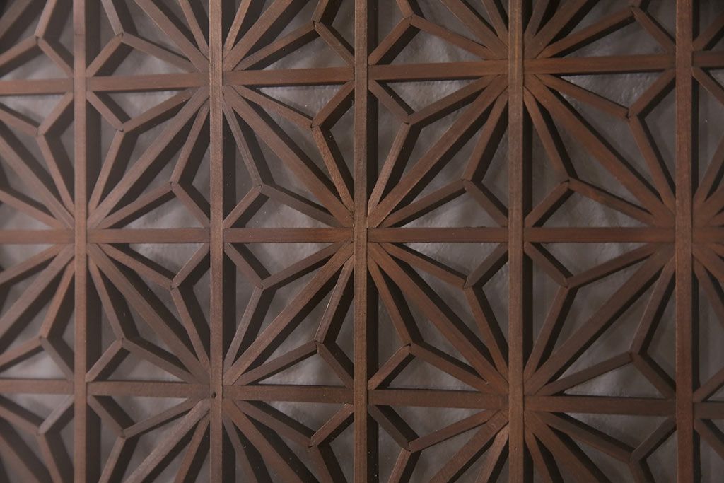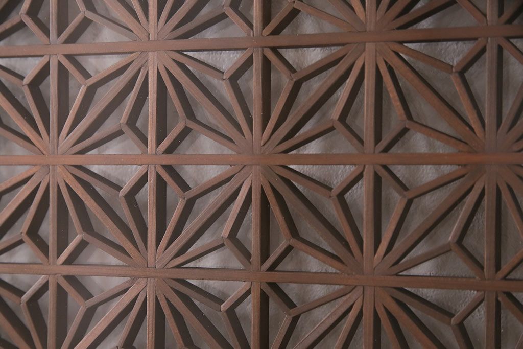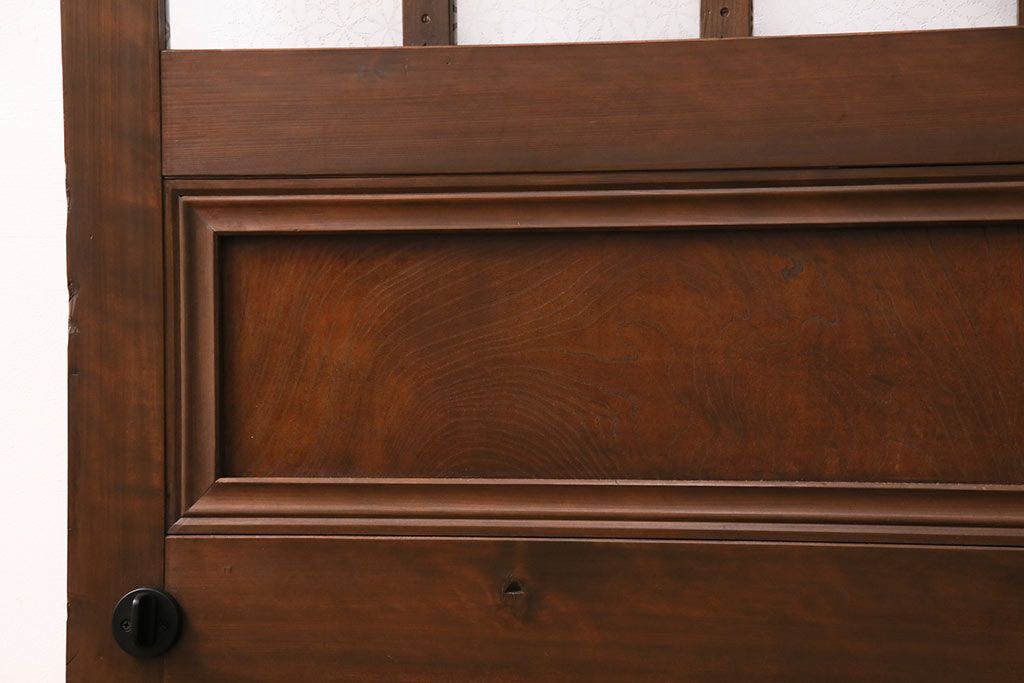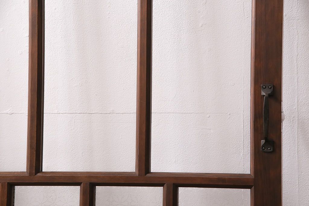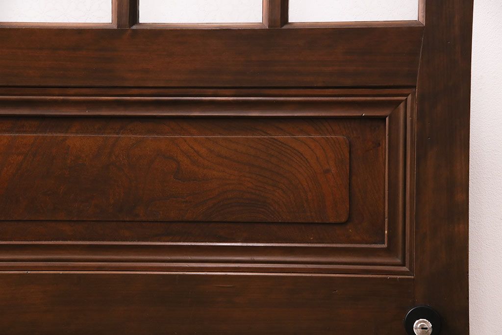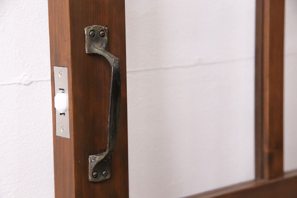 組子細工入り木製ドアをリペア&カスタム!設置場所に合わせてリサイズ。鍵、取っ手、蝶番、ローラー締りを取り付け。クリアガラス、花菱模様ガラス、変わり花菱模様ガラスを組み入れ。当店商品を参考に着色し仕上げ。(玄関ドア、建具)
