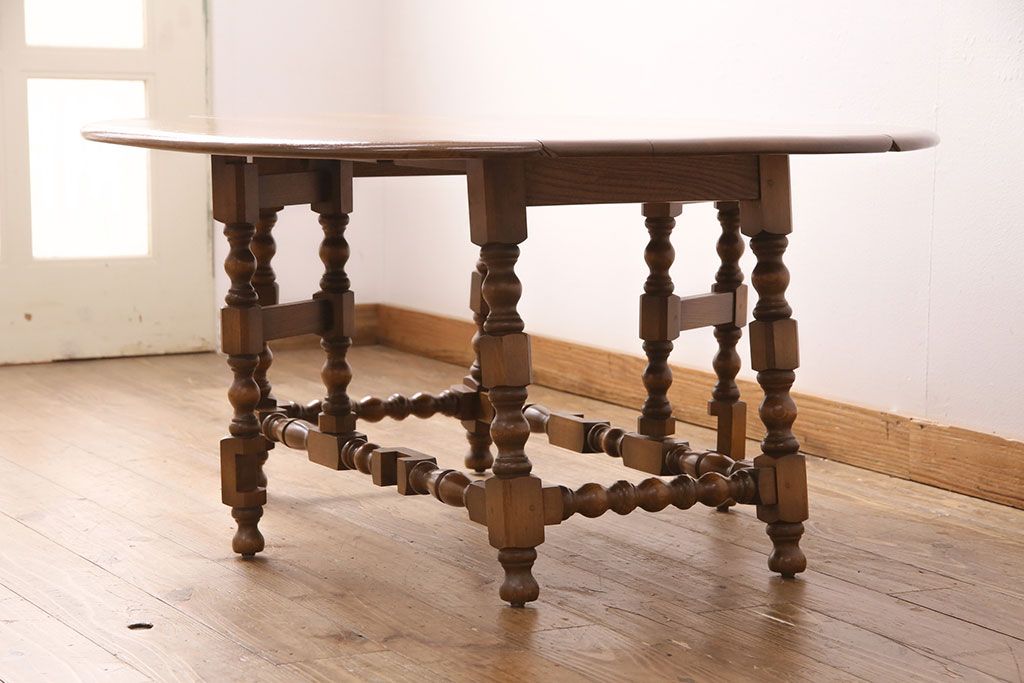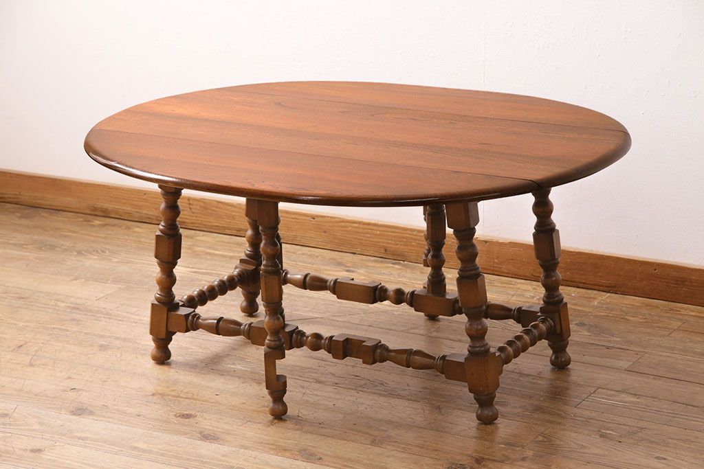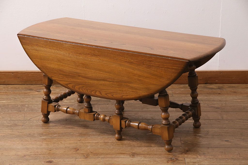 ヴィンテージ家具 美品 イギリス ERCOL(アーコール) ニレ材 挽き物の脚が目を引くバタフライテーブル(センターテーブル、ラウンドテーブル)(R-049692)です。