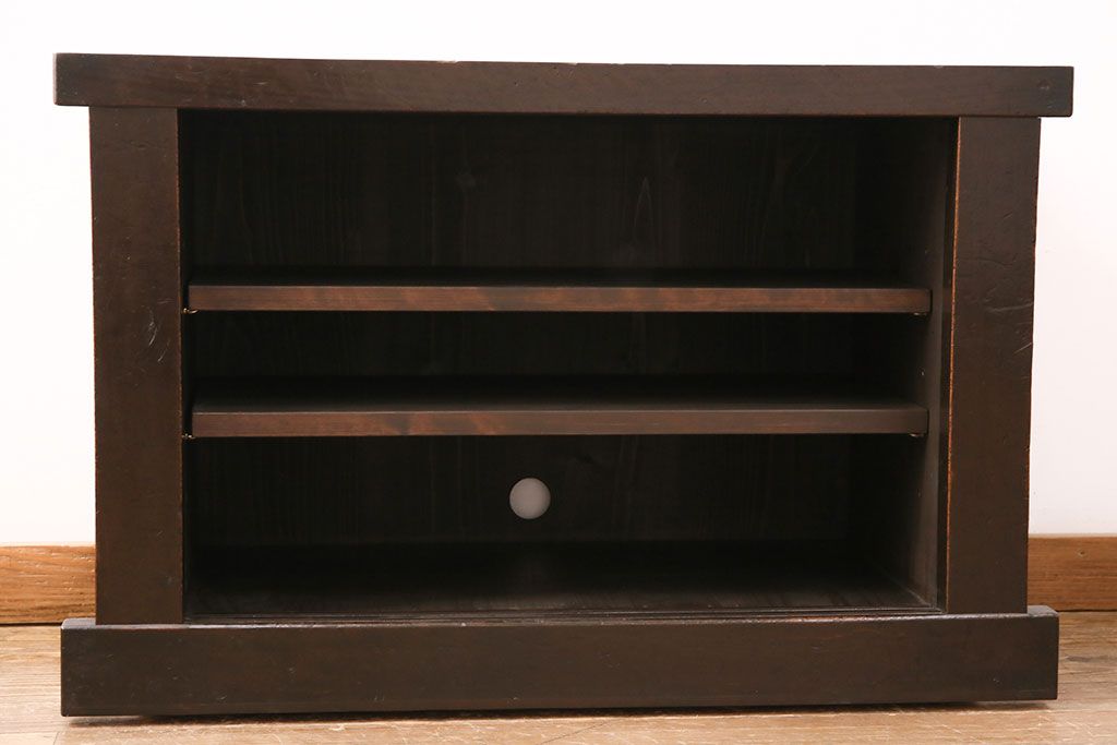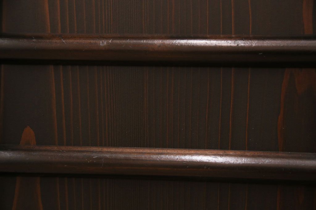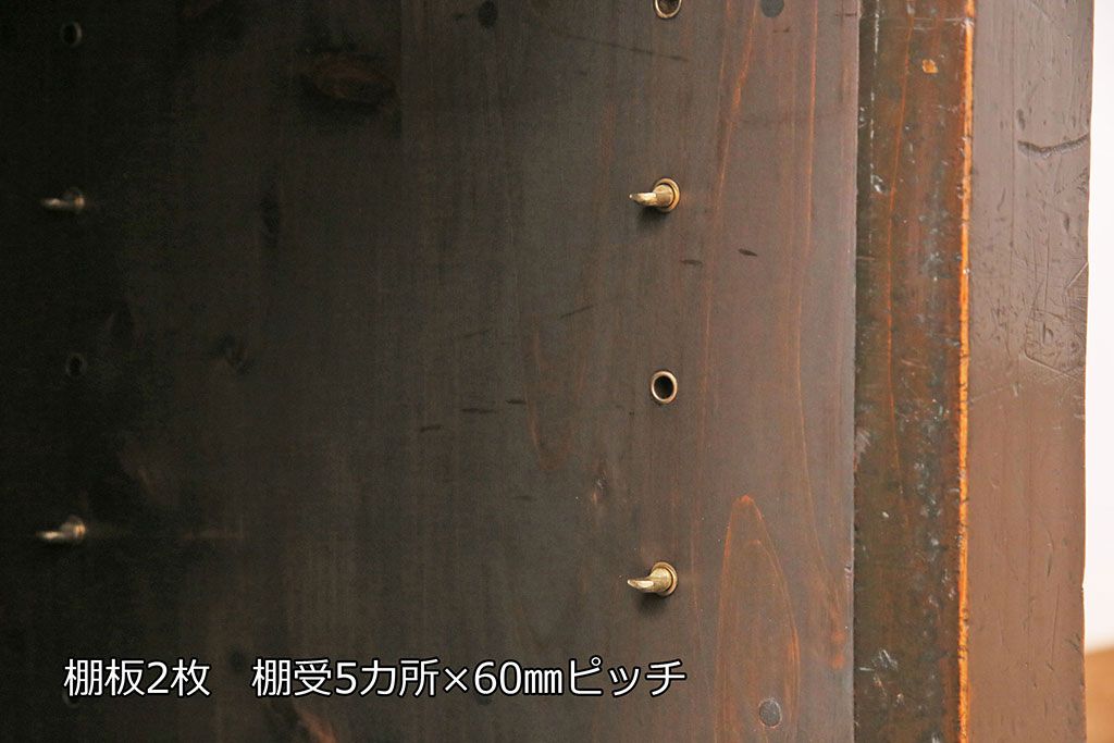棚板は取り外しできます。棚板は2枚あります。棚受けは5ヶ所、60mmピッチで調整できます。棚幅サイズのものが1枚の作りです。