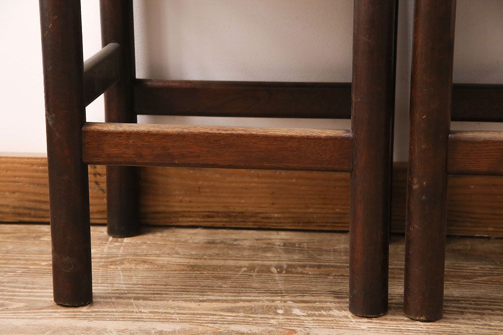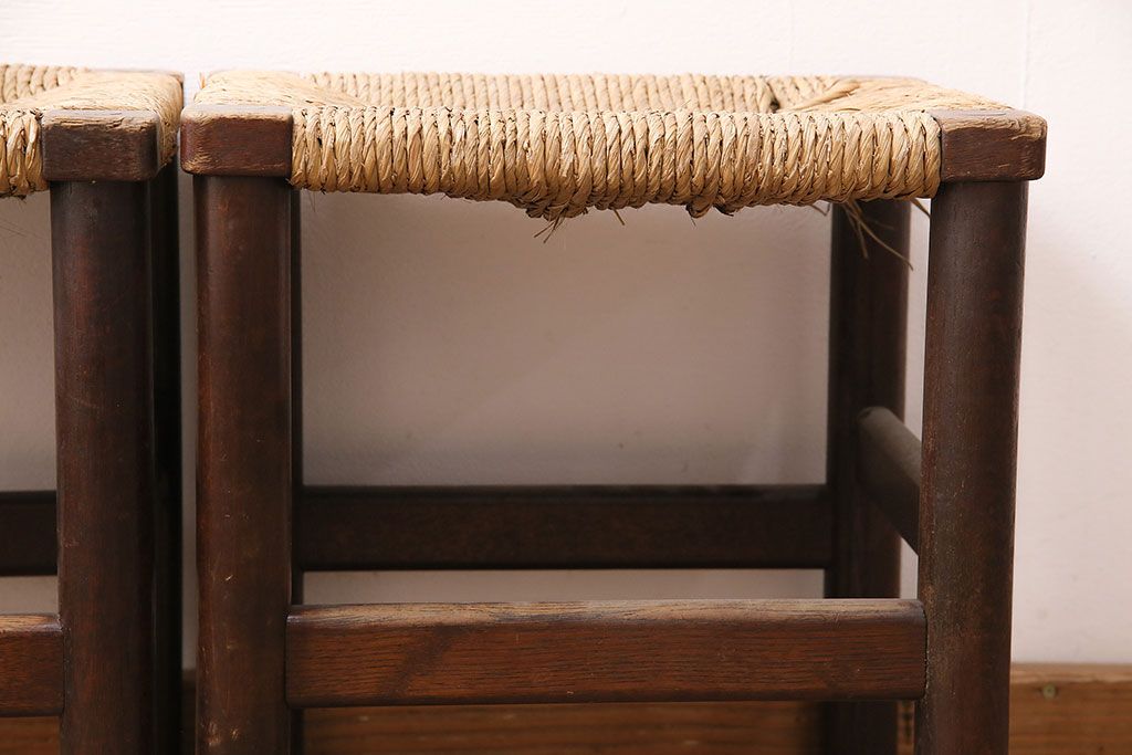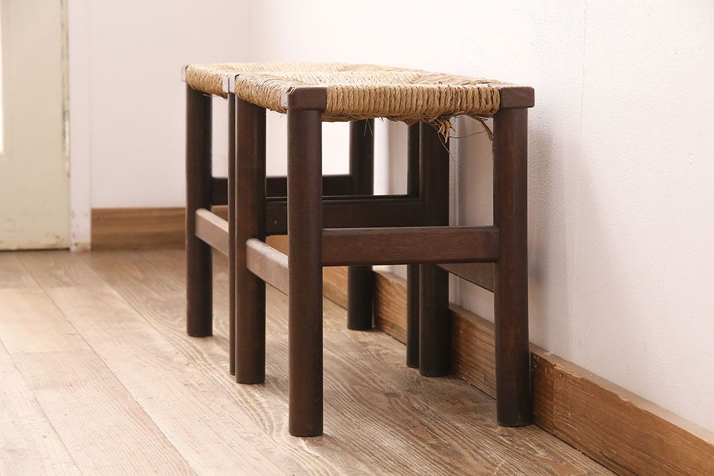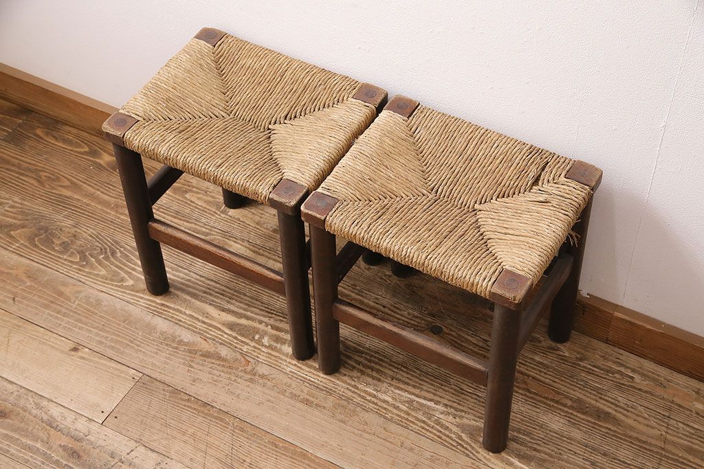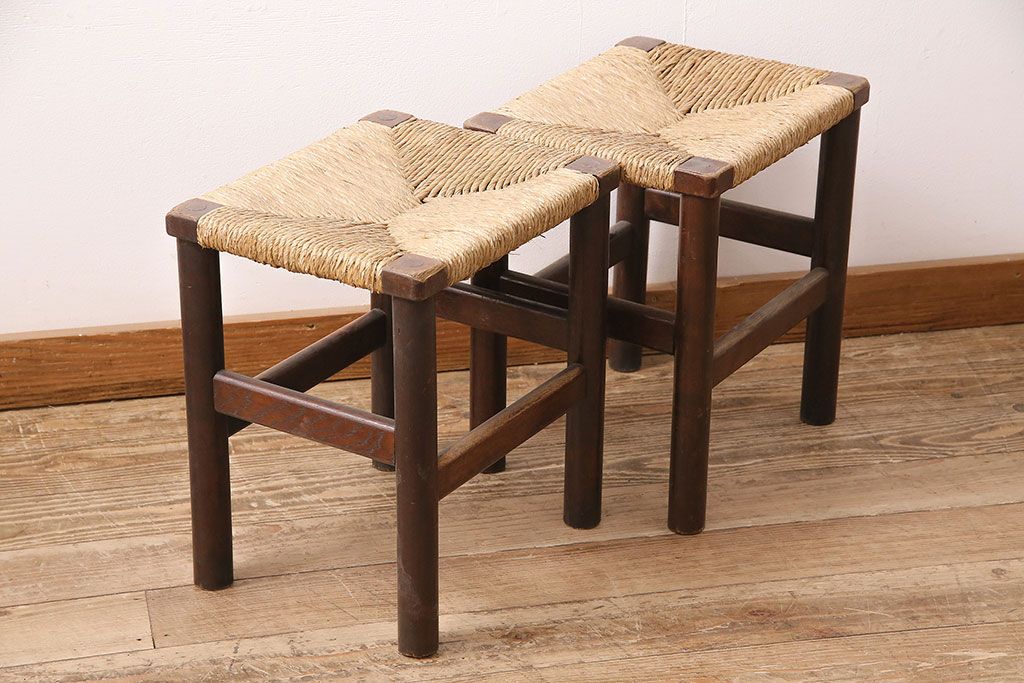 民芸家具 > 【簡易リペア限定品】ヴィンテージ家具 松本民芸家具 初期モデル ラッシ座面がおしゃれなスツール2脚セット(チェア、椅子、ビンテージ、イス、バラ売り可能)(R-048685)