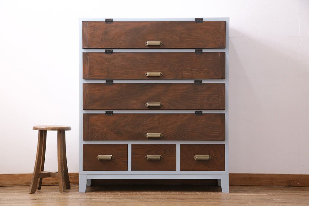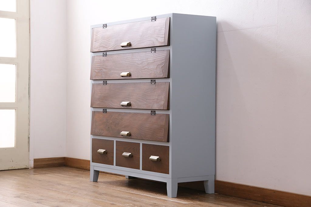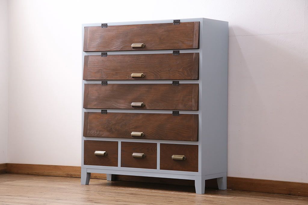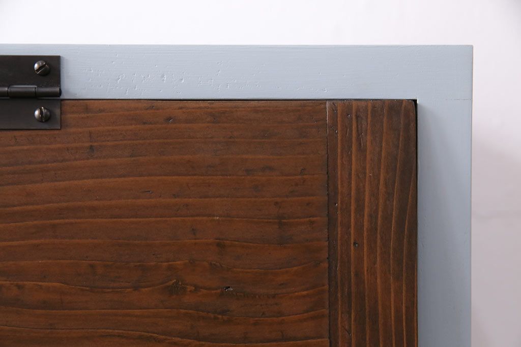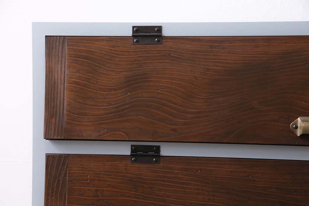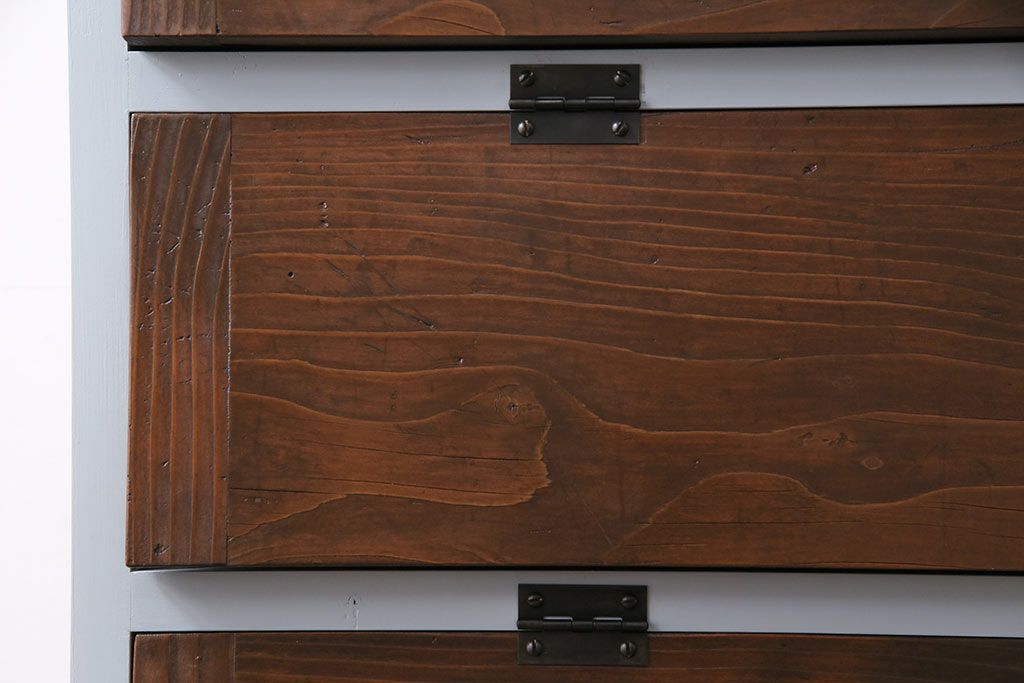 フルオーダー家具実績 > パタパタ扉の収納棚を新規製作!本体はヒノキ無垢材にくすんだ水色のペイント。前板は古材に茶色で着色し仕上げ。(キャビネット、下駄箱、ロッカー)