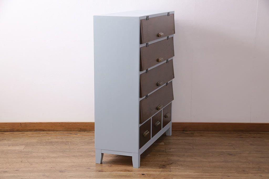 ワードローブ・ロッカー> ロッカー > パタパタ扉の収納棚を新規製作!本体はヒノキ無垢材にくすんだ水色のペイント。前板は古材に茶色で着色し仕上げ。(キャビネット、下駄箱、ロッカー)