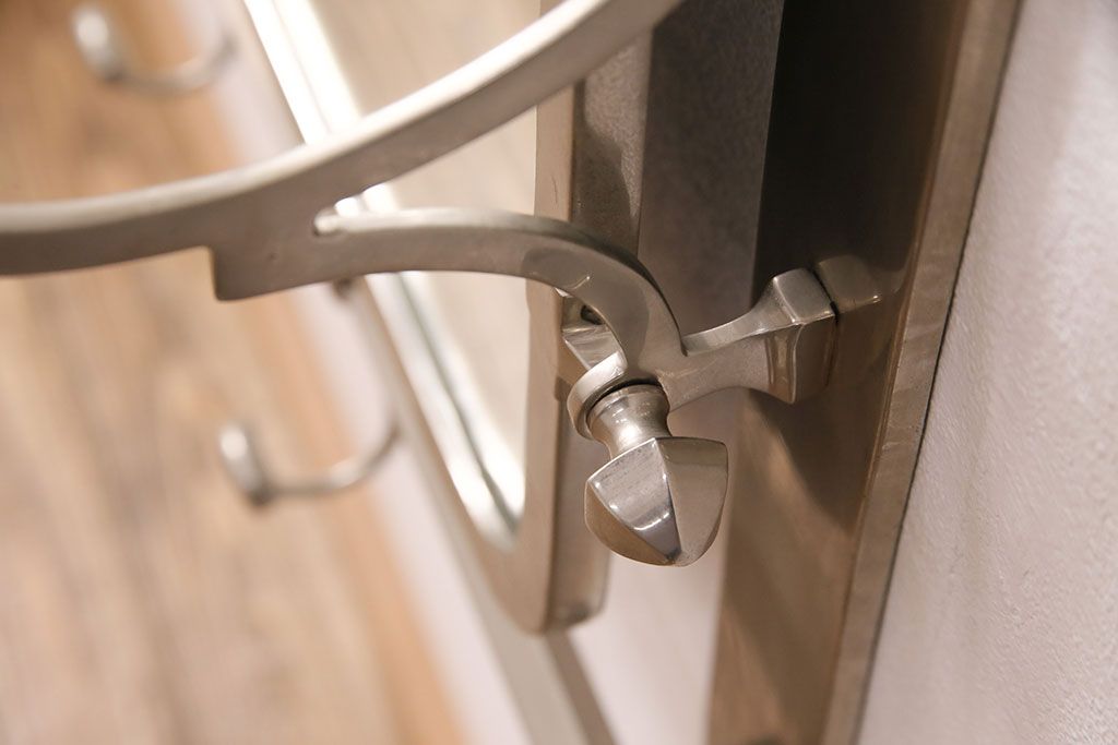 壁掛けタイプの鏡に、ラックとフックが付いた