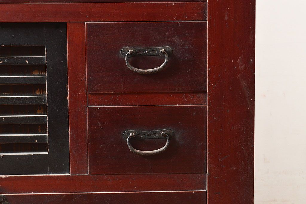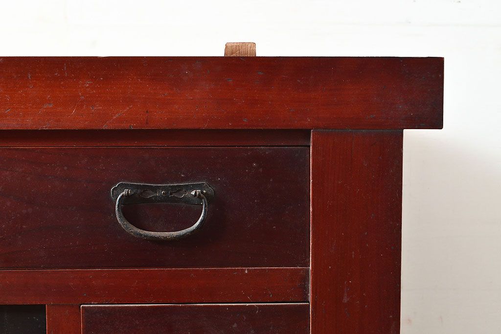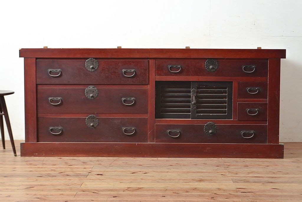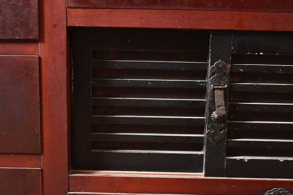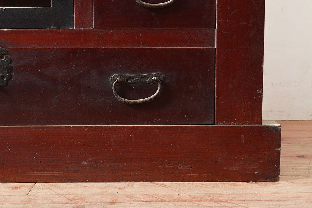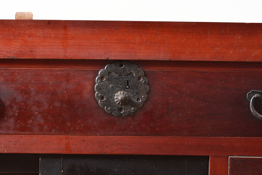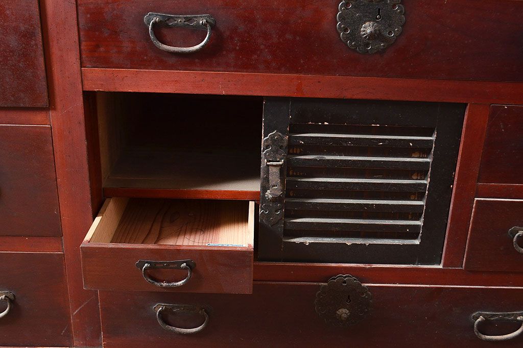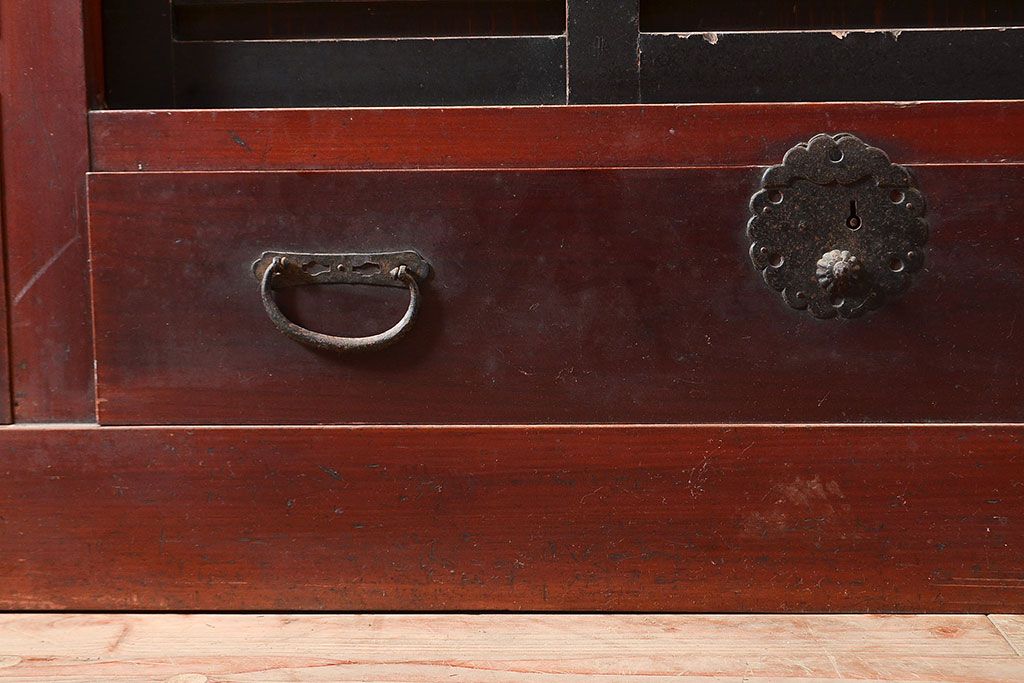 和箪笥> 水屋箪笥 > 和製アンティーク ヒノキ材・ケヤキ材 収納力抜群!漆の赤みがかった色味が魅力の収納箪笥(夜具箪笥、布団箪笥、水屋箪笥、ローボード、リビングボード、引き出し)(R-048648)