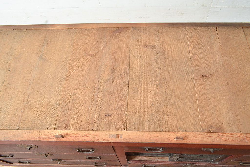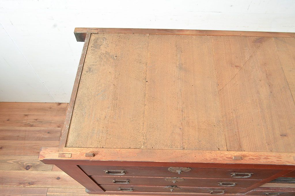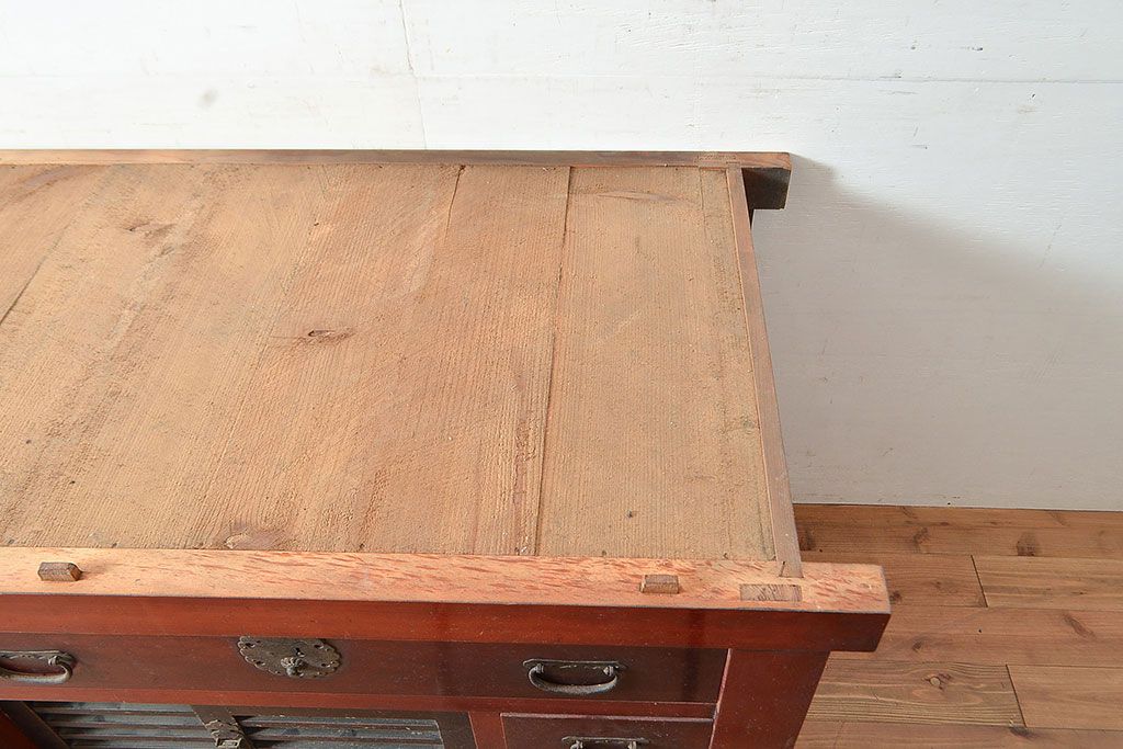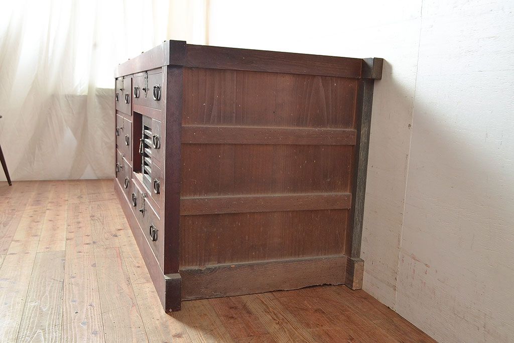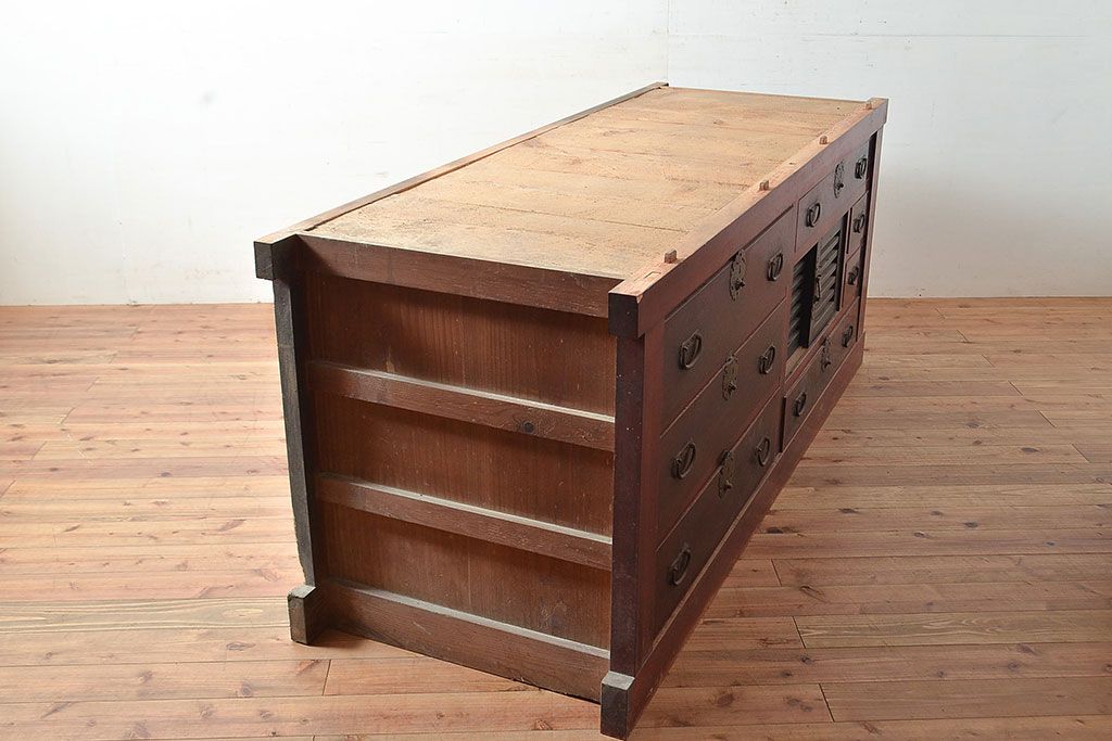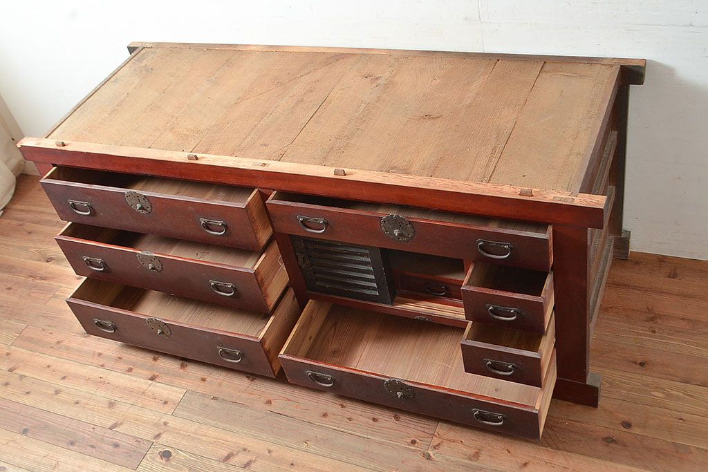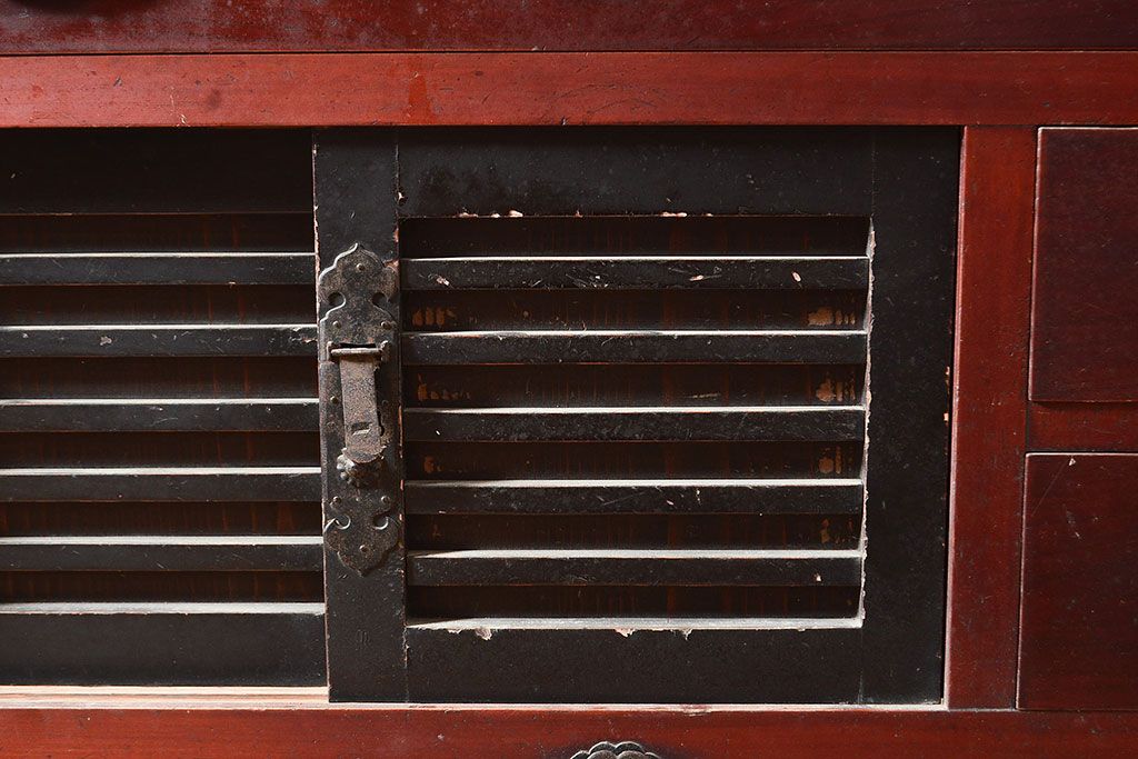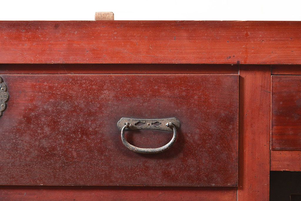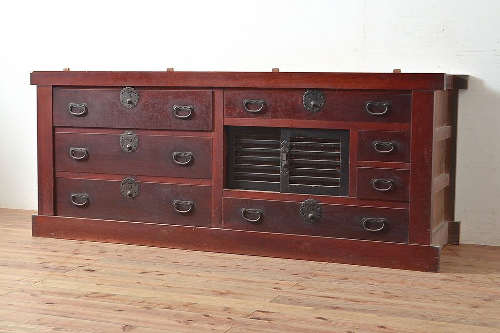 和箪笥> 水屋箪笥 > 和製アンティーク ヒノキ材・ケヤキ材 収納力抜群!漆の赤みがかった色味が魅力の収納箪笥(夜具箪笥、布団箪笥、水屋箪笥、ローボード、リビングボード、引き出し)(R-048648)