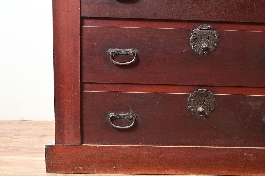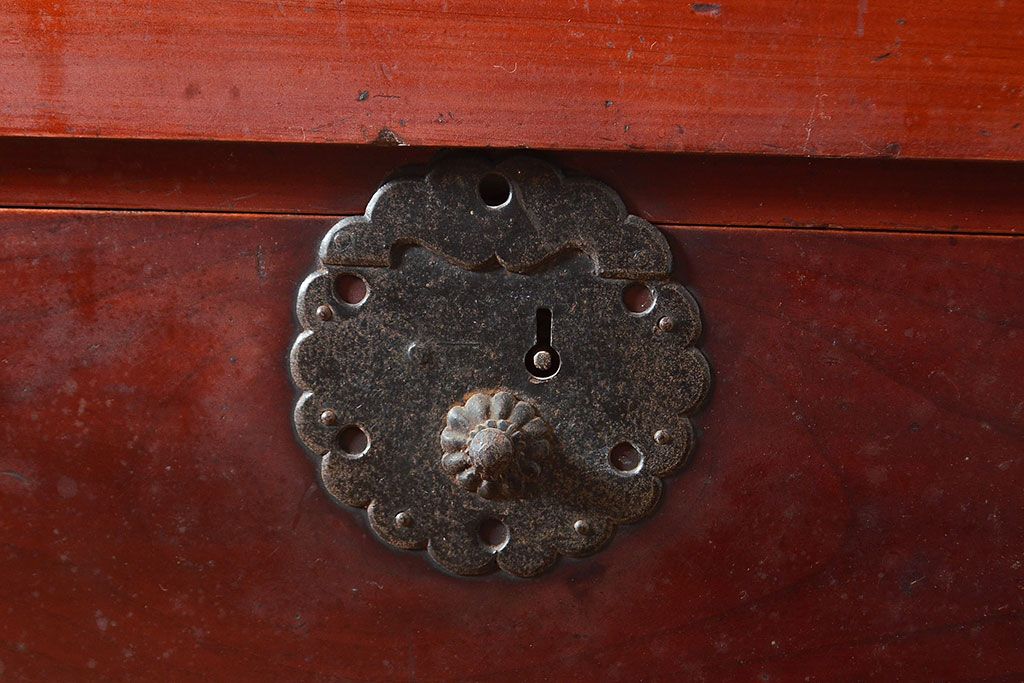 和箪笥 > 和製アンティーク ヒノキ材・ケヤキ材 収納力抜群!漆の赤みがかった色味が魅力の収納箪笥(夜具箪笥、布団箪笥、水屋箪笥、ローボード、リビングボード、引き出し)(R-048648)
