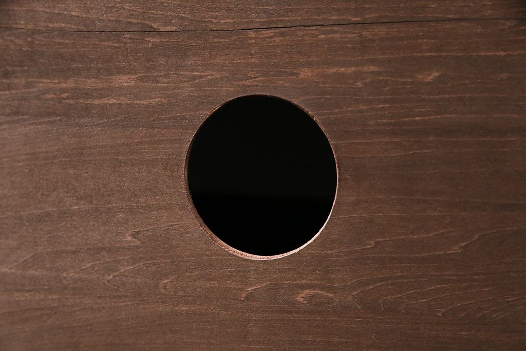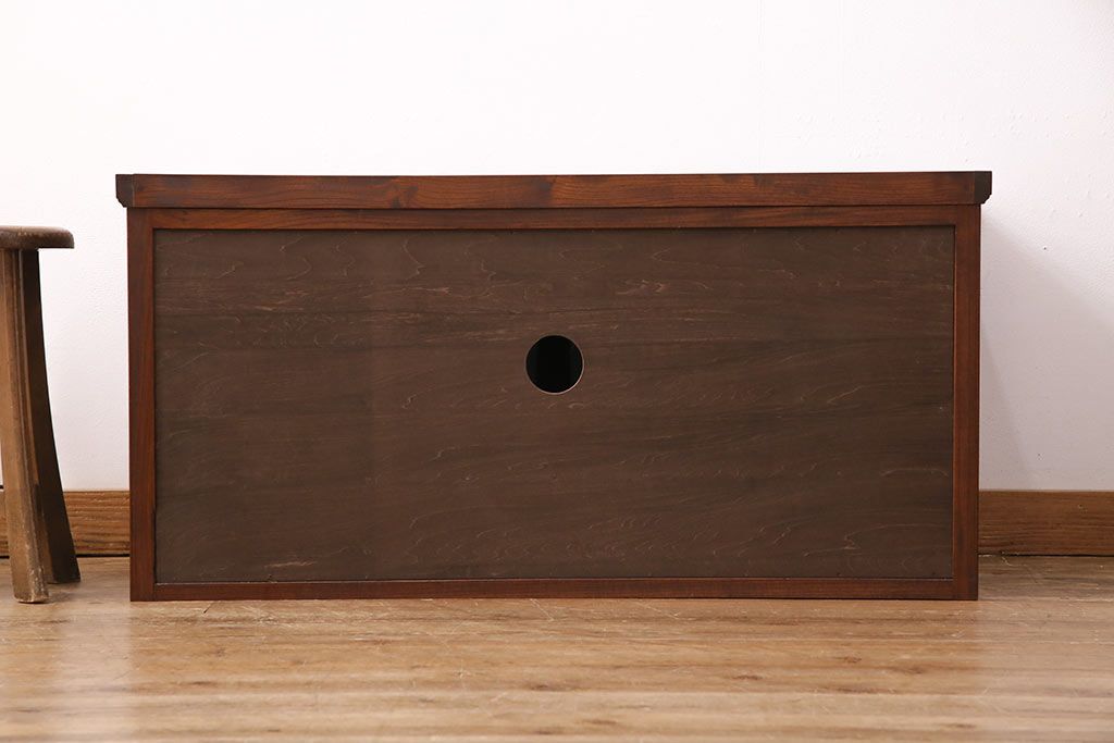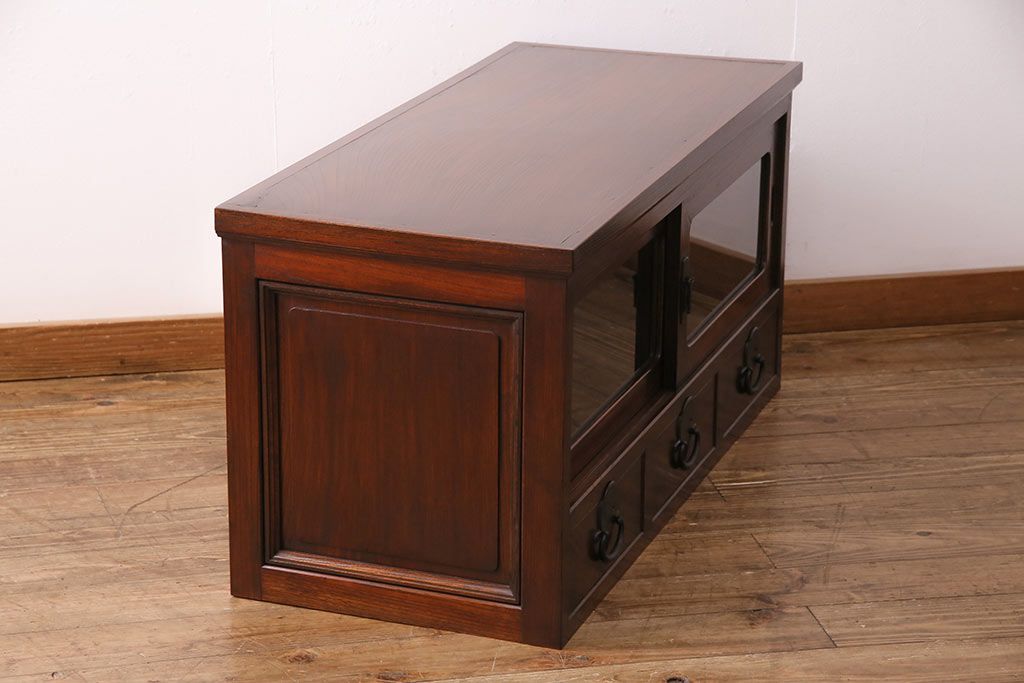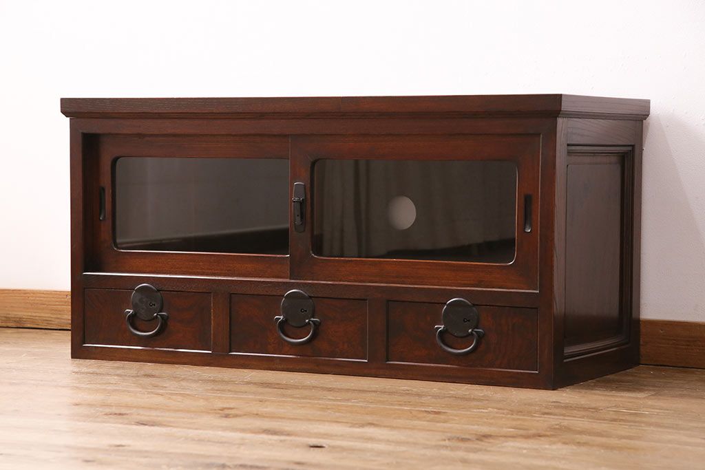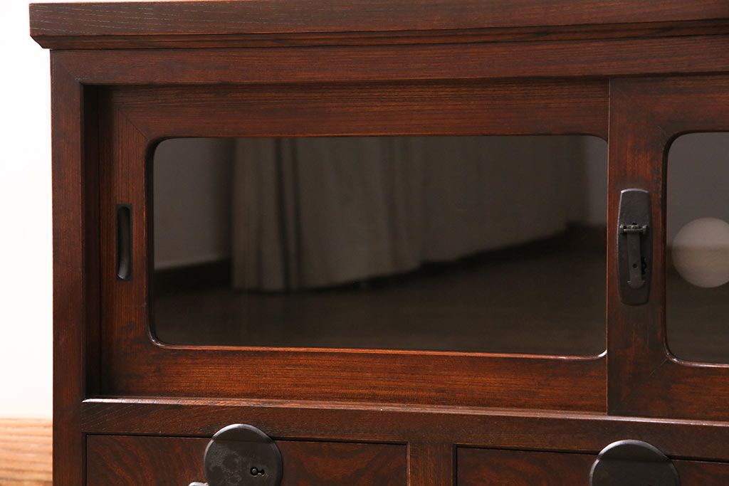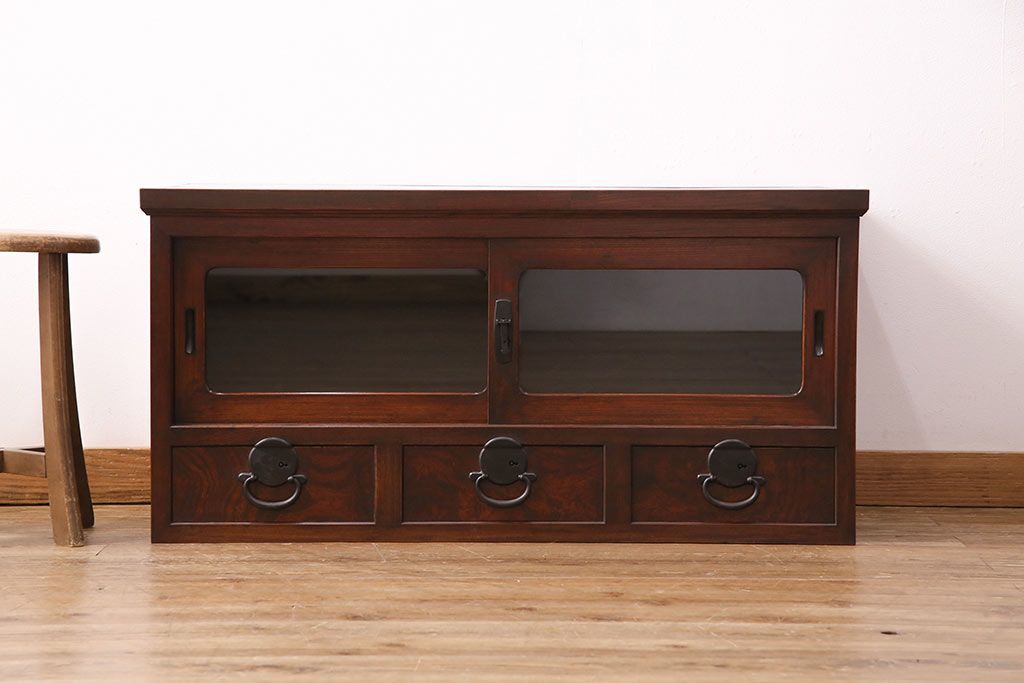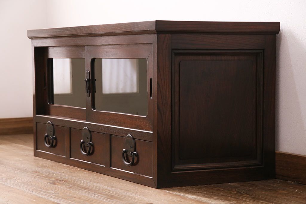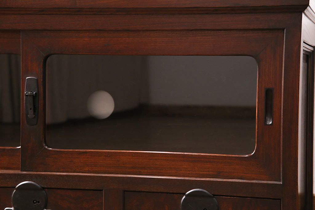 昭和初期のテレビ台をリペア&カスタム!鉄脚を取り付け。背面穴開け加工。建具はクリアガラスに入れ替え。(ローボード、収納棚)