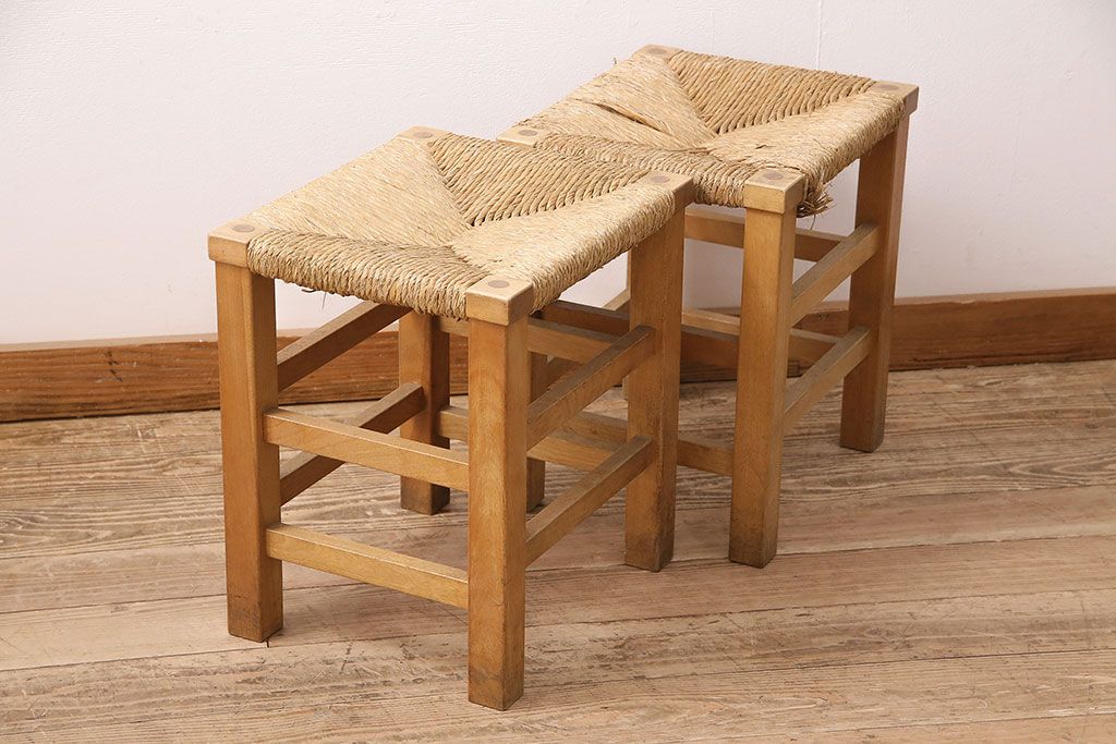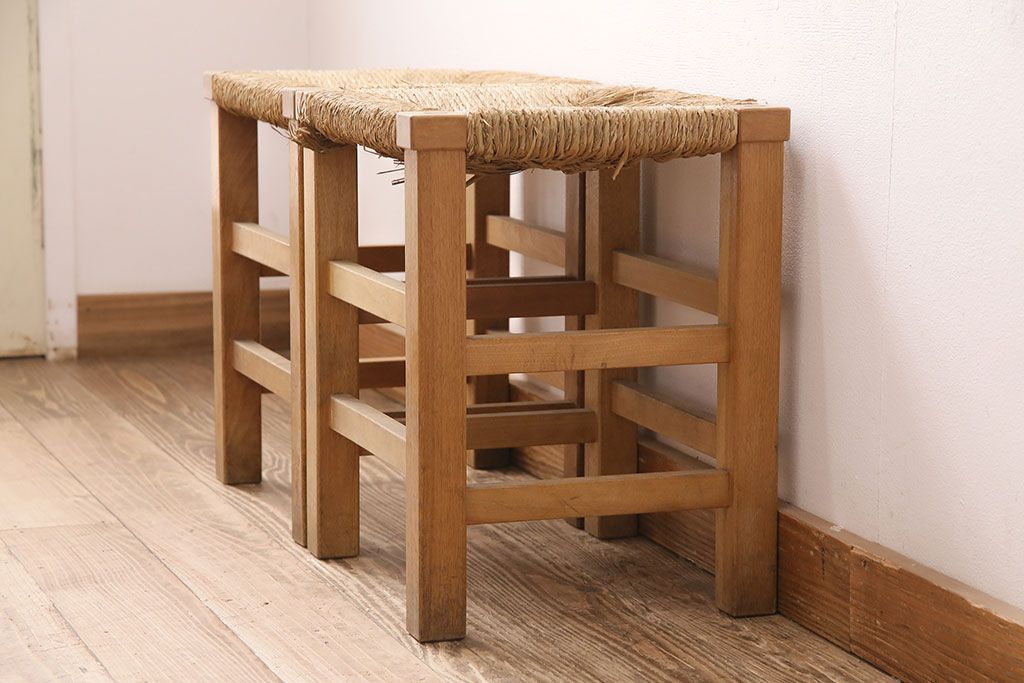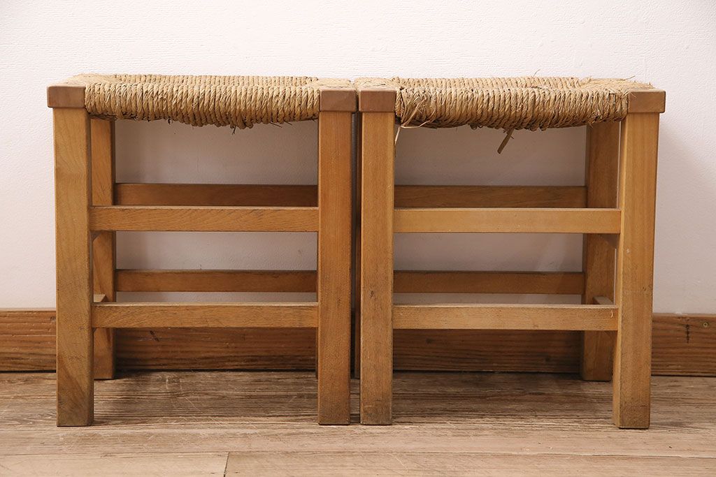 ヴィンテージ 松本民芸家具 初期モデル ラッシ座面がおしゃれ!素朴な木肌が味わい深いスツール2脚セット(チェア、椅子)(R-048690)です。