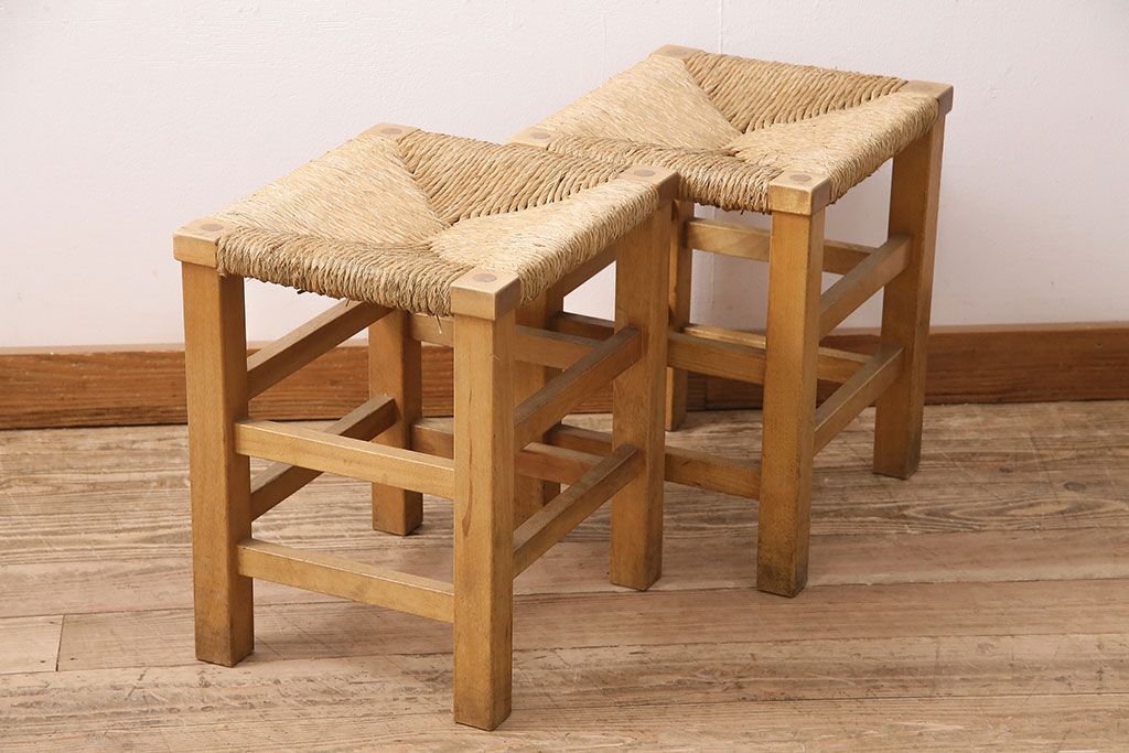 ヴィンテージ 松本民芸家具 初期モデル ラッシ座面がおしゃれ!素朴な木肌が味わい深いスツール2脚セット(チェア、椅子)(R-048691)です。