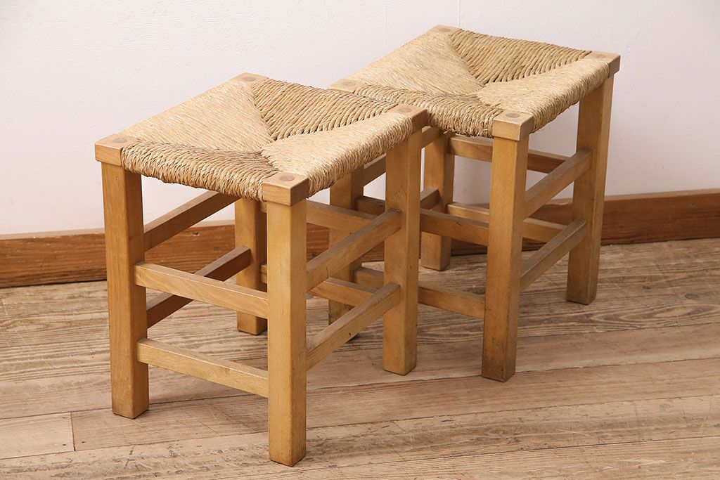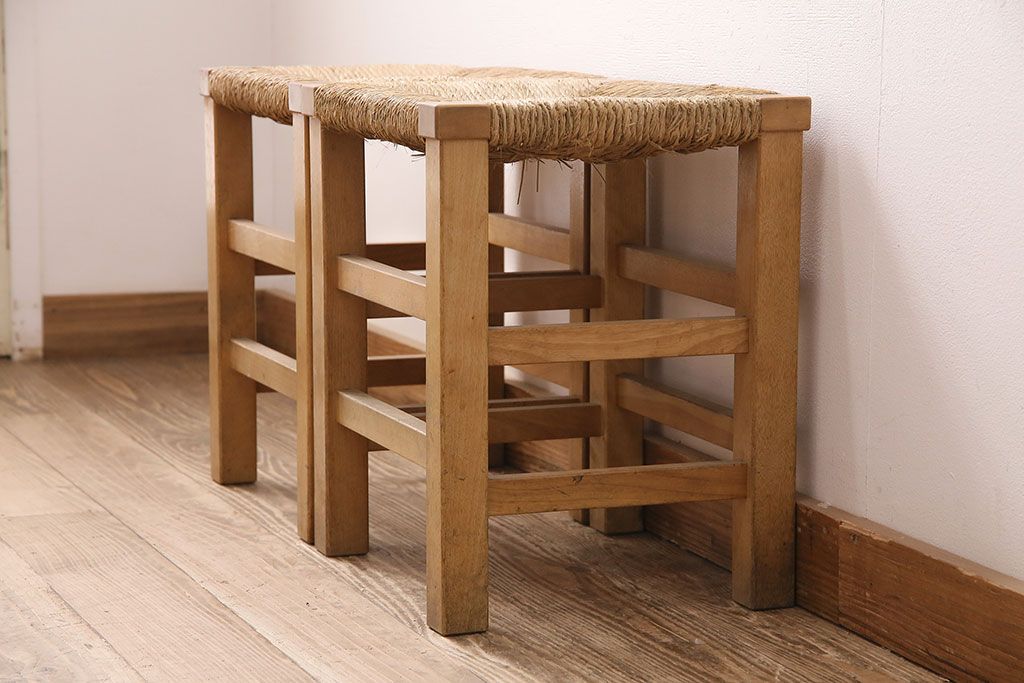 ヴィンテージ 松本民芸家具 初期モデル ラッシ座面がおしゃれ!素朴な木肌が味わい深いスツール2脚セット(チェア、椅子)(R-048692)です。
