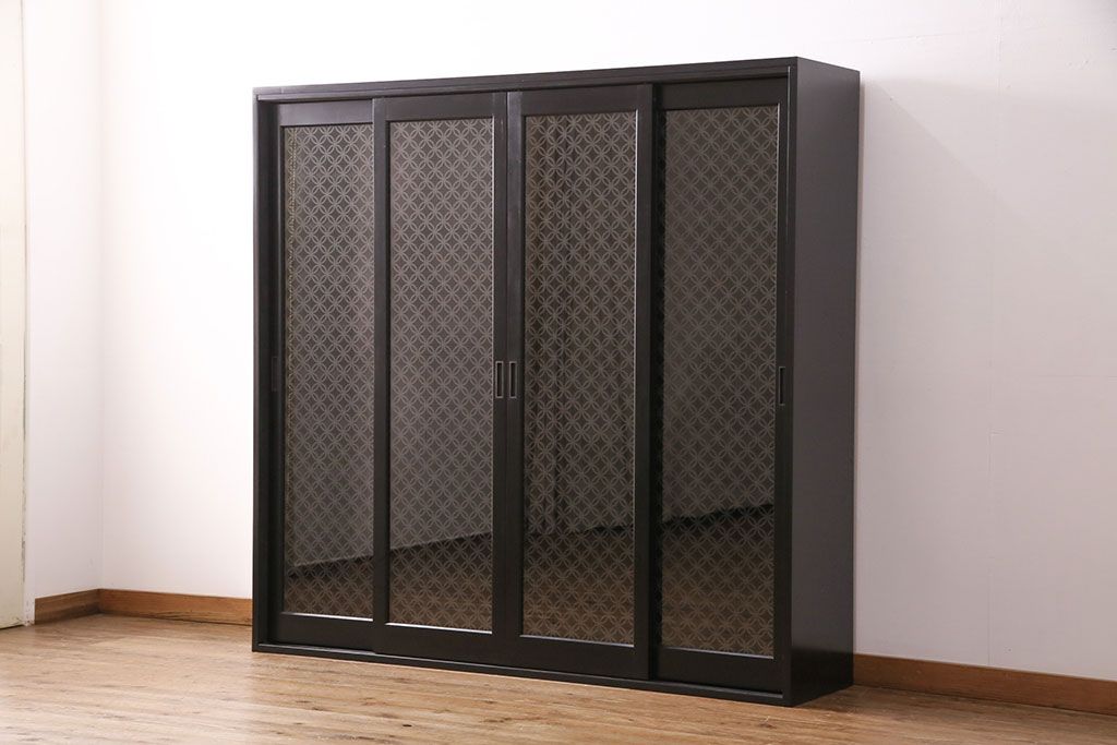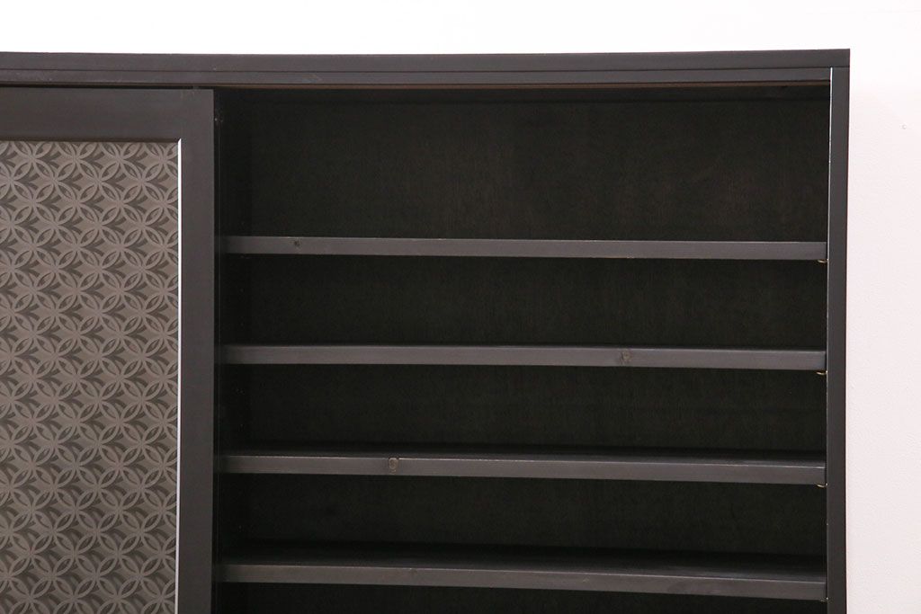 キャビネット・戸棚> 下駄箱 > 下駄箱を新規製作!建具は七宝柄のレーザー組子入りガラス戸。収納部はセパレートさせ、可動式の棚板を設置。マットブラックのカシュー塗装。(収納棚、戸棚)