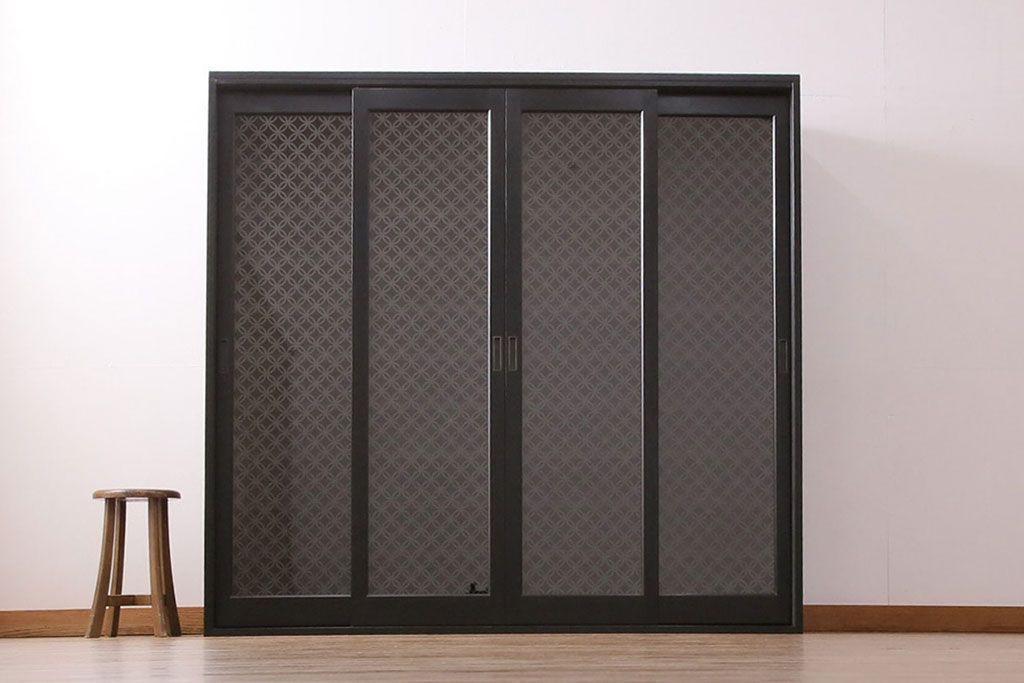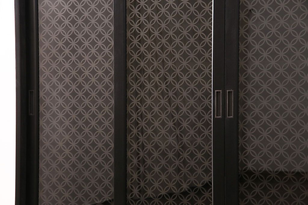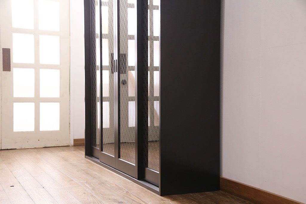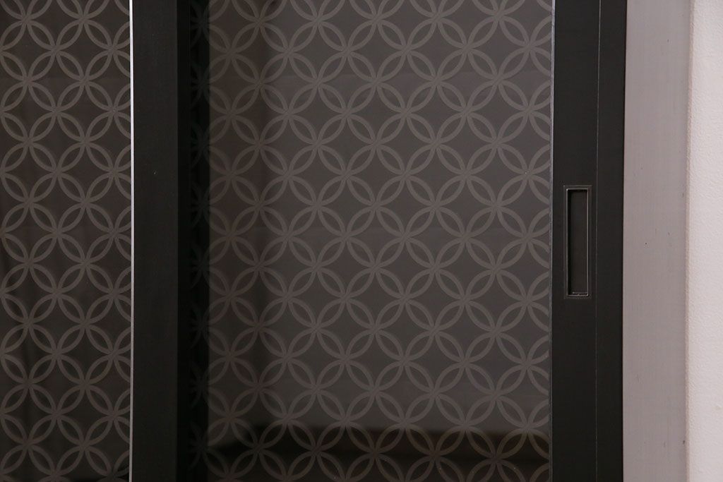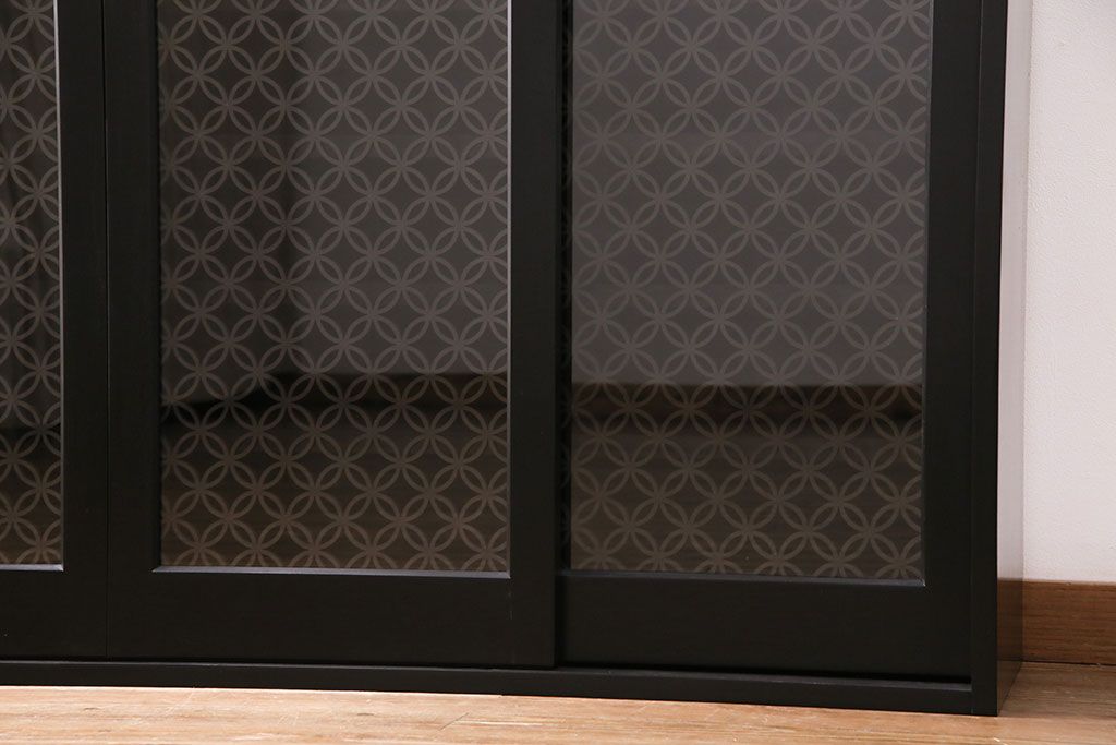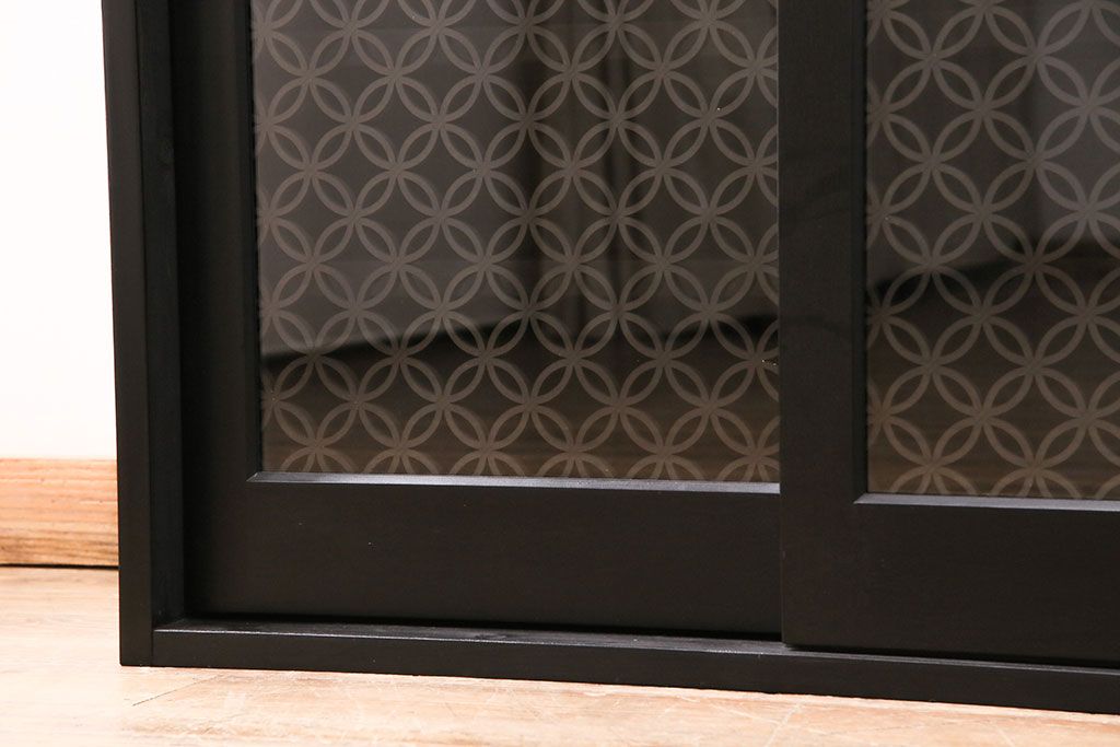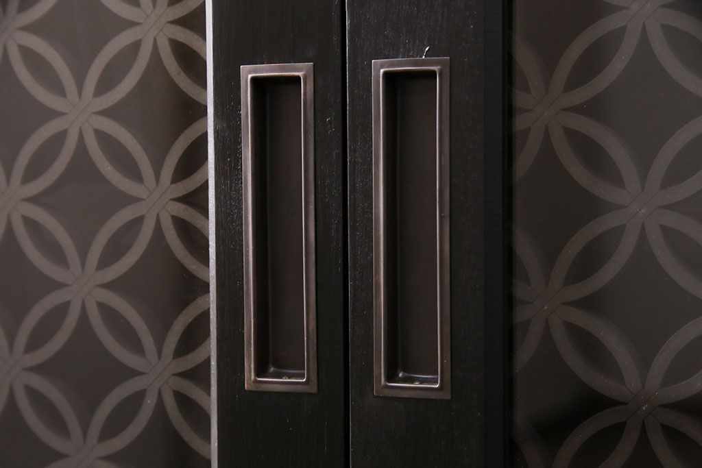 下駄箱を新規製作!建具は七宝柄のレーザー組子入りガラス戸。収納部はセパレートさせ、可動式の棚板を設置。マットブラックのカシュー塗装。(収納棚、戸棚)