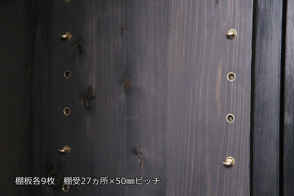 棚板は取り外しできます。棚板は各9枚あります。棚受けは27ヶ所、50mmピッチで調整できます。棚幅サイズのものが1枚の作りです。