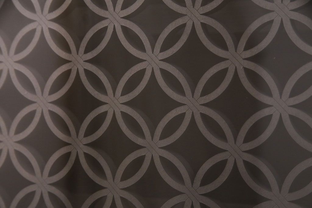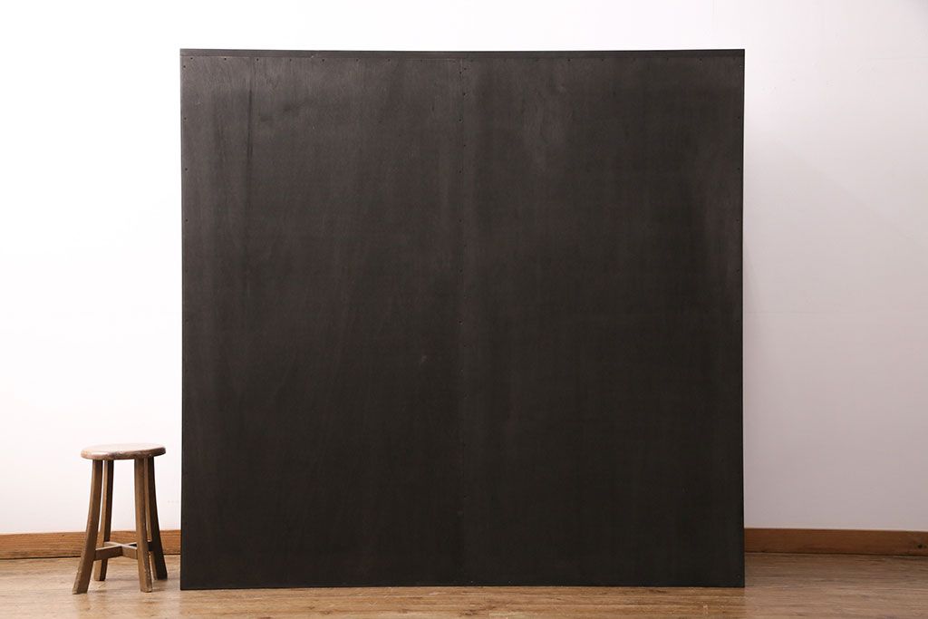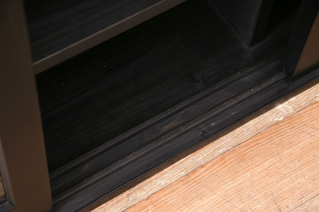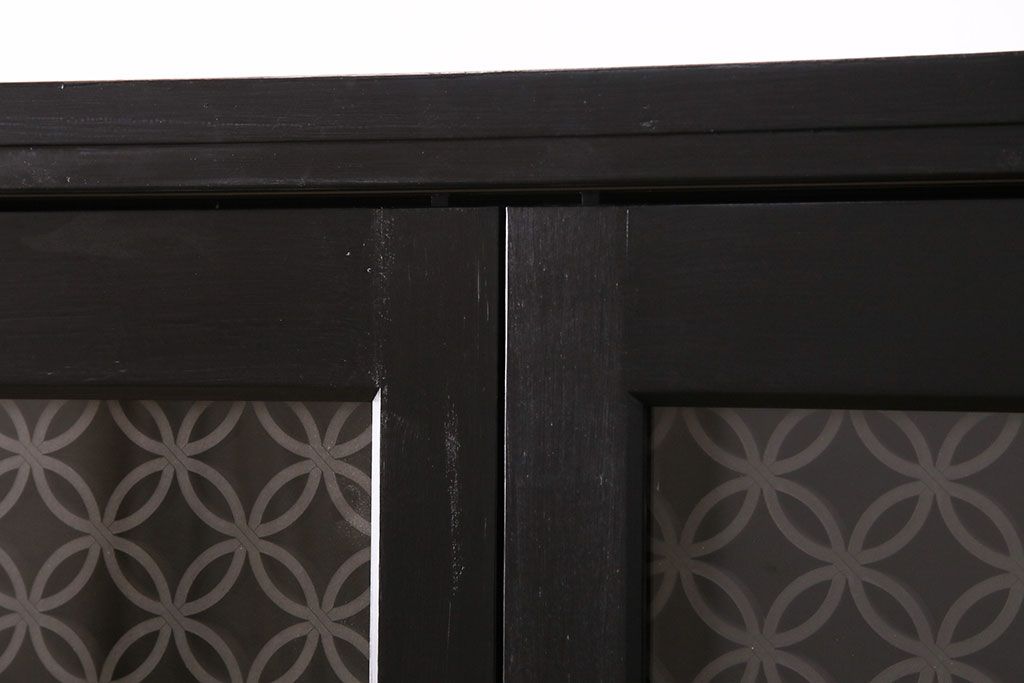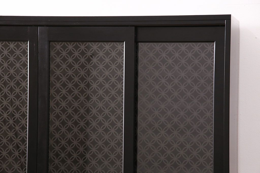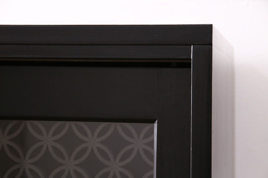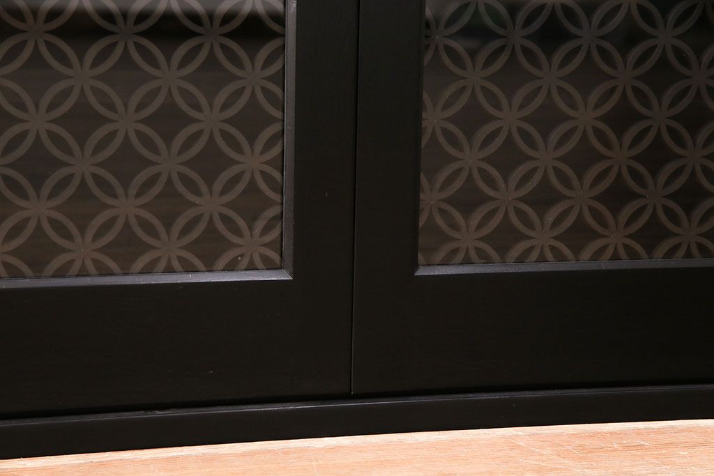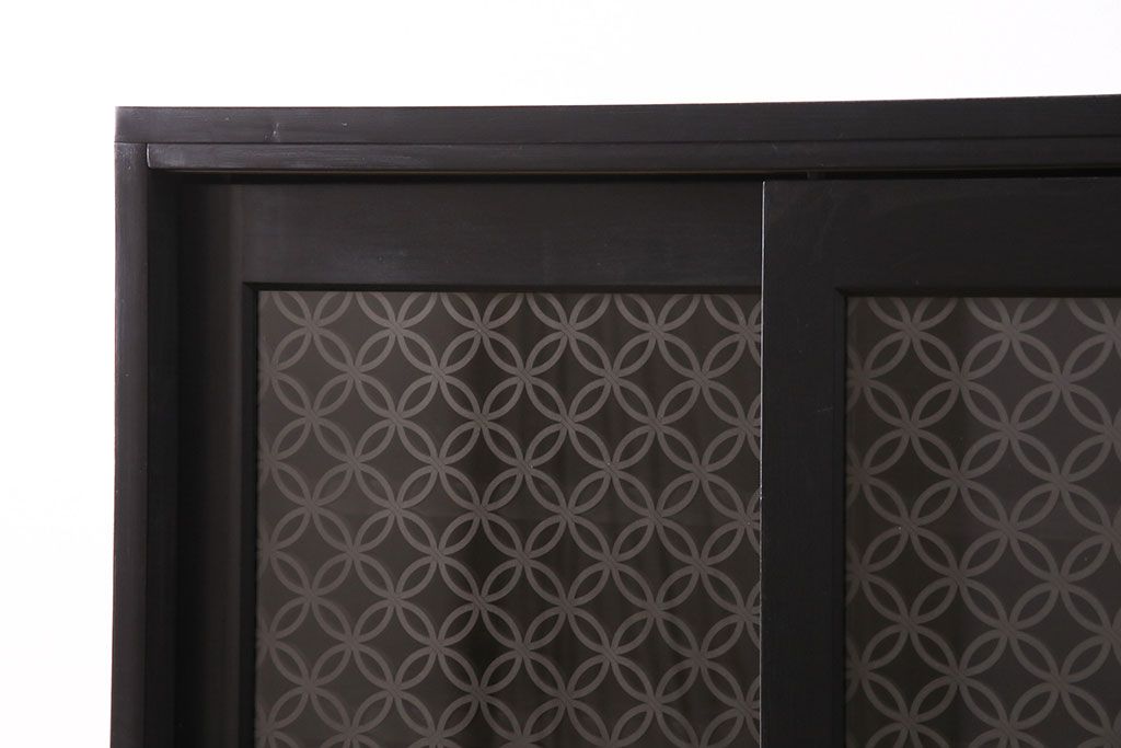 フルオーダー家具実績 > 下駄箱を新規製作!建具は七宝柄のレーザー組子入りガラス戸。収納部はセパレートさせ、可動式の棚板を設置。マットブラックのカシュー塗装。(収納棚、戸棚)