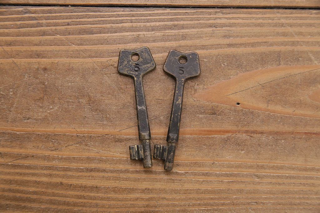 鍵は付属します。画像にありますように、袋に入れお付けします。スムーズに動くように調整していますが、あくまでも古いものや中古品ですので、長期の使用保証は出来かねます。ご購入後不具合が発生した場合は、当店でサポートさせていただきますので、お気軽にご相談くださいませ。