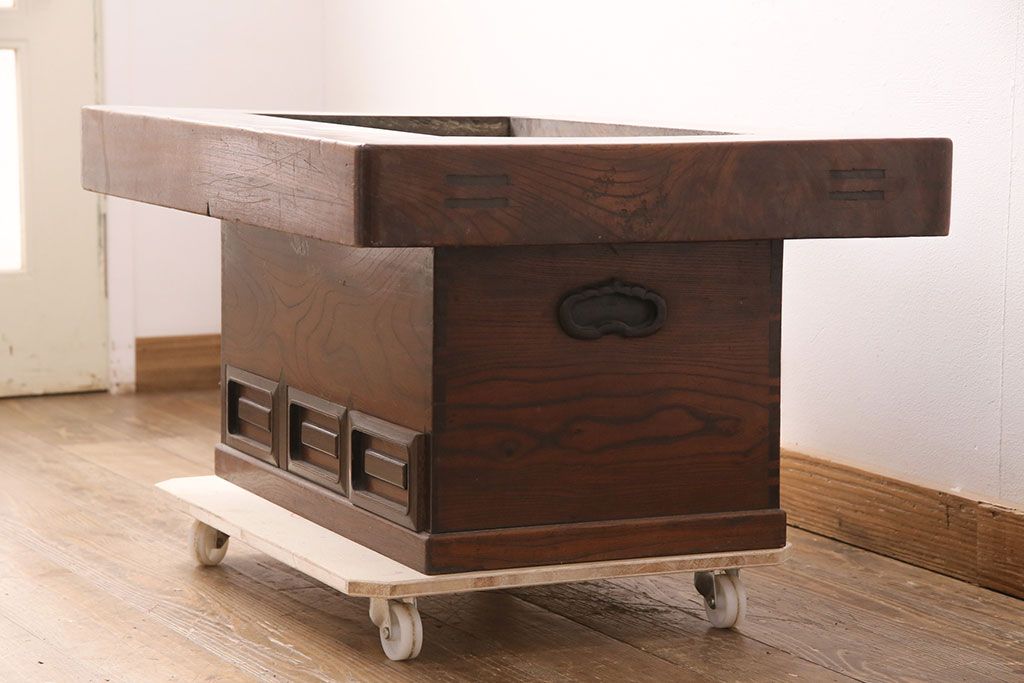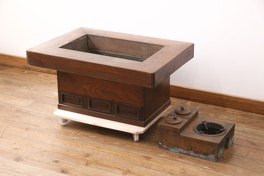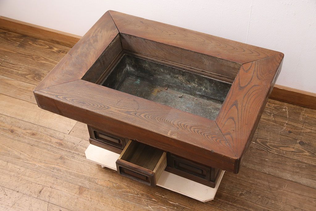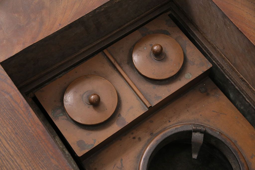 火鉢> 長火鉢 > 和製アンティーク 銅壺(銅壷)付き! 重厚な総ケヤキ材製の関西火鉢(木製火鉢、囲炉裏)(R-049802)