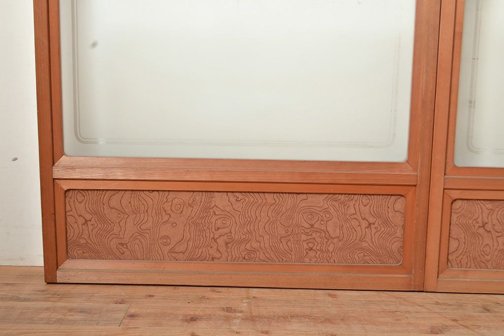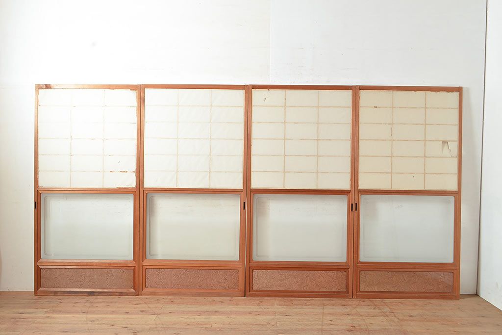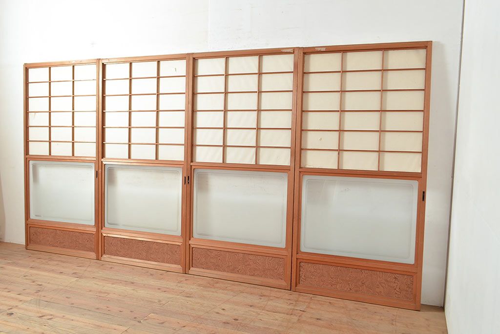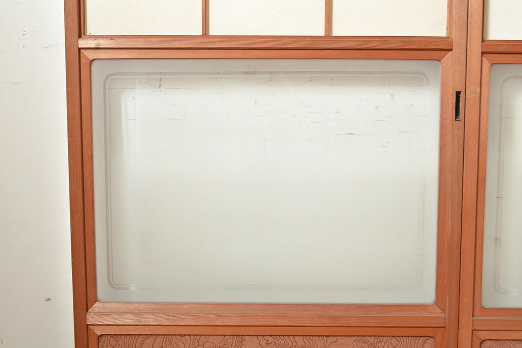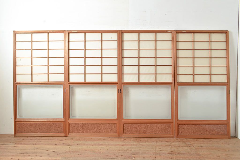 アンティーク建具 昭和中期 レトロガラス入り 腰板の木目がおしゃれなアクセントの障子戸4枚セット(建具、引き戸)(R-049481)