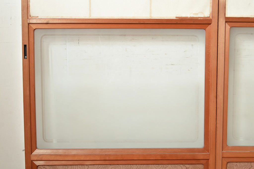 ラフジュ工房> ドア・建具> 障子戸 > アンティーク建具 昭和中期 レトロガラス入り 腰板の木目がおしゃれなアクセントの障子戸4枚セット(建具、引き戸)(R-049481)