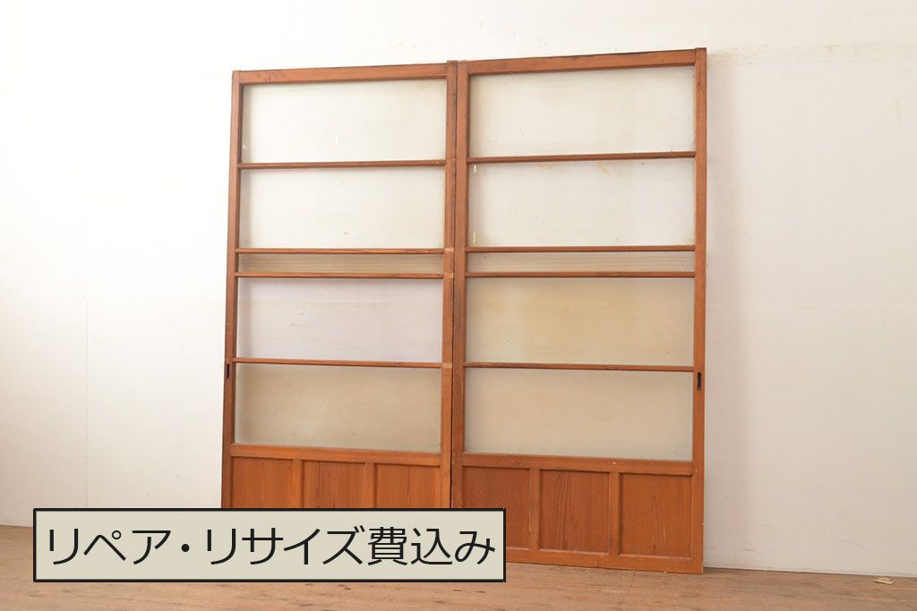 アンティーク建具 昭和中期 すりガラス・銀モールガラス 光を優しく取り込む、ノスタルジックな雰囲気のガラス戸2枚セット(引き戸、建具)(R-049467)