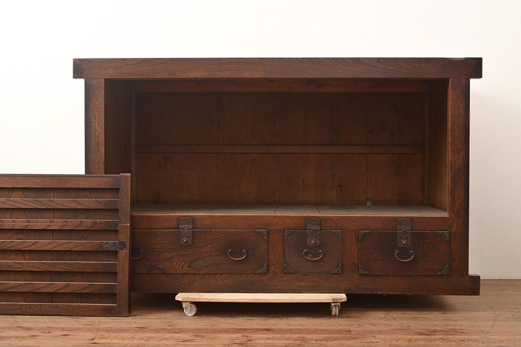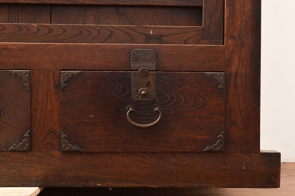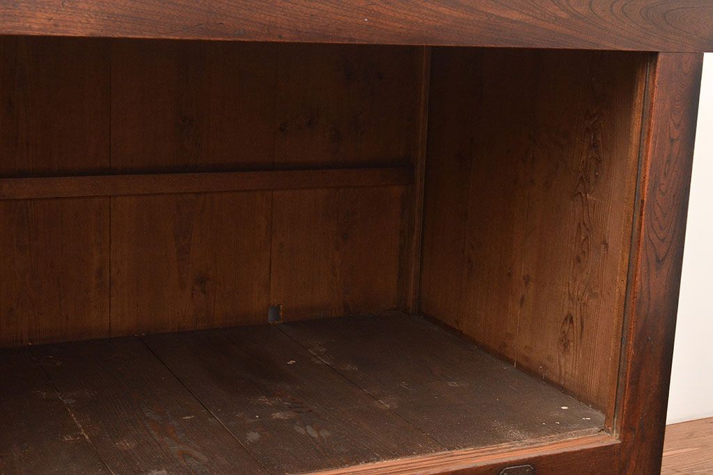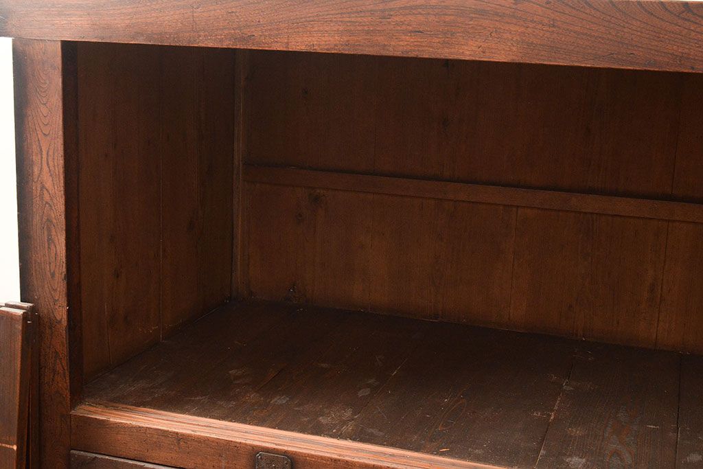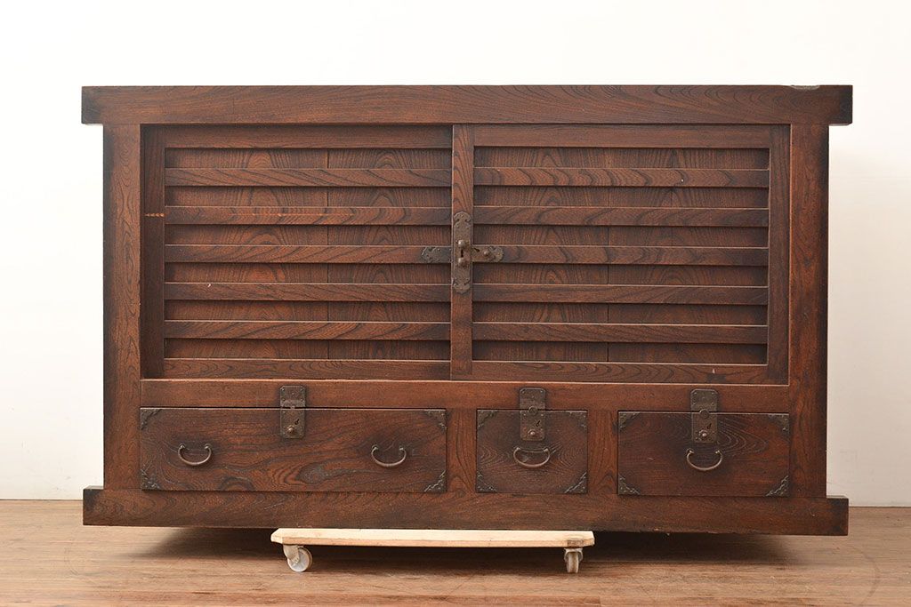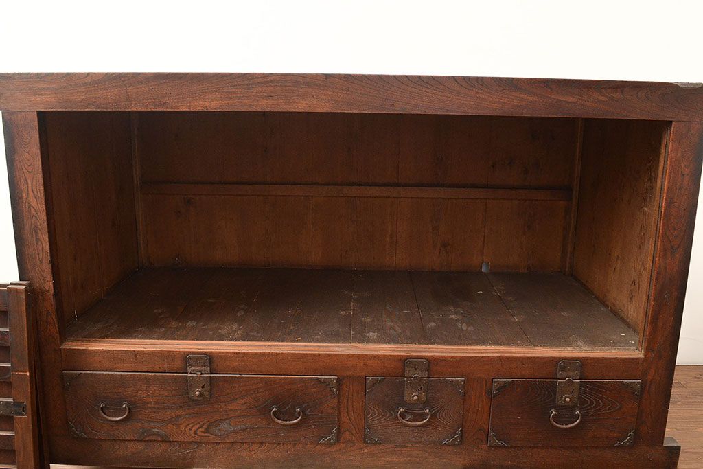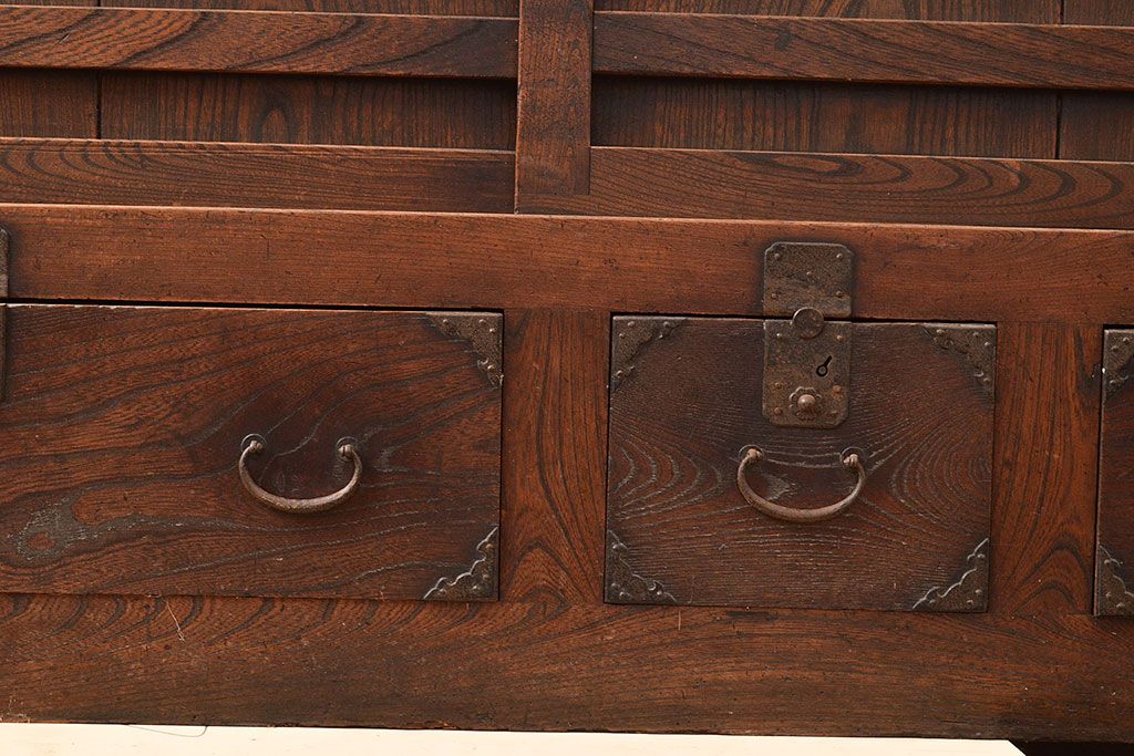 和箪笥 > 和製アンティーク 前面欅(ケヤキ)材 重厚な佇まいの大型帳場箪笥(水屋箪笥、サイドボード、テレビ台、テレビボード)(R-048964)