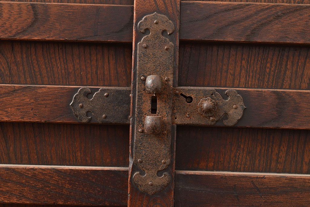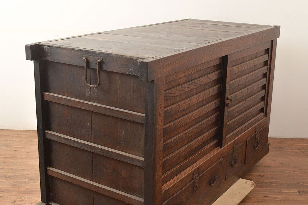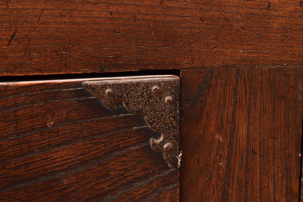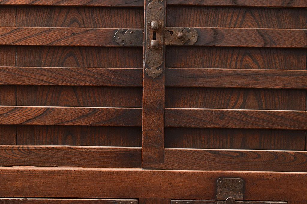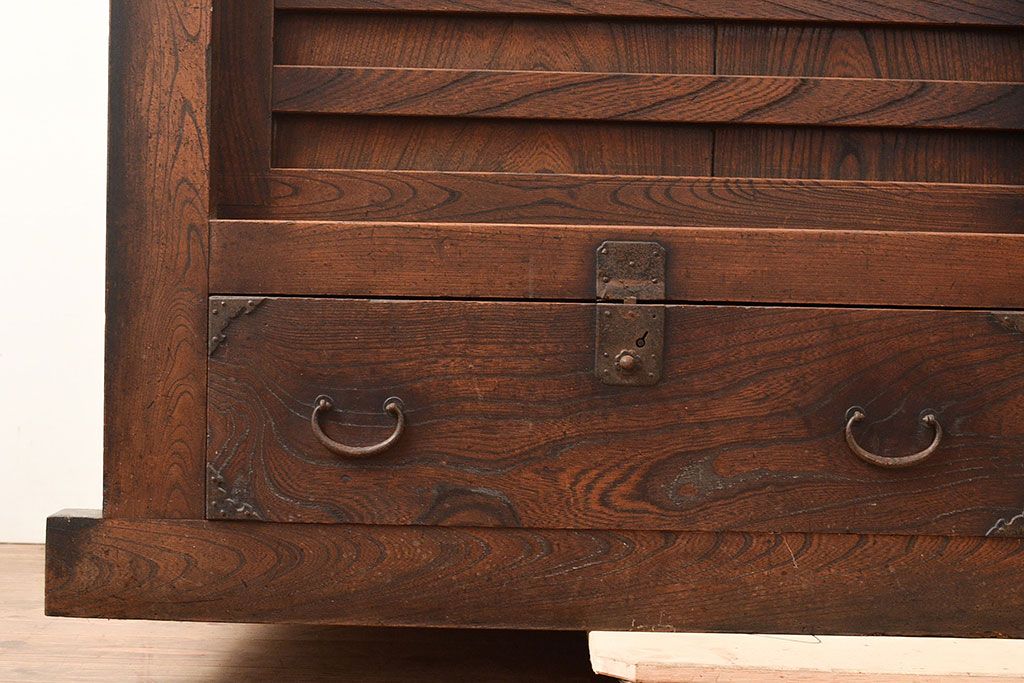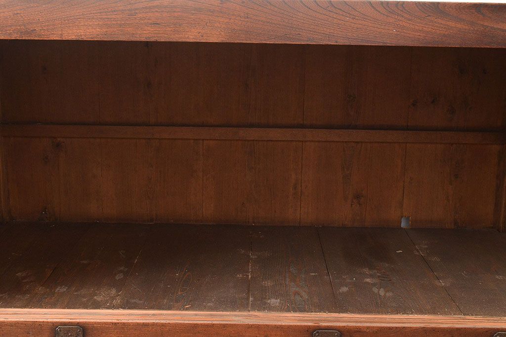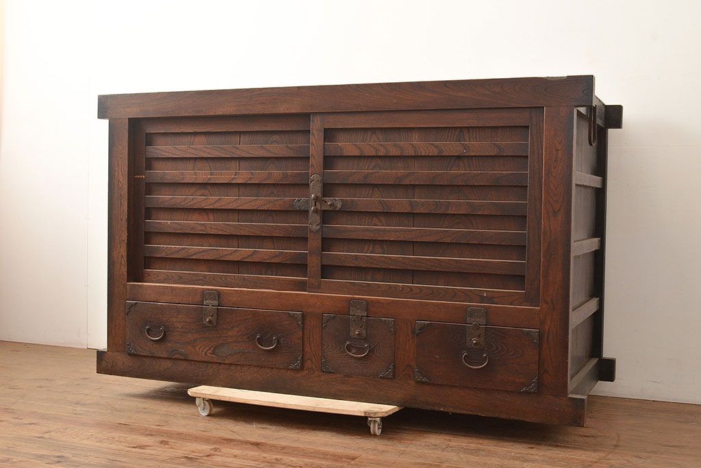 和箪笥 > 和製アンティーク 前面欅(ケヤキ)材 重厚な佇まいの大型帳場箪笥(水屋箪笥、サイドボード、テレビ台、テレビボード)(R-048964)