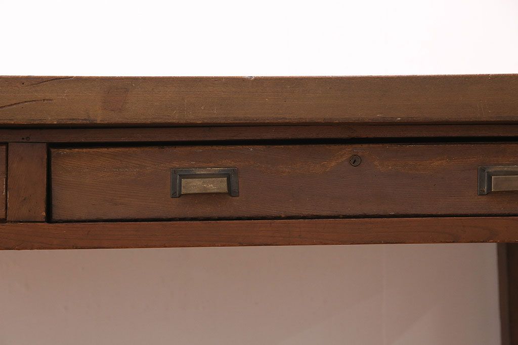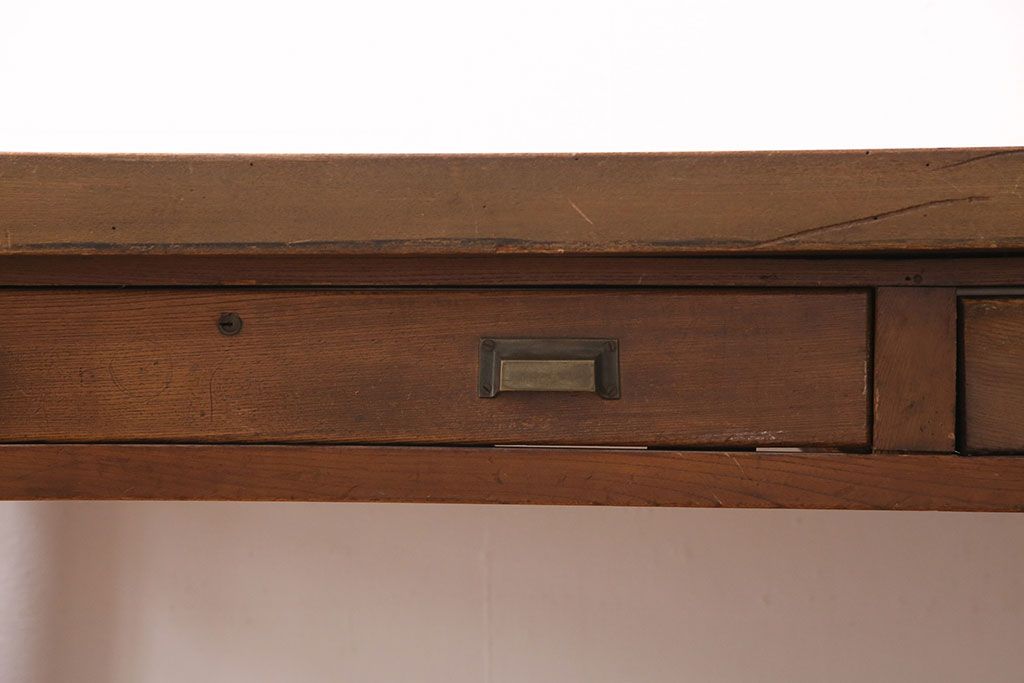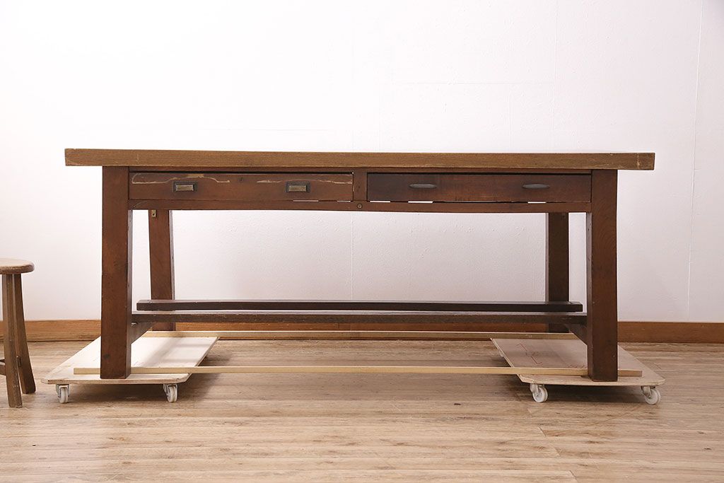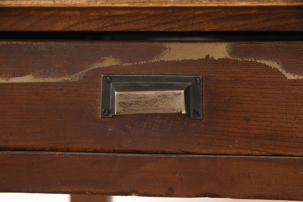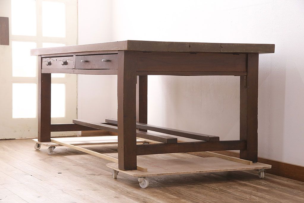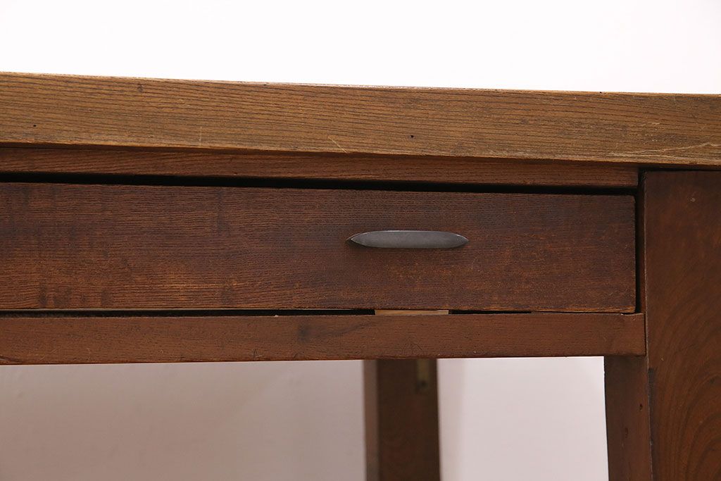 和製アンティーク 特大サイズ 総ケヤキ材 天板極厚!木の味わいが楽しめる引き出し付きの作業台(ダイニングテーブル)(R-048829)