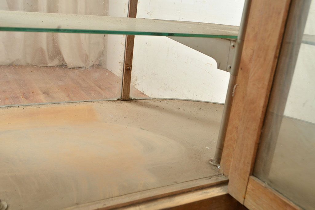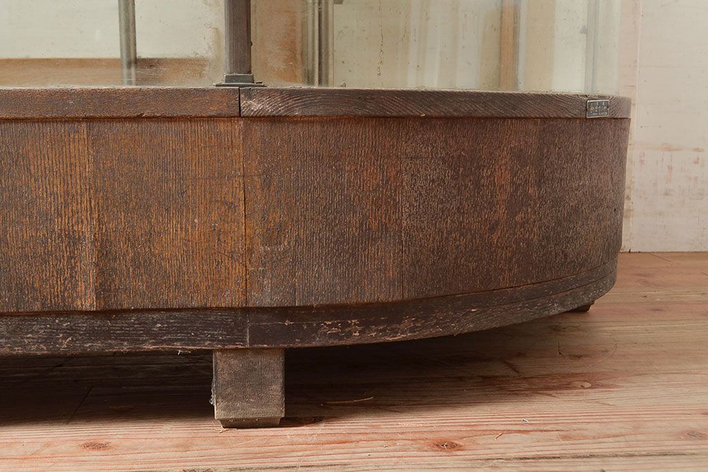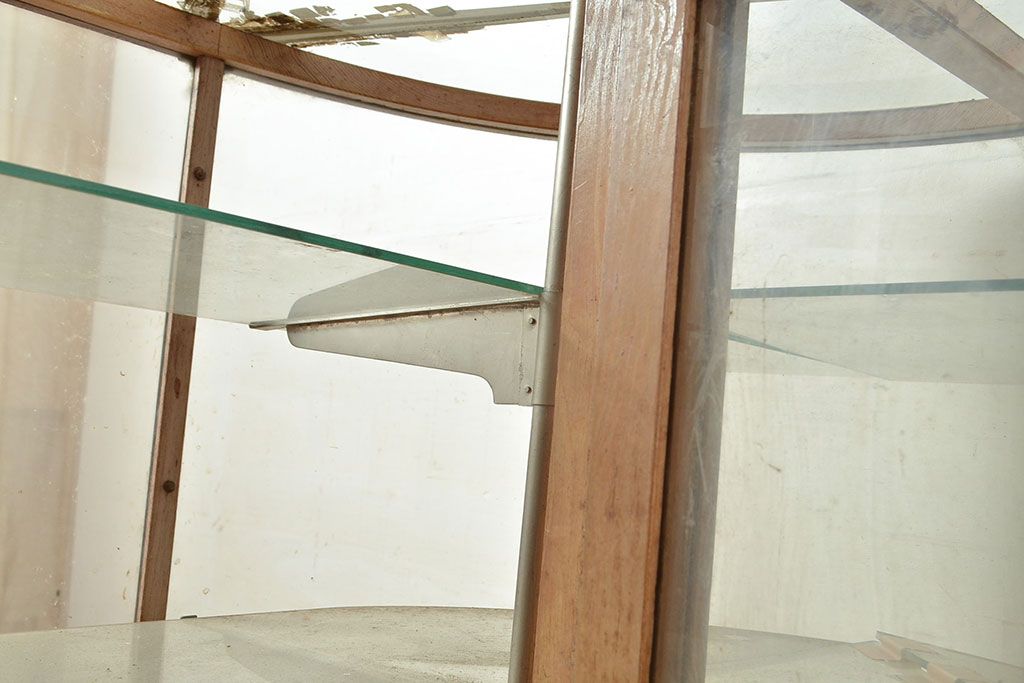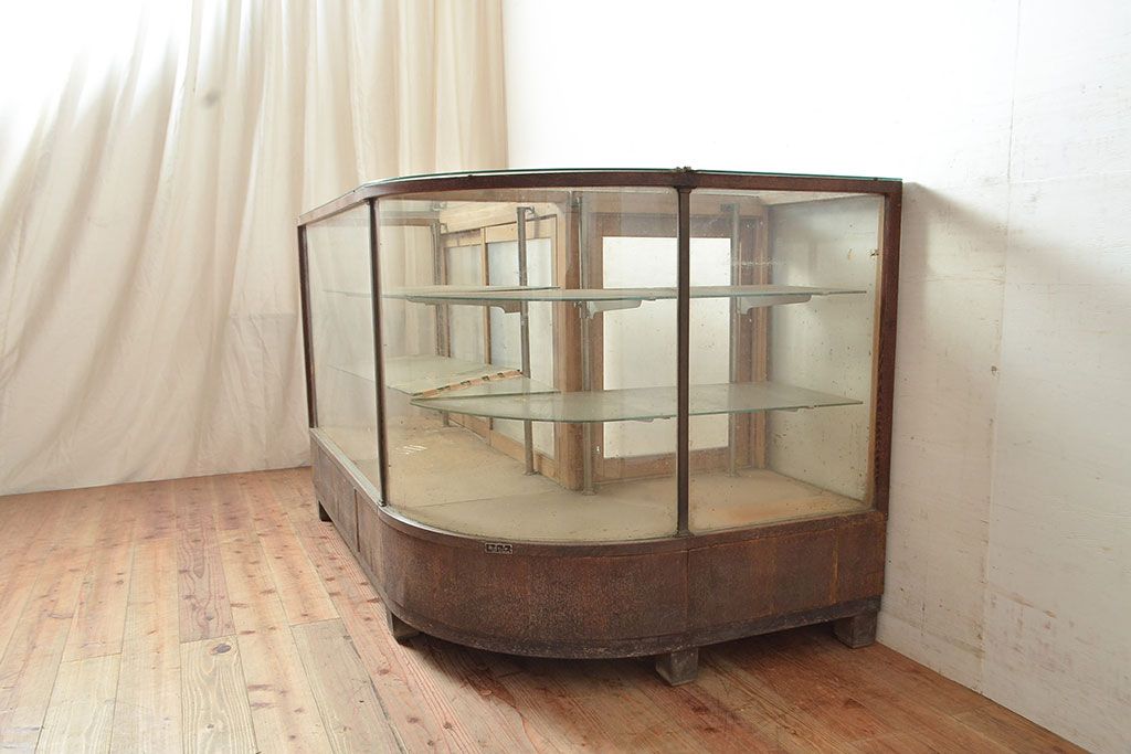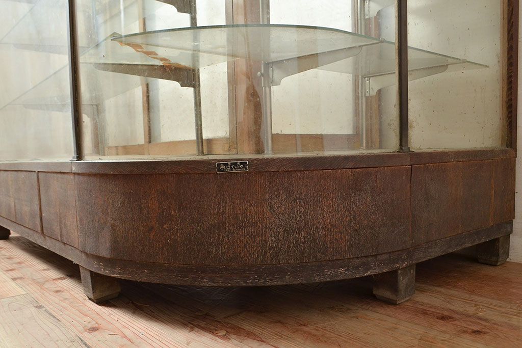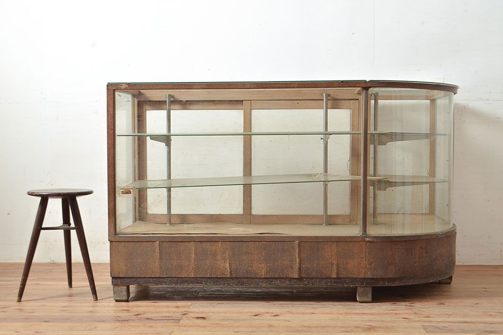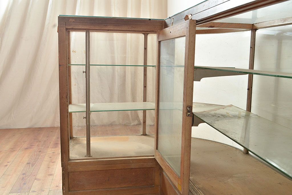 ラフジュ工房> 店舗什器 > 和製アンティーク 昭和中期 ナラ材製のR型ガラスケース(ショーケース、曲げガラス、L型ガラスケース、Rガラス、店舗什器、陳列棚)(R-049093)