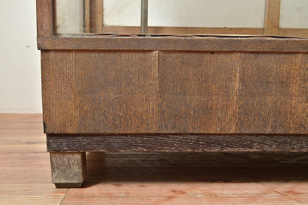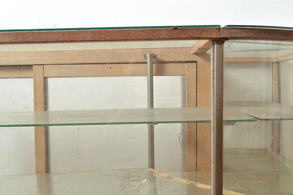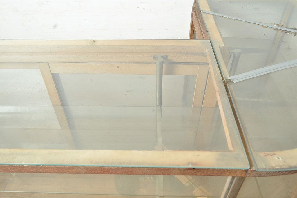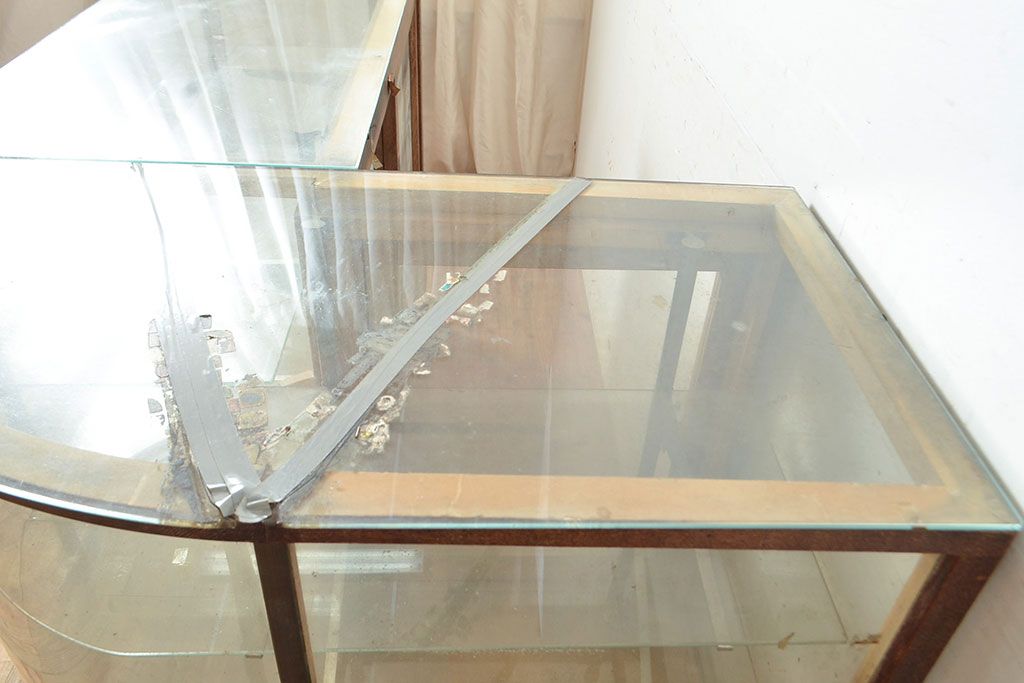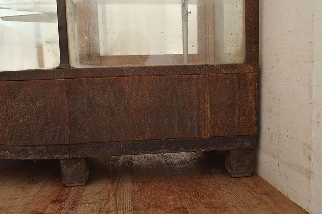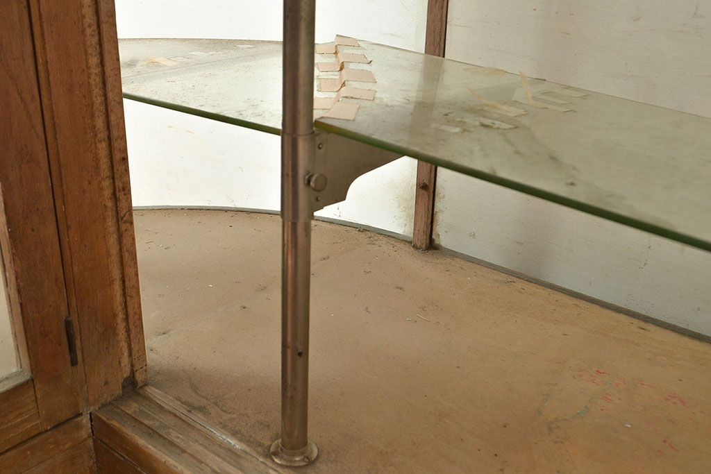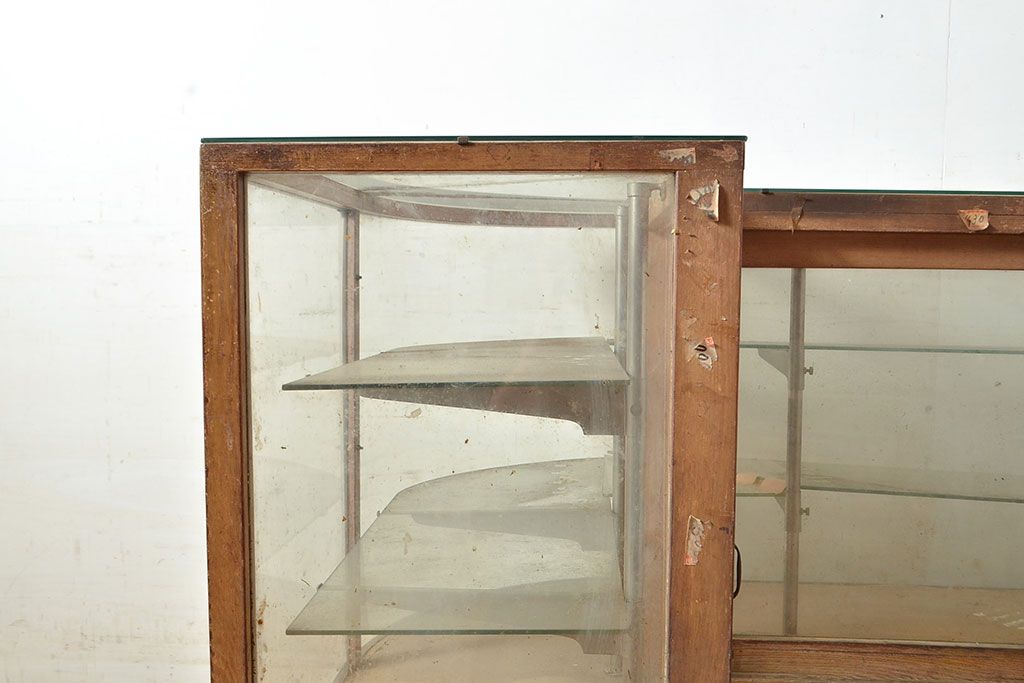 ラフジュ工房> 店舗什器 > 和製アンティーク 昭和中期 ナラ材製のR型ガラスケース(ショーケース、曲げガラス、L型ガラスケース、Rガラス、店舗什器、陳列棚)(R-049093)