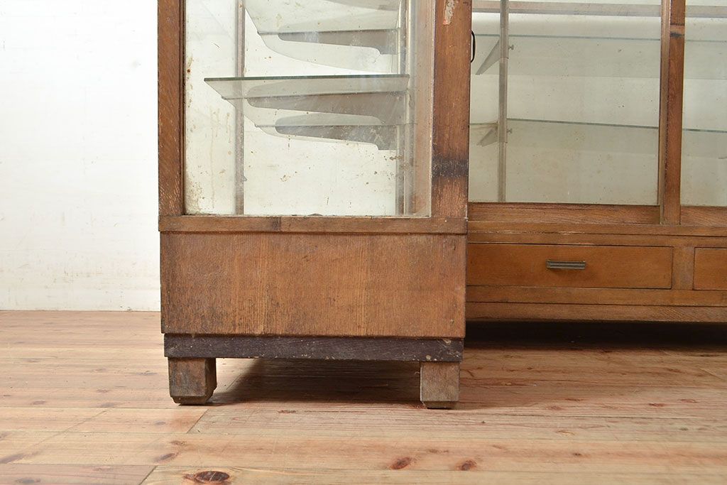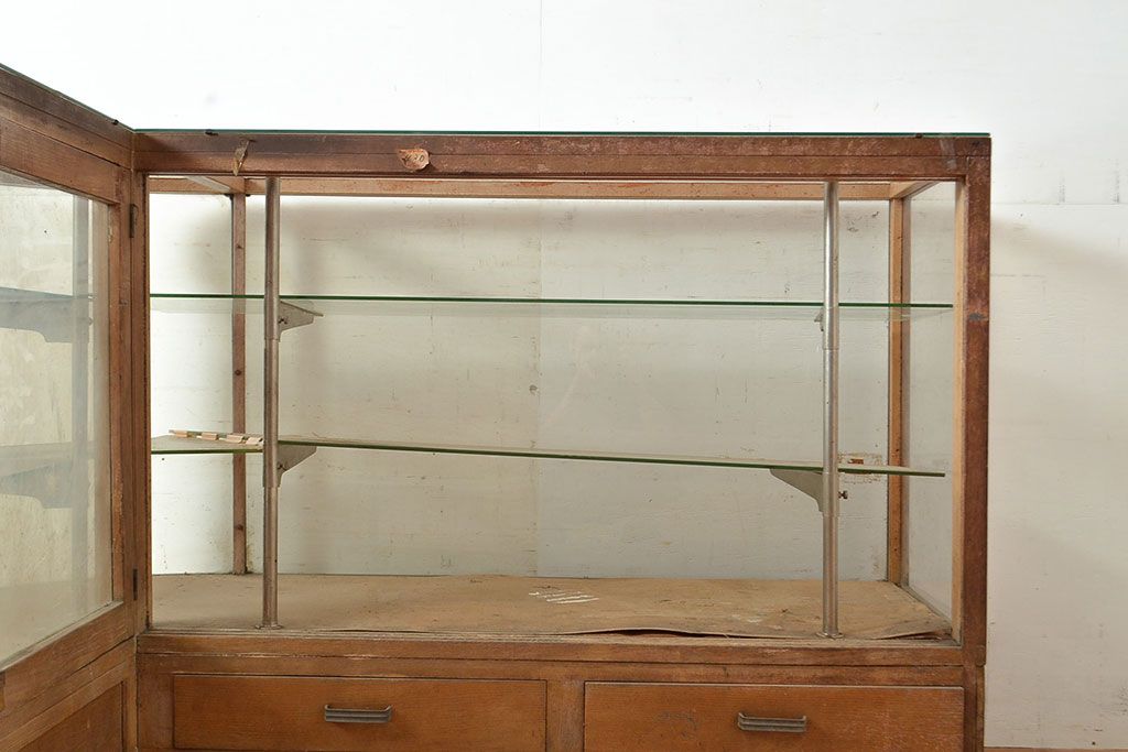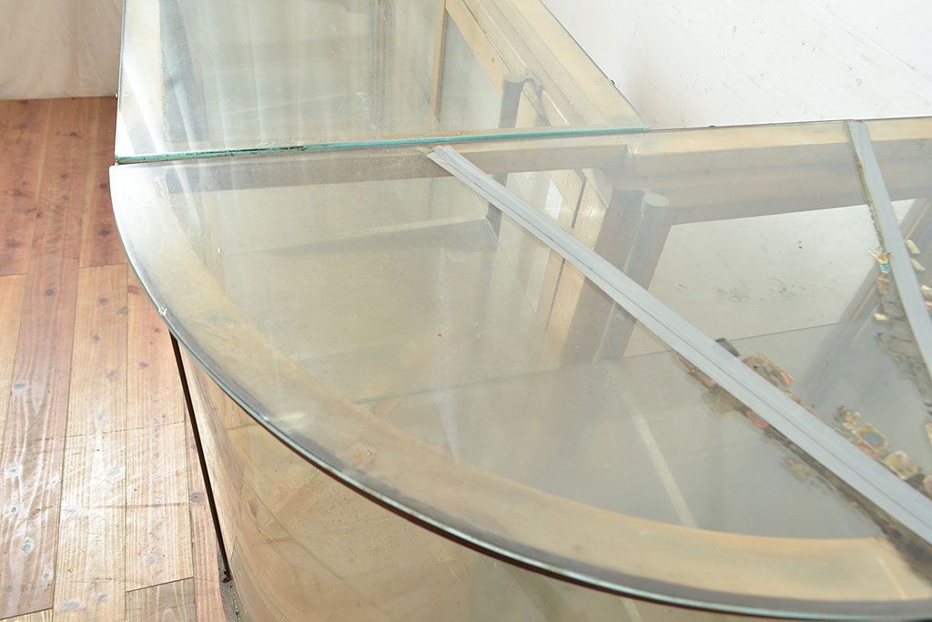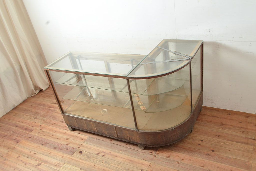 ラフジュ工房> ガラスケース・ショーケース> カウンターショーケース > 和製アンティーク 昭和中期 ナラ材製のR型ガラスケース(ショーケース、曲げガラス、L型ガラスケース、Rガラス、店舗什器、陳列棚)(R-049093)