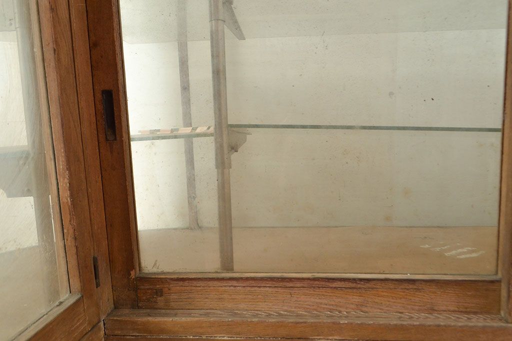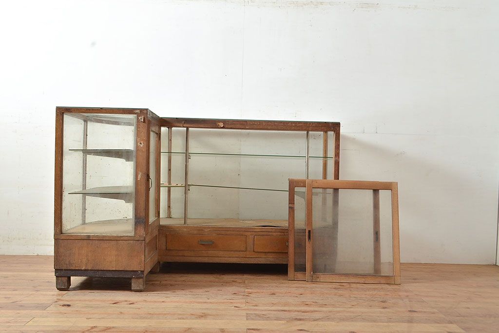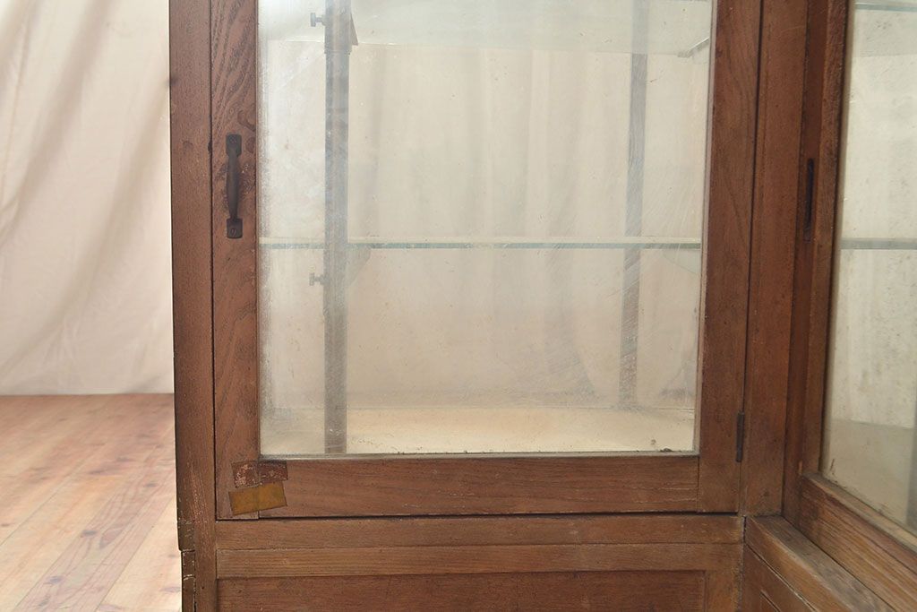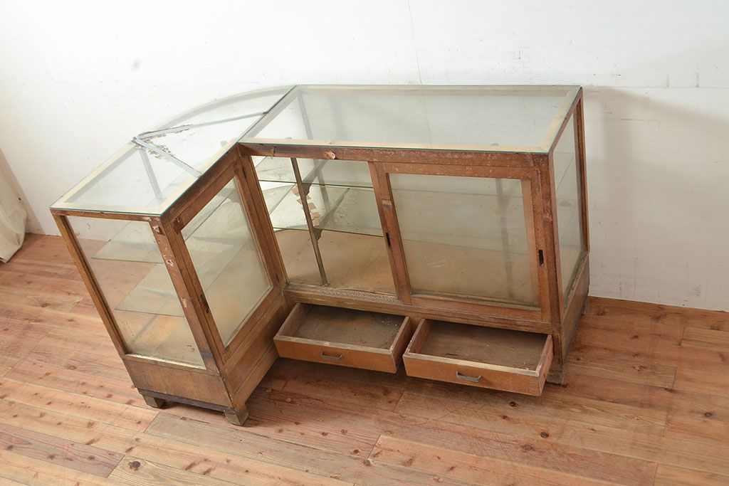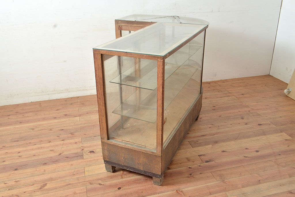 ラフジュ工房> ガラスケース・ショーケース> L型ショーケース > 和製アンティーク 昭和中期 ナラ材製のR型ガラスケース(ショーケース、曲げガラス、L型ガラスケース、Rガラス、店舗什器、陳列棚)(R-049093)