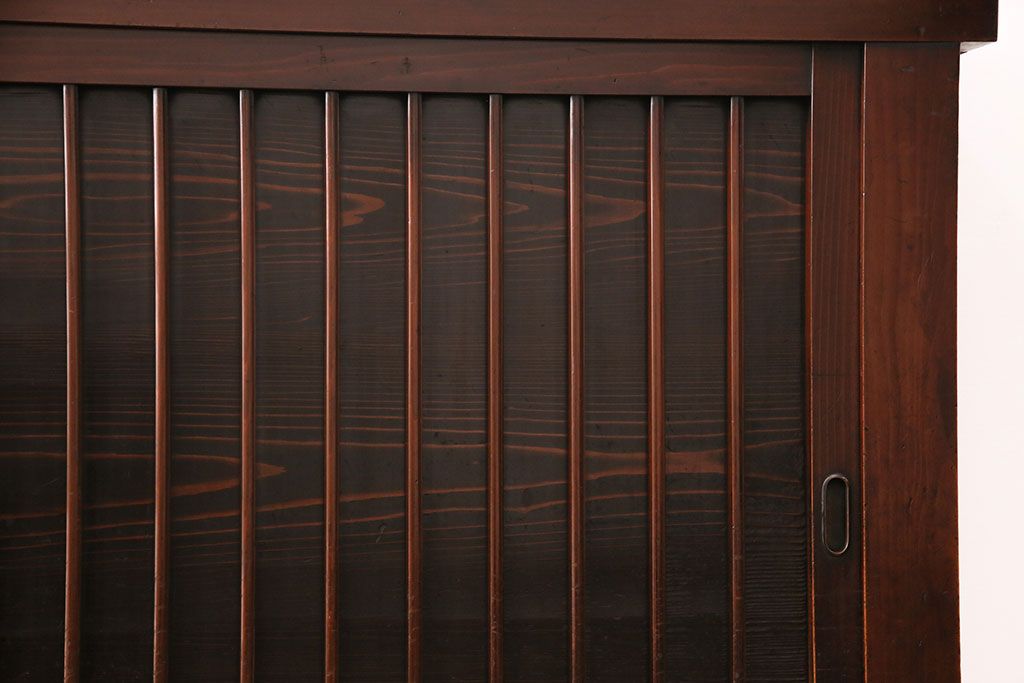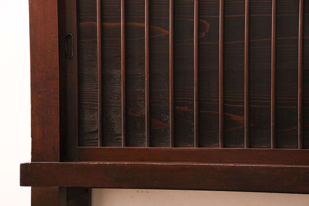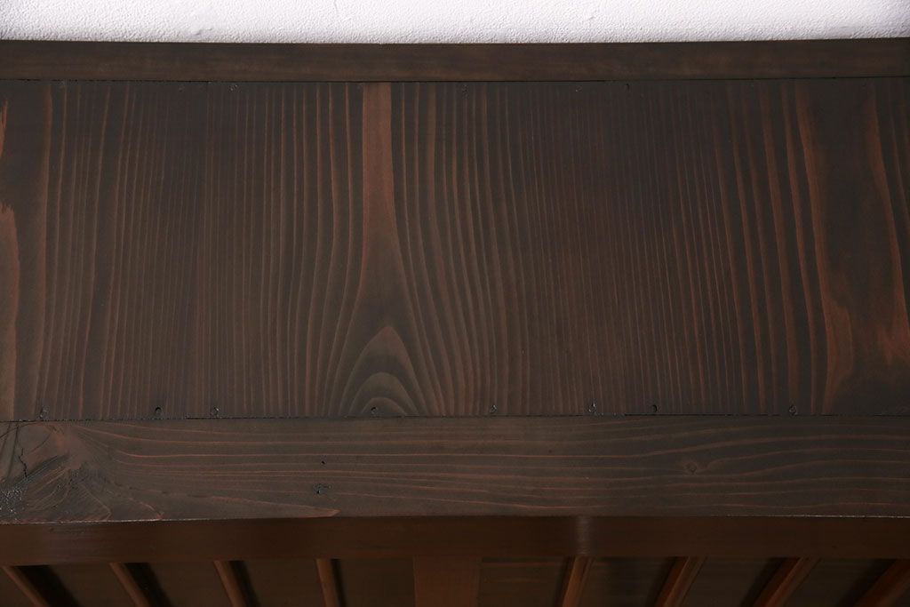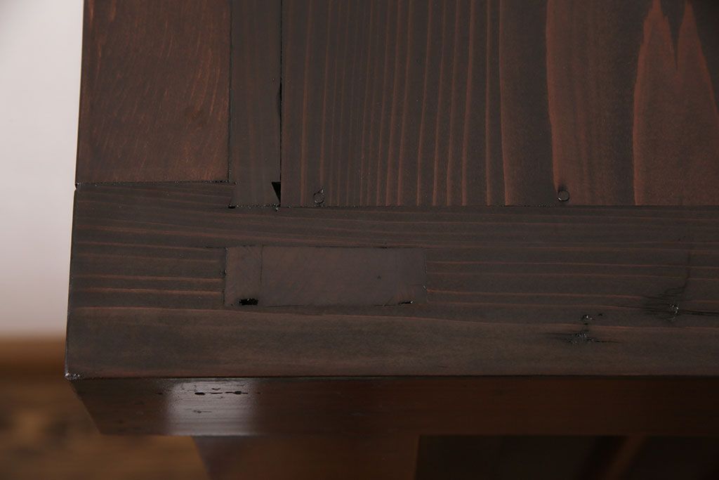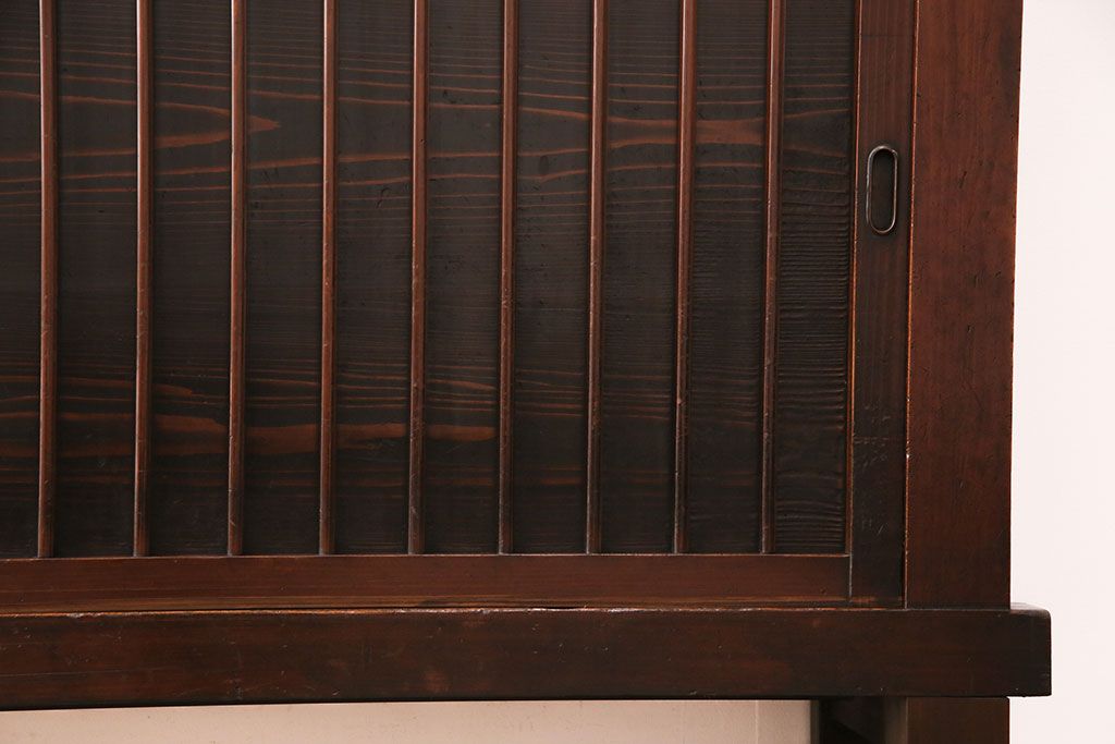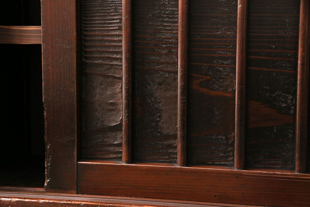 和箪笥> 水屋箪笥 > 明治期の水屋箪笥をリペア&カスタム!収納部をセパレートさせ、棚板を新たに製作。框の耳の間を埋め木加工した天板を取り付け。1トーン落ち着いた色味に着色し仕上げ。(収納棚、戸棚、食器棚、下駄箱)