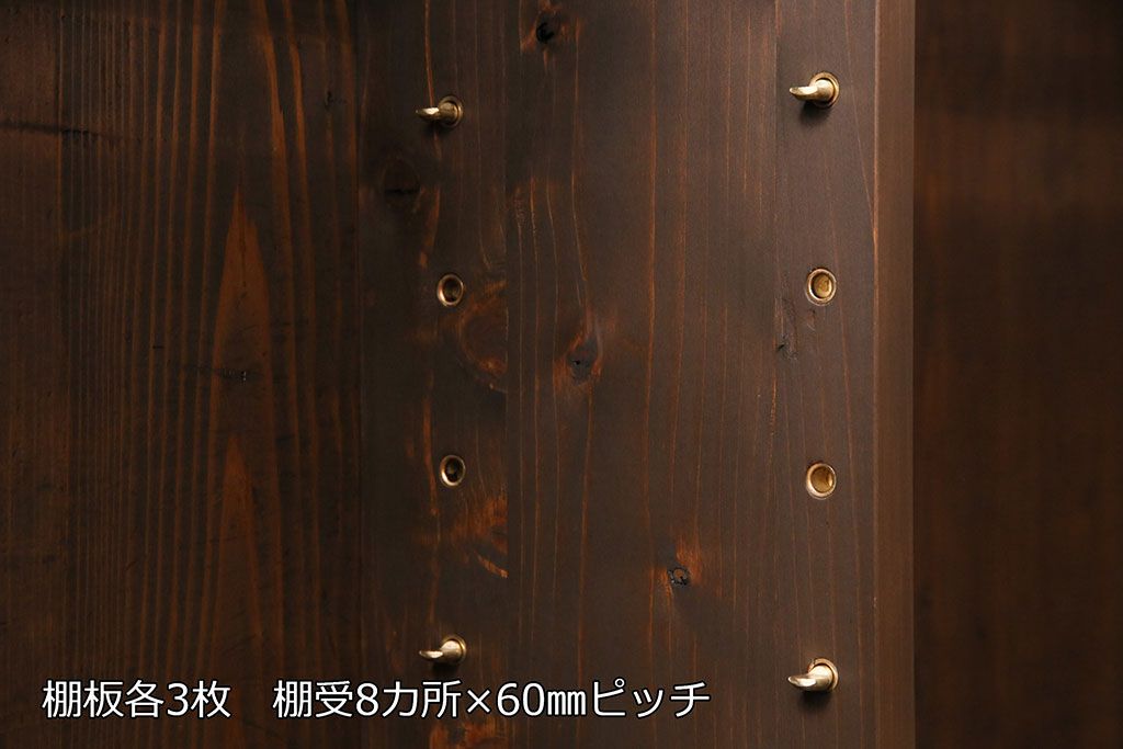 棚板は取り外しできます。棚板は各3枚あります。棚受けは8ヶ所、60mmピッチで調整できます。棚幅サイズのものが1枚の作りです。