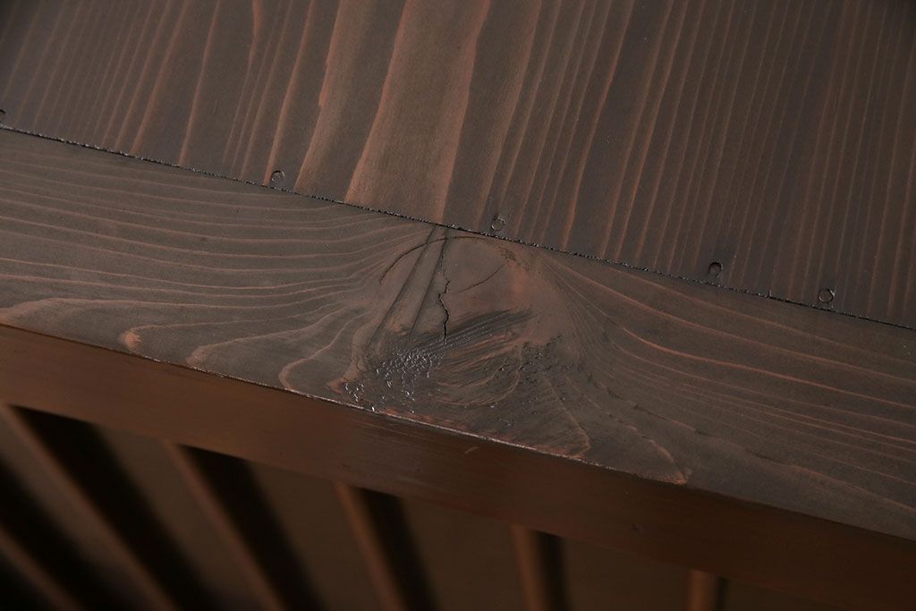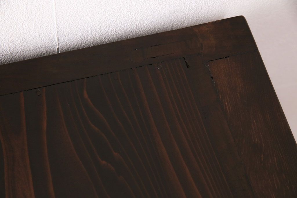 セミオーダー家具実績 > 明治期の水屋箪笥をリペア&カスタム!収納部をセパレートさせ、棚板を新たに製作。框の耳の間を埋め木加工した天板を取り付け。1トーン落ち着いた色味に着色し仕上げ。(収納棚、戸棚、食器棚、下駄箱)