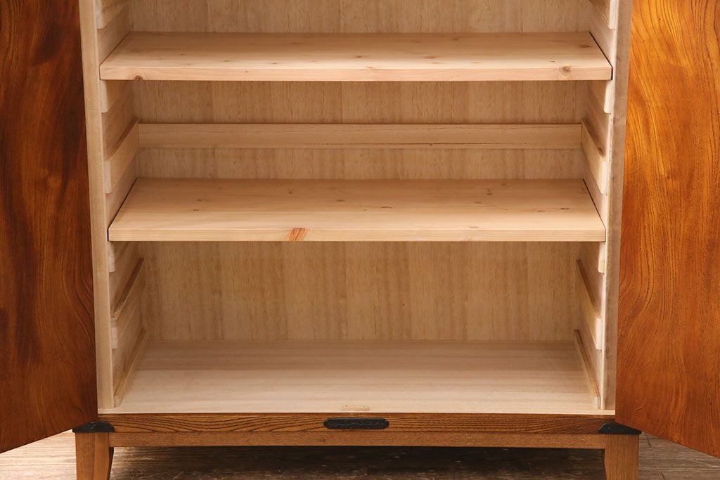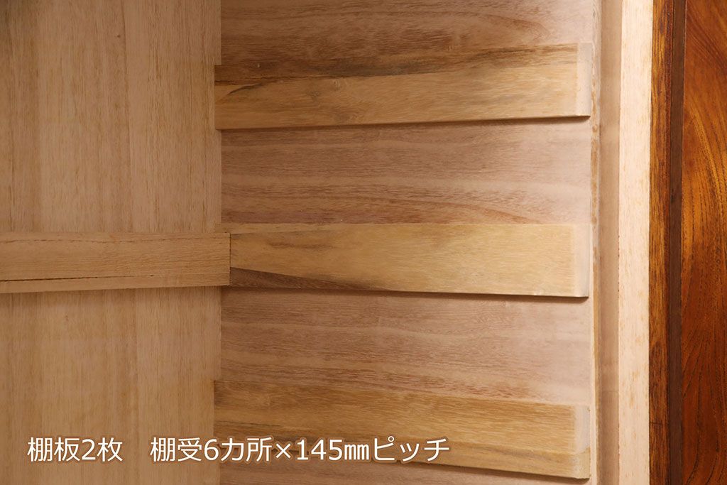 棚板は取り外しできます。棚板は2枚あります。棚受けは6ヶ所、145mmピッチで調整できます。棚幅サイズのものが1枚の作りです。