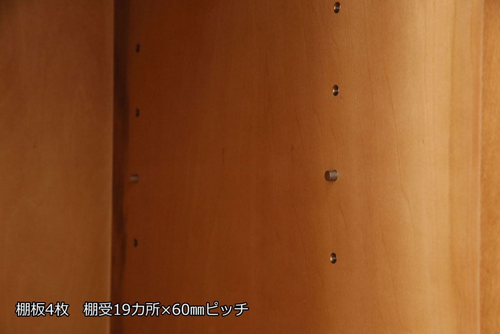 棚板は取り外しできます。棚板は4枚あります。棚受けは19ヶ所、60mmピッチで調整できます。棚幅サイズのものが1枚の作りです。
